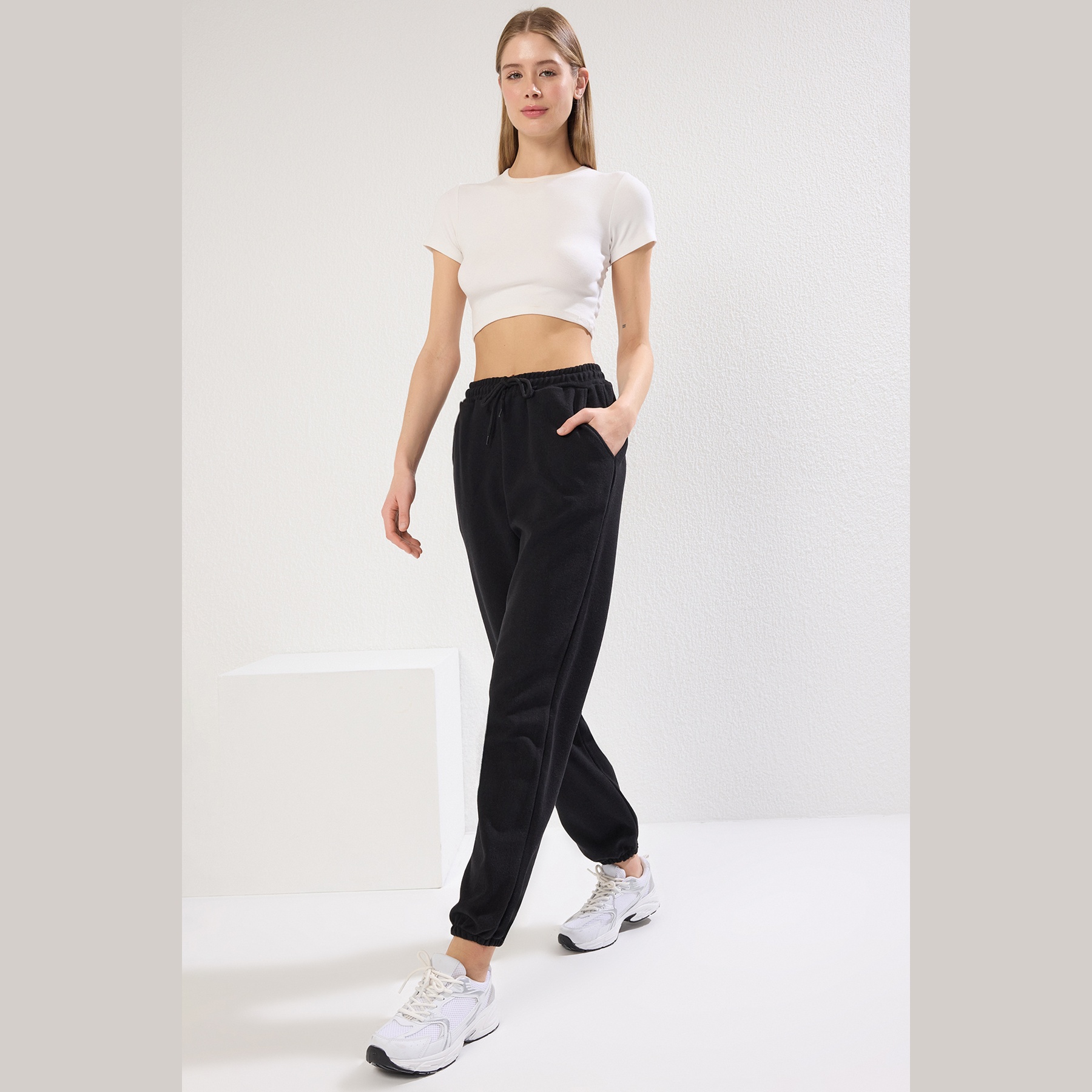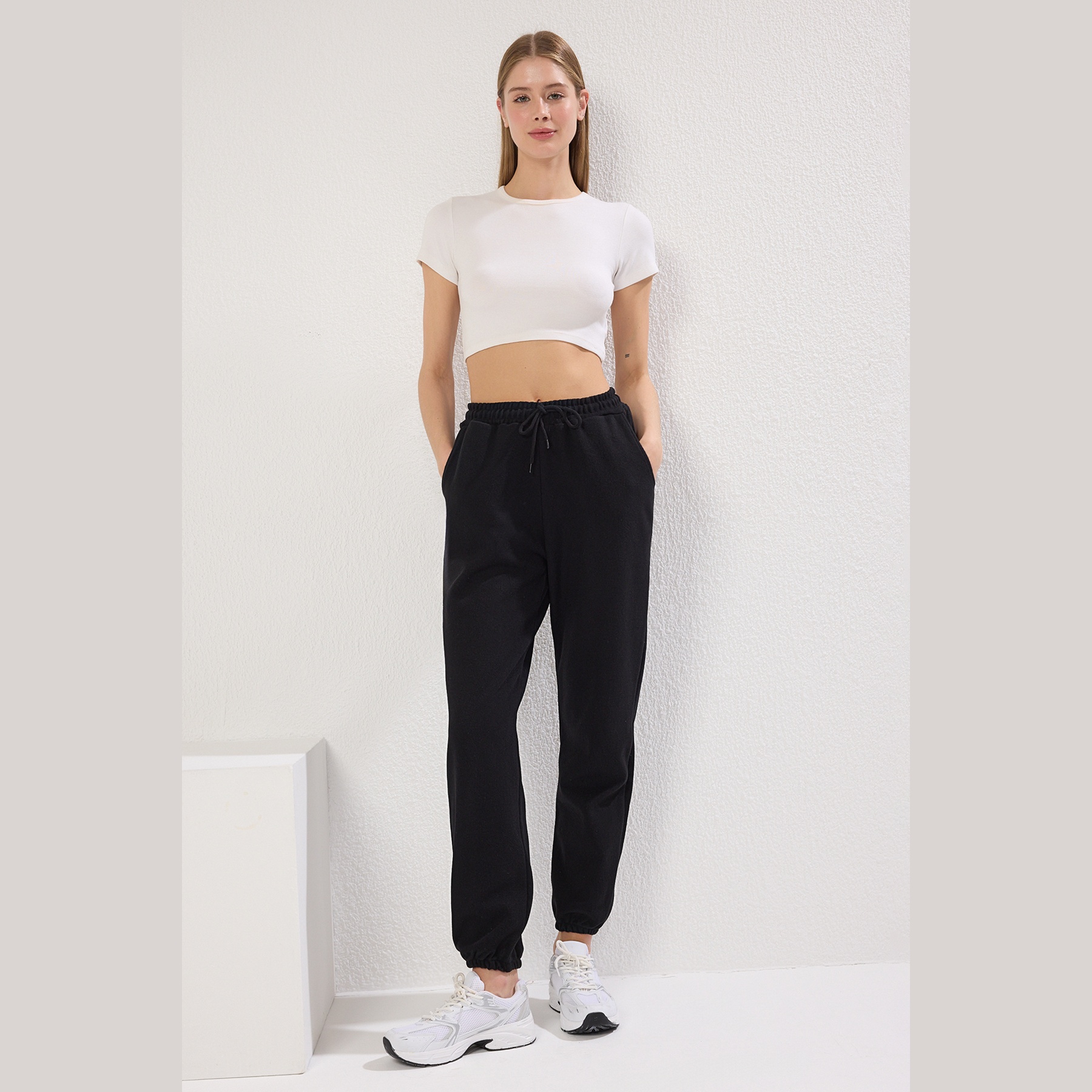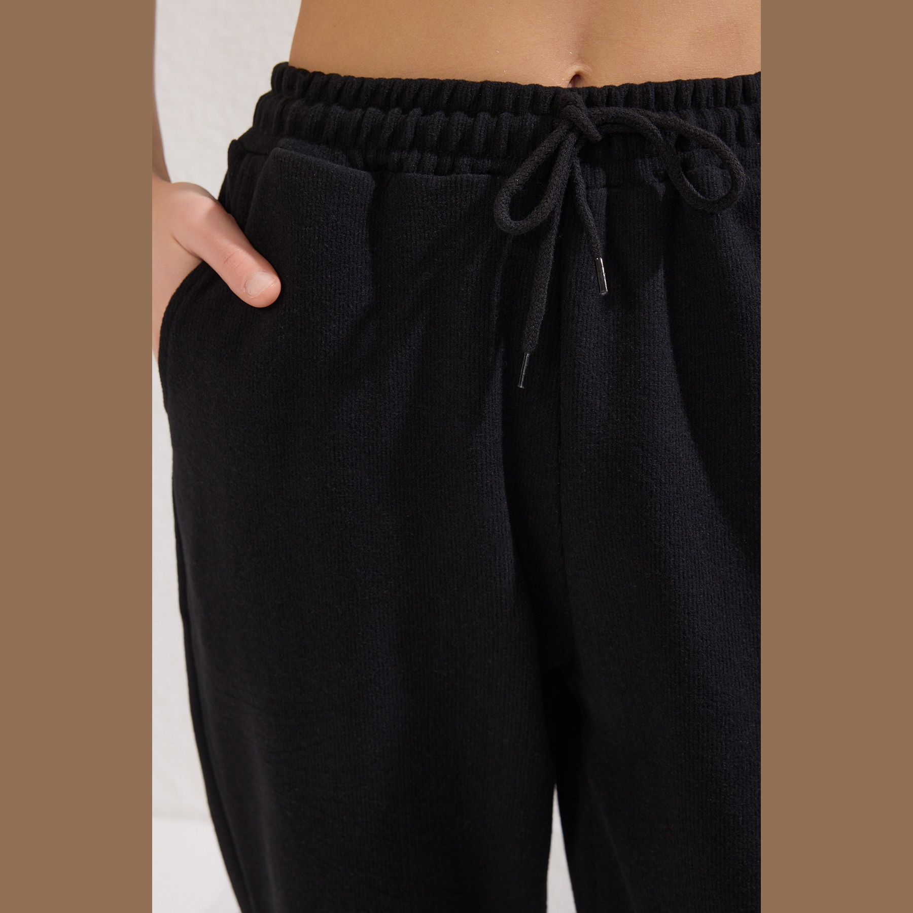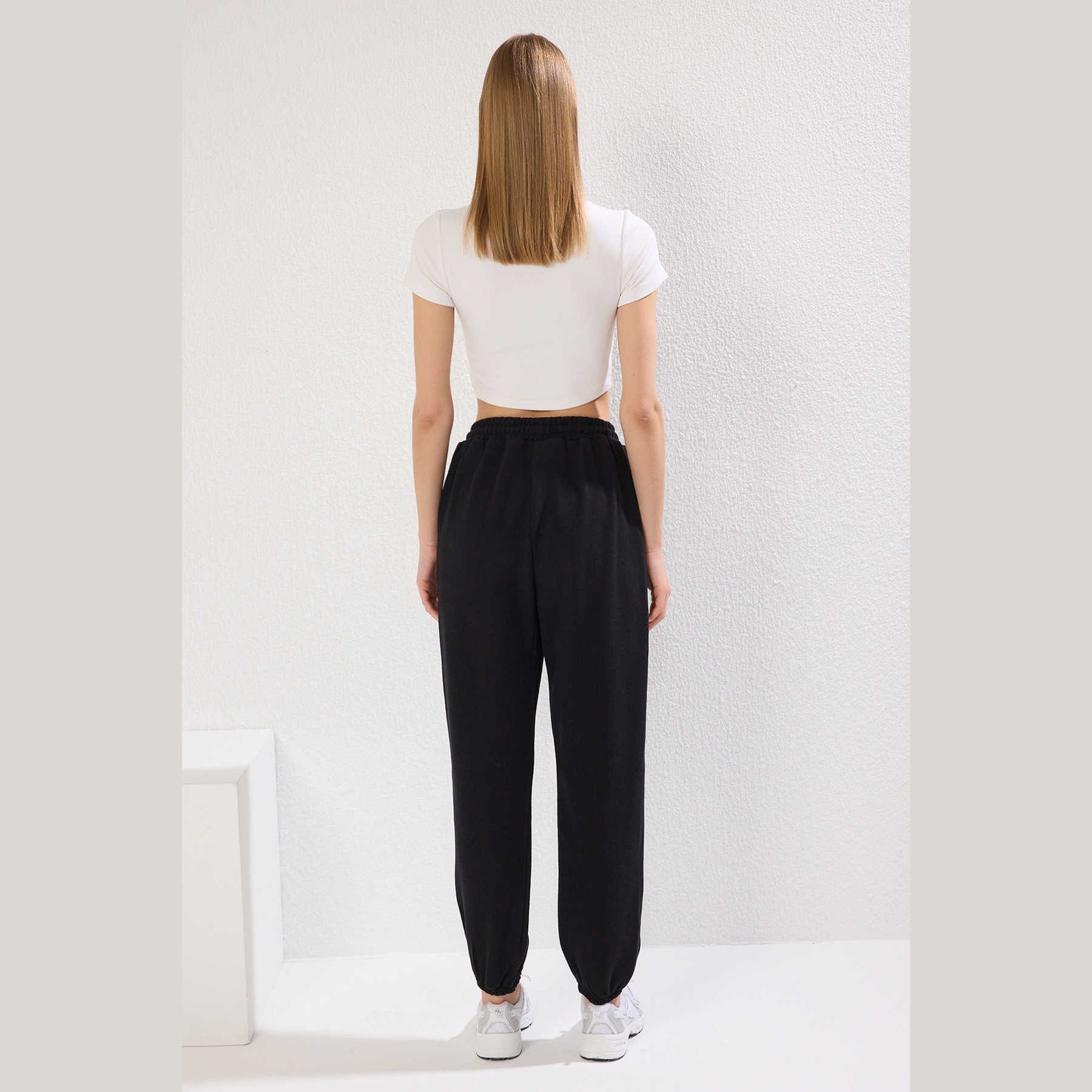 بنطال رياضي نسائي – أسود بخامة سيلانيك، قصة مريحة وجيوب عملية (Selanik Relaxed Fit)