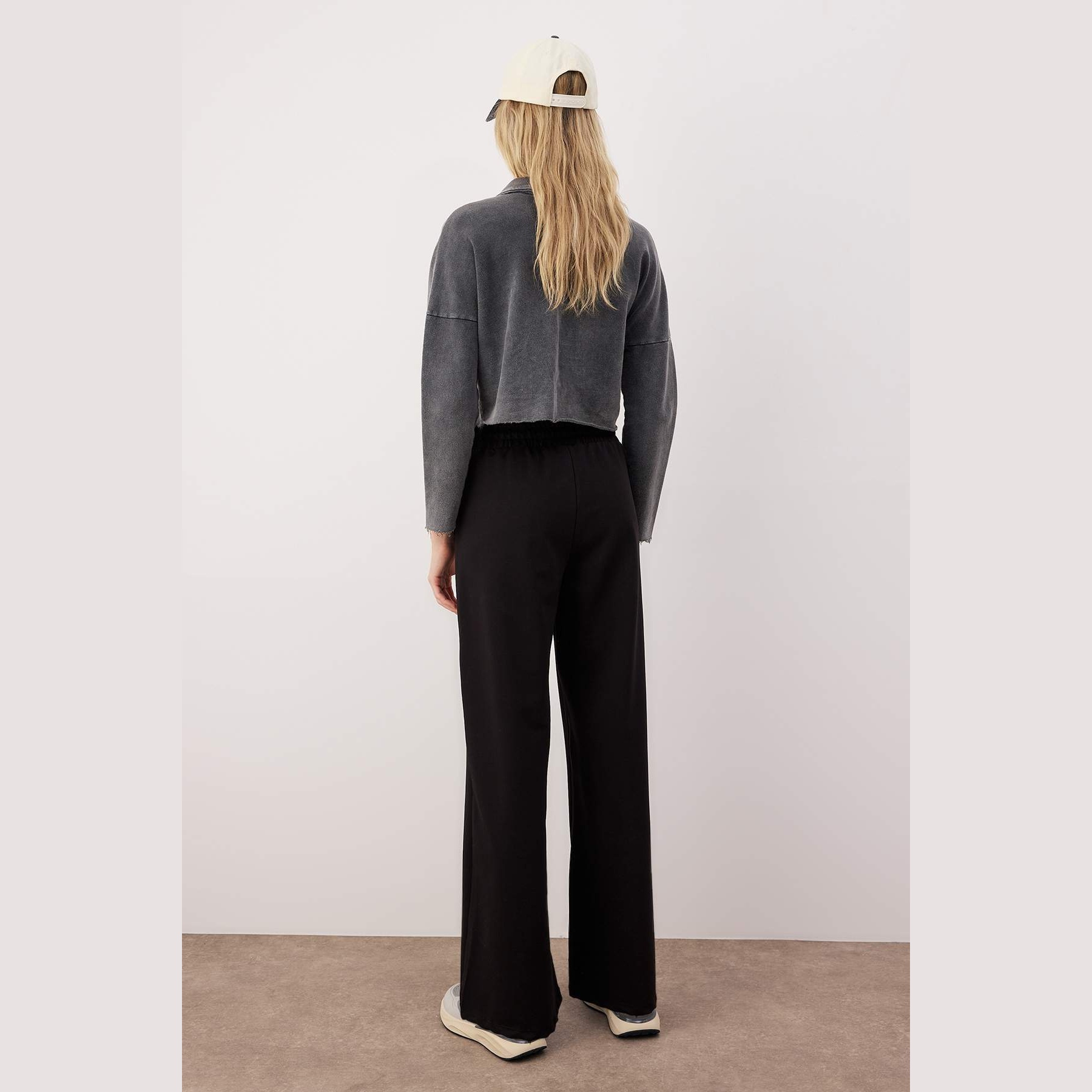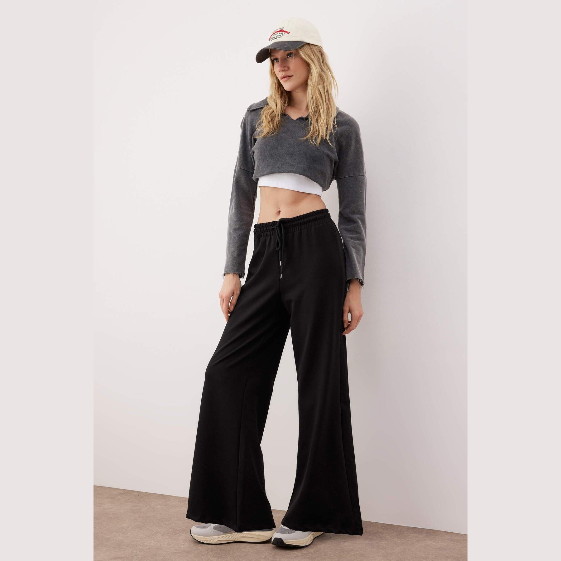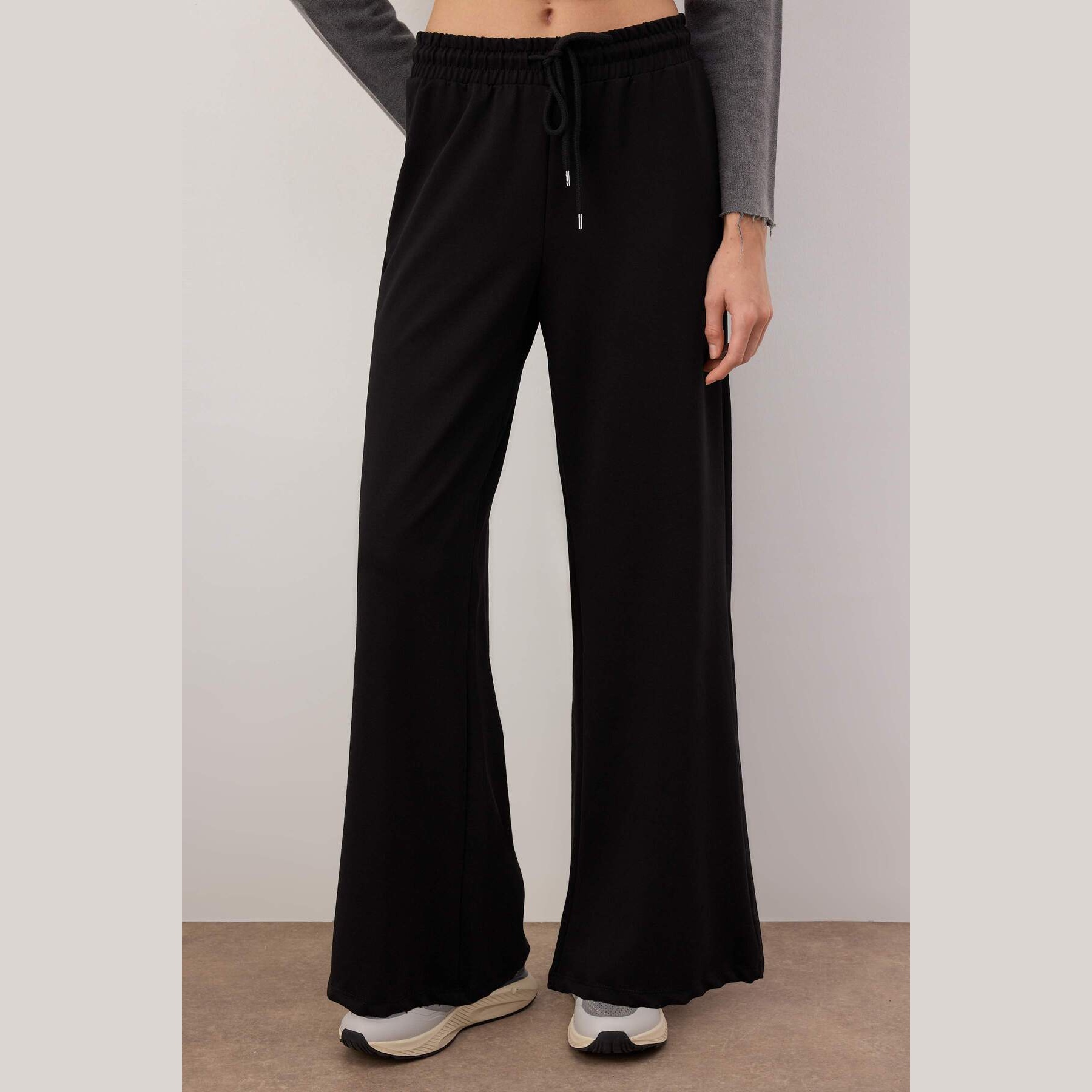 بنطال رياضي نسائي بلون أسود كلاسيكي، مصنوع من قماش محبوك خفيف بنسبة 74% قطن، 21% بوليستر، و5% إيلاستان، يتميز بقصة واسعة من الأرجل (Wide-Leg)، خصر عادي، وتصميم مريح مثالي للإطلالات اليومية أو الكاجوال في جميع المواسم.