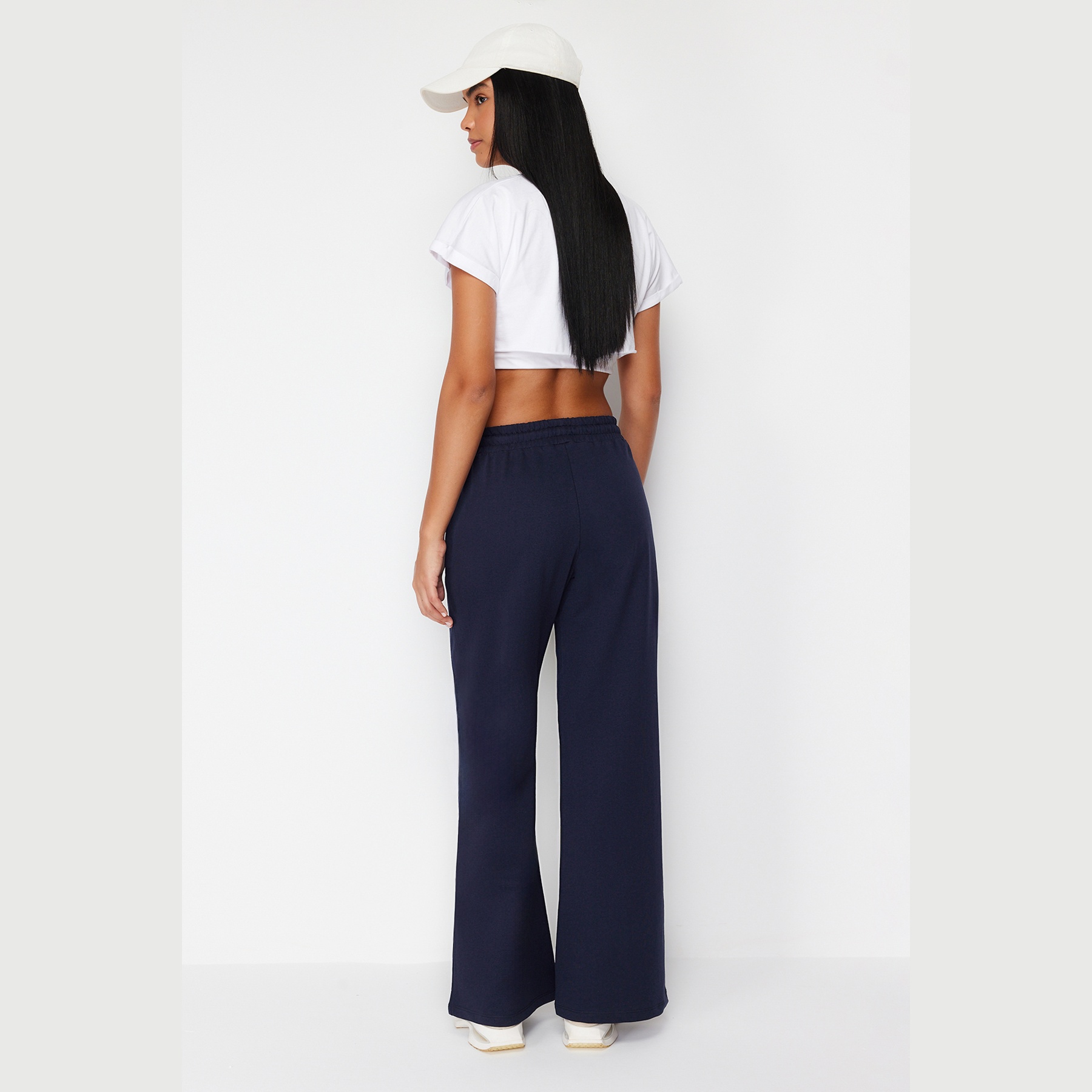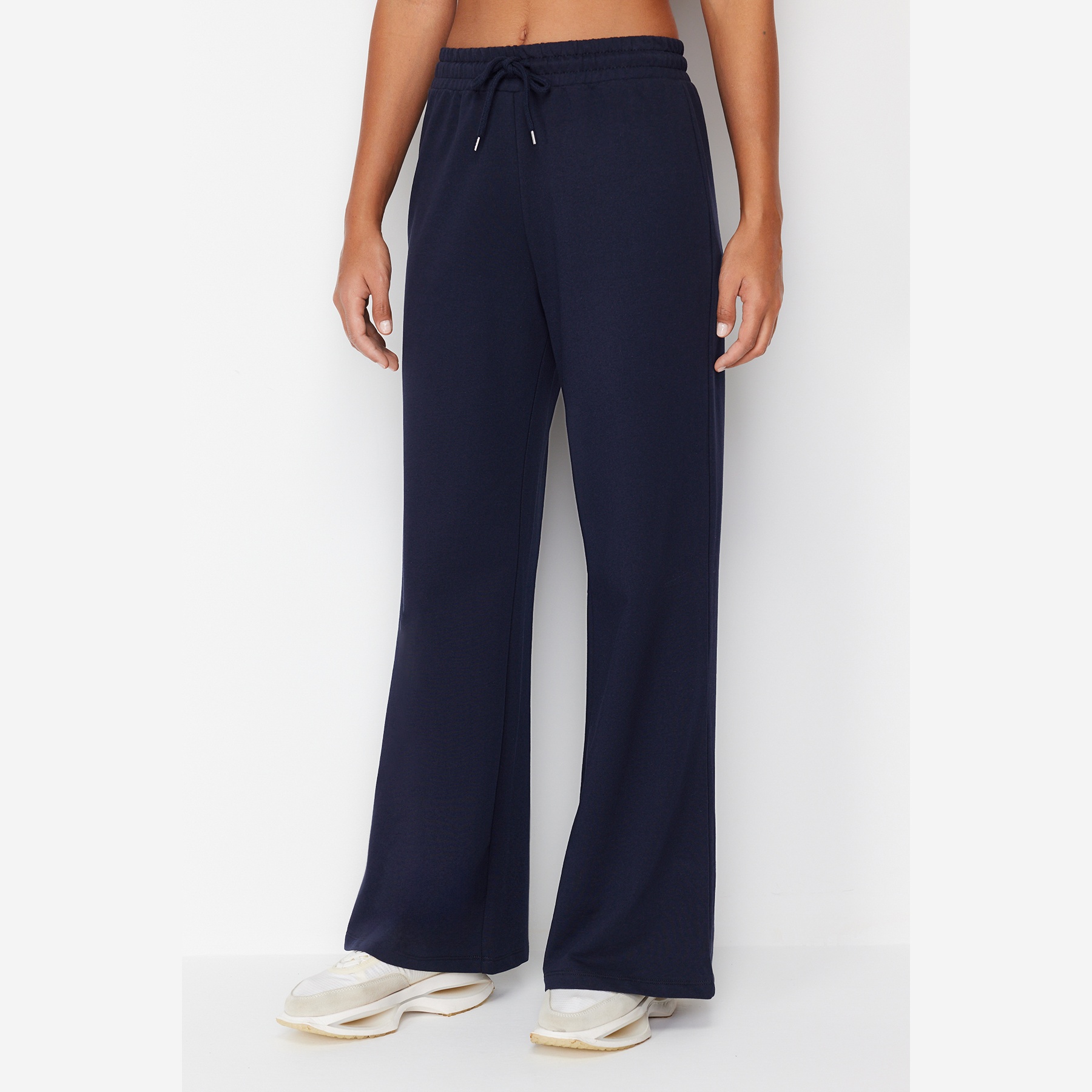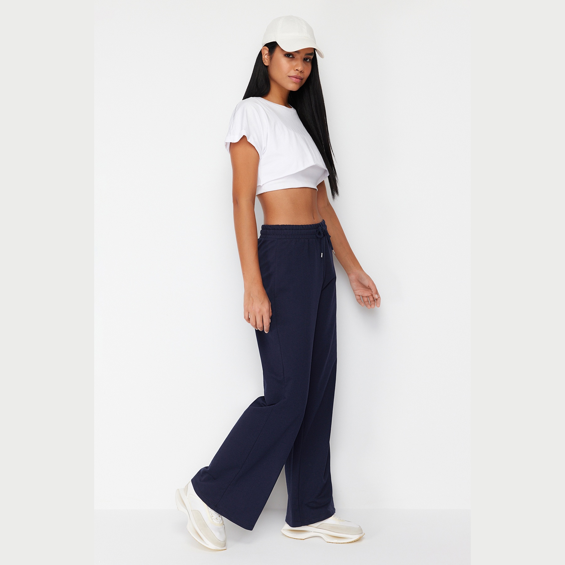 بنطال رياضي نسائي بلون كحلي داكن أنيق، مصنوع من قماش محبوك خفيف بنسبة 74% قطن، 21% بوليستر، و5% إيلاستان، يتميز بقصة واسعة من الأرجل (Wide-Leg)، خصر عادي، وتصميم مريح مثالي للإطلالات اليومية أو الكاجوال في جميع المواسم.