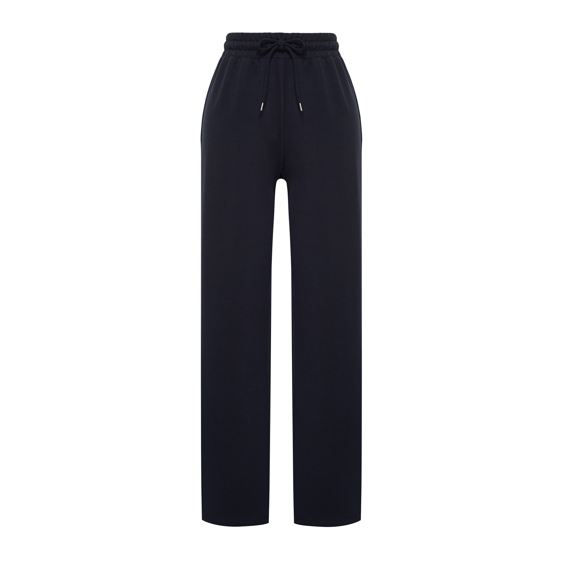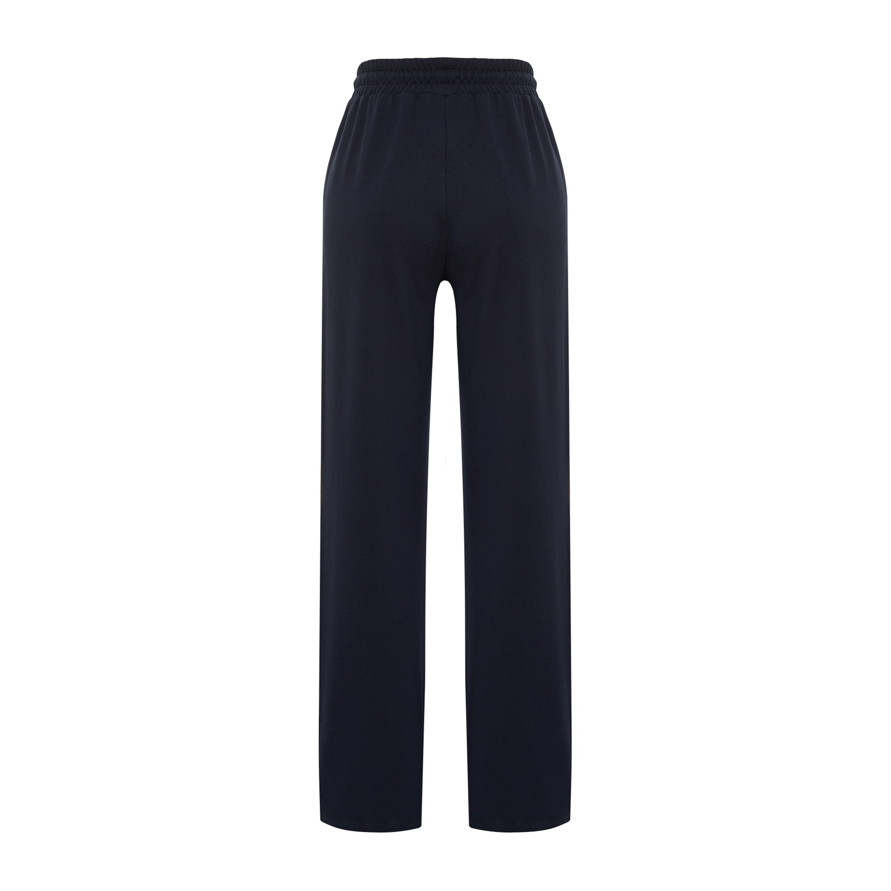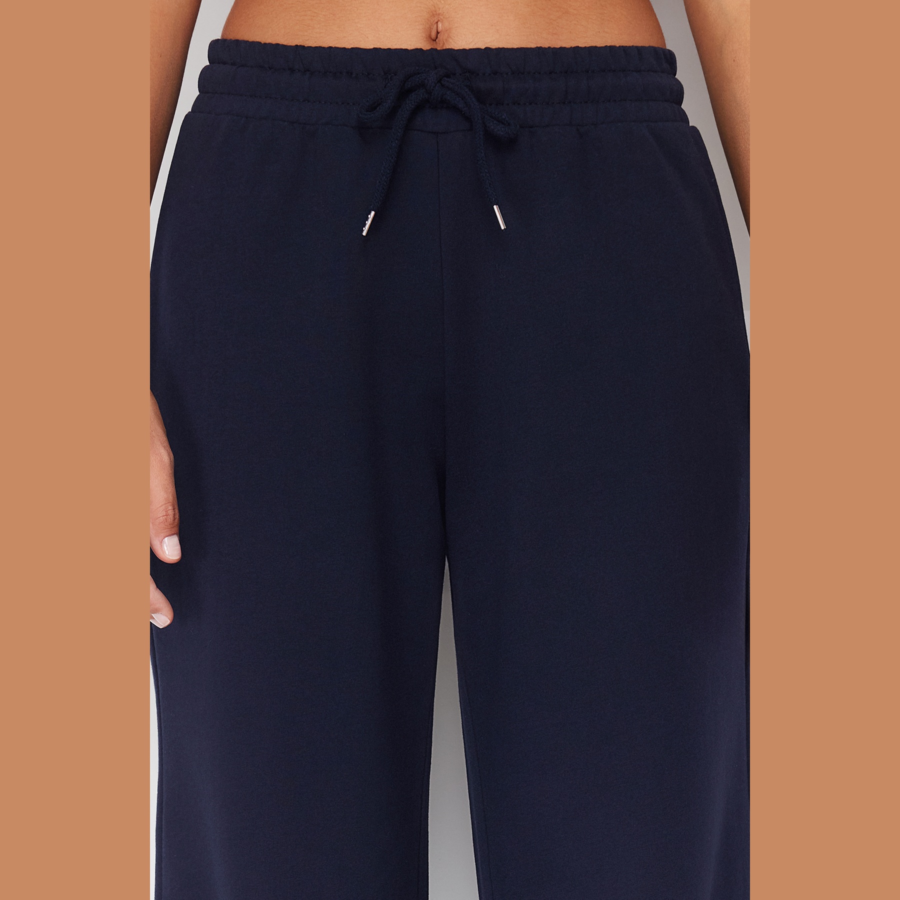 بنطال رياضي نسائي بلون كحلي داكن أنيق، مصنوع من قماش محبوك خفيف بنسبة 74% قطن، 21% بوليستر، و5% إيلاستان، يتميز بقصة واسعة من الأرجل (Wide-Leg)، خصر عادي، وتصميم مريح مثالي للإطلالات اليومية أو الكاجوال في جميع المواسم.