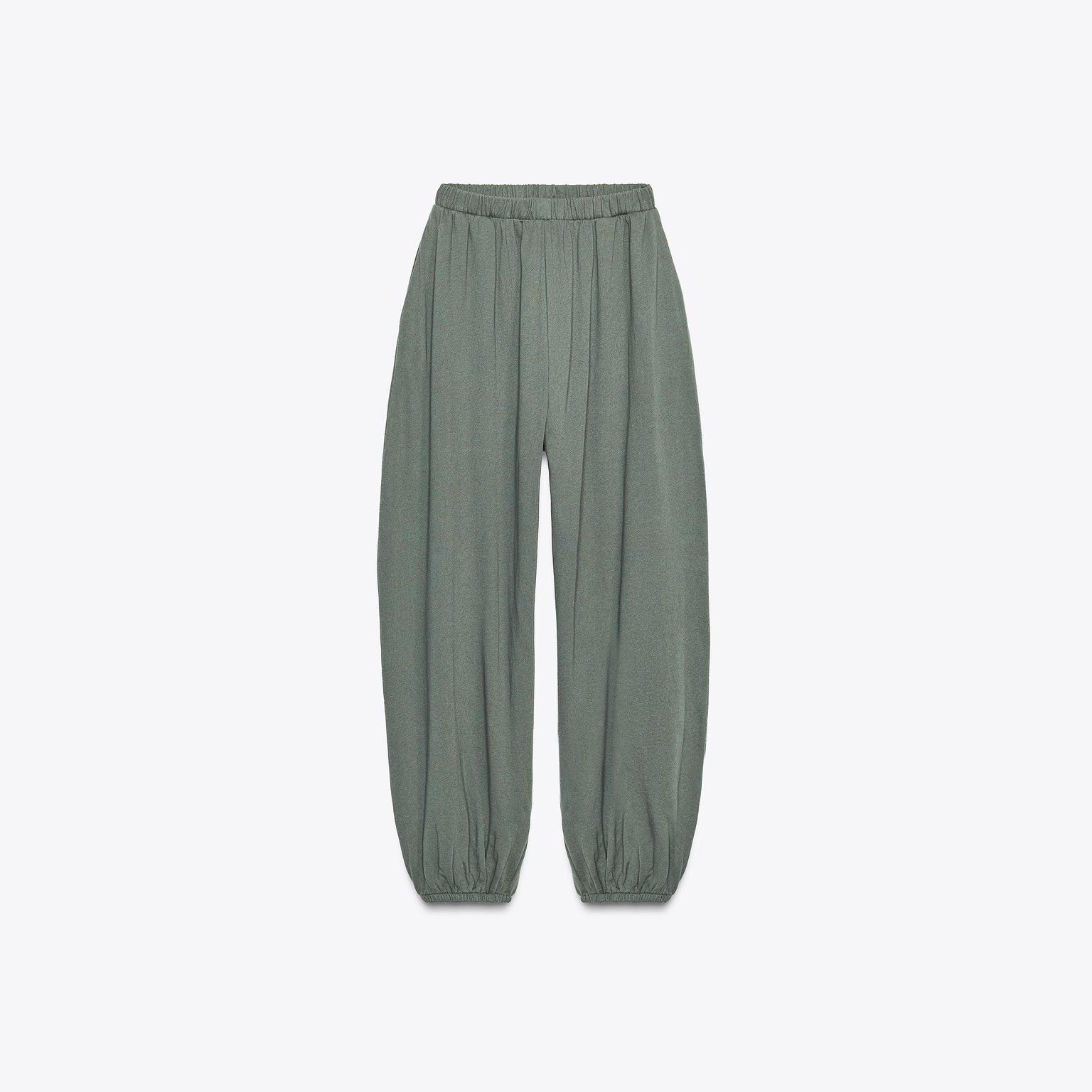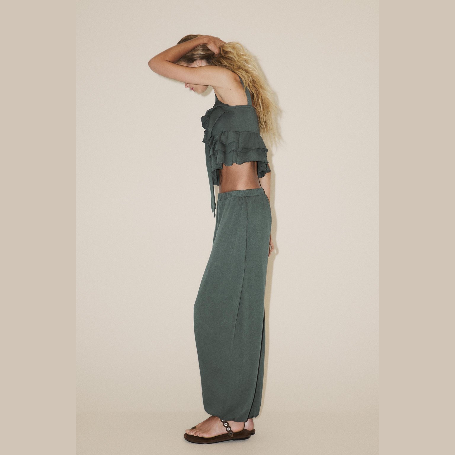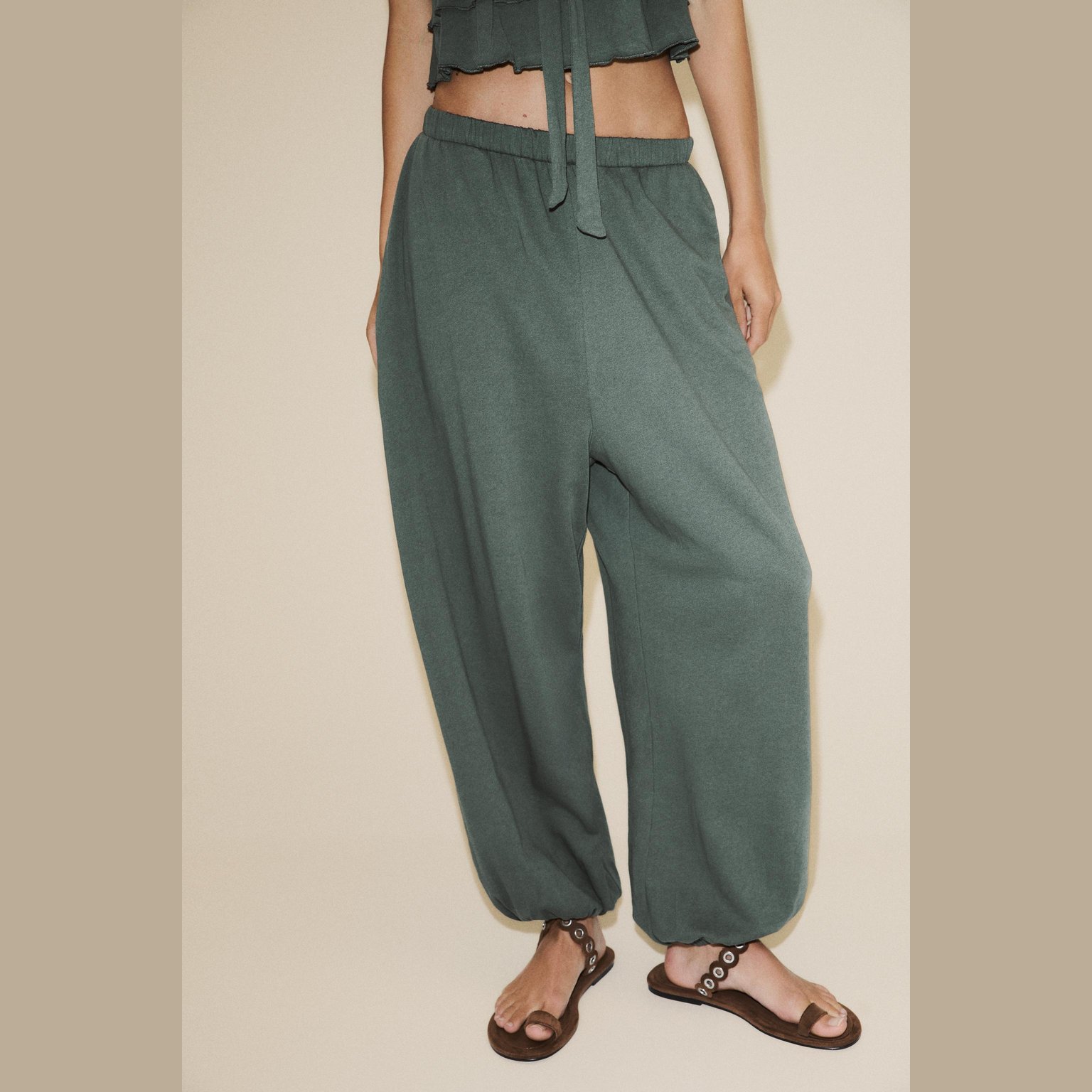 بنطال بملمس ناعم بقصّة بالون – لون أخضر – Green (Plush Balloon Trousers) بنطال مريح بتصميم بالون عصري، مصنوع من خامة ناعمة تمنح راحة يومية. يأتي بخصر مرتفع مع حزام مطاطي، إضافة إلى جيوب جانبية داخلية تمنح عملية وأناقة. الأطراف السفلية مزودة برباط مطاطي يمنح شكلًا بالون مميزًا يناسب الإطلالات اليومية والكاجوال.