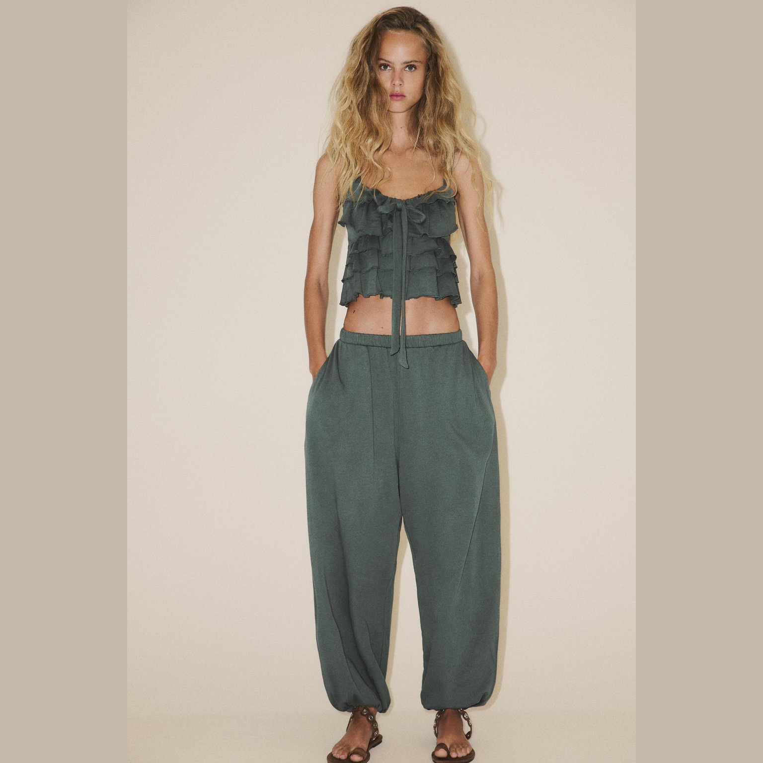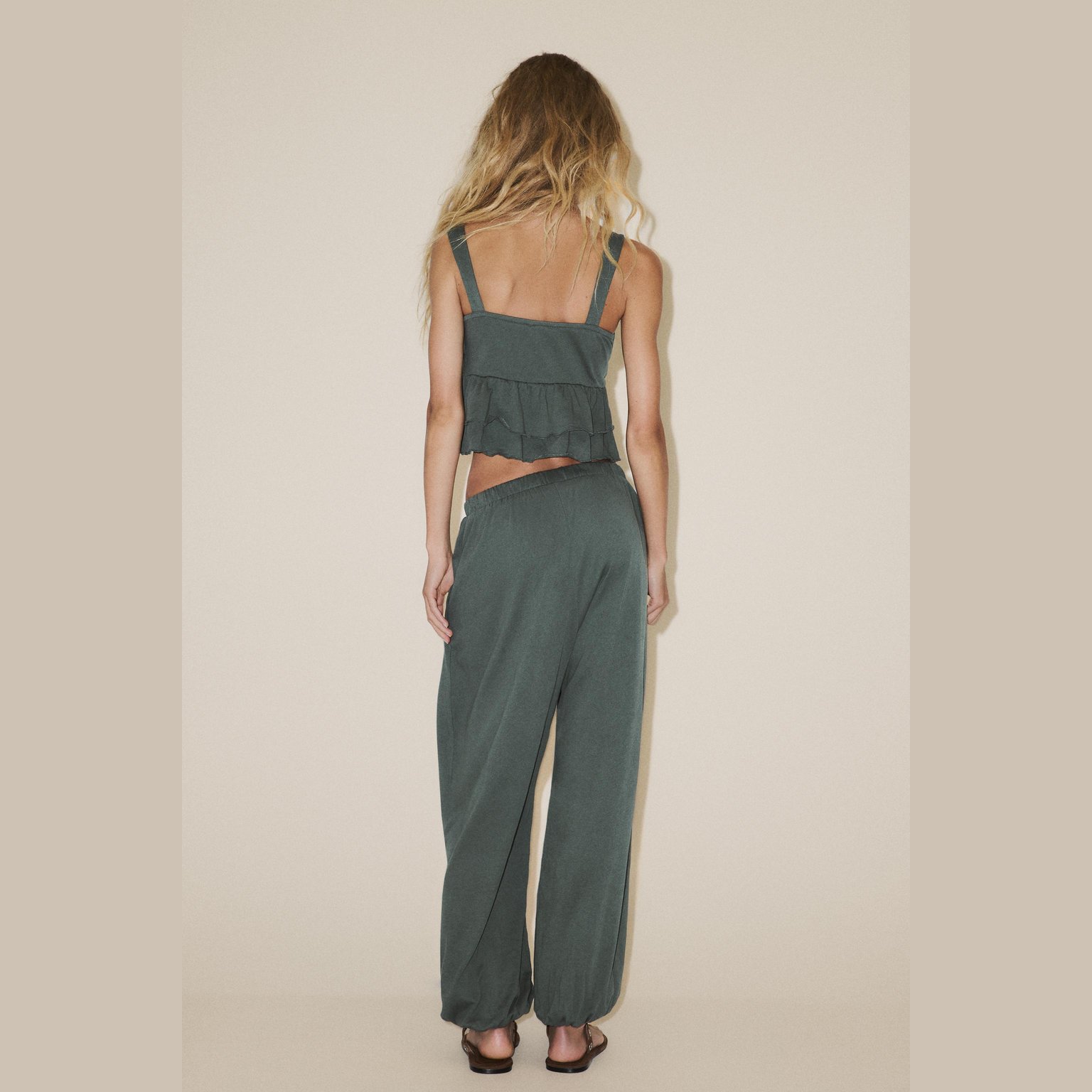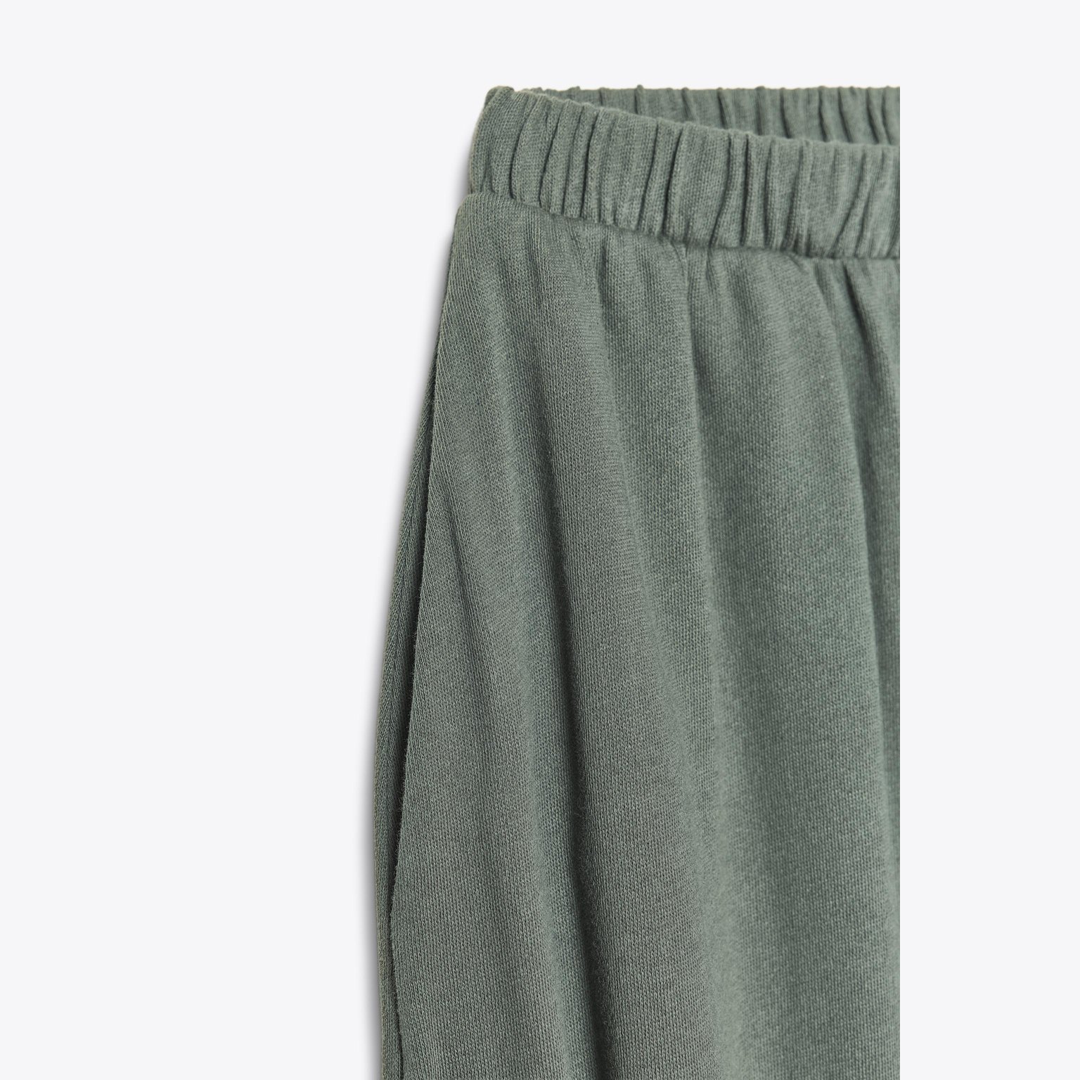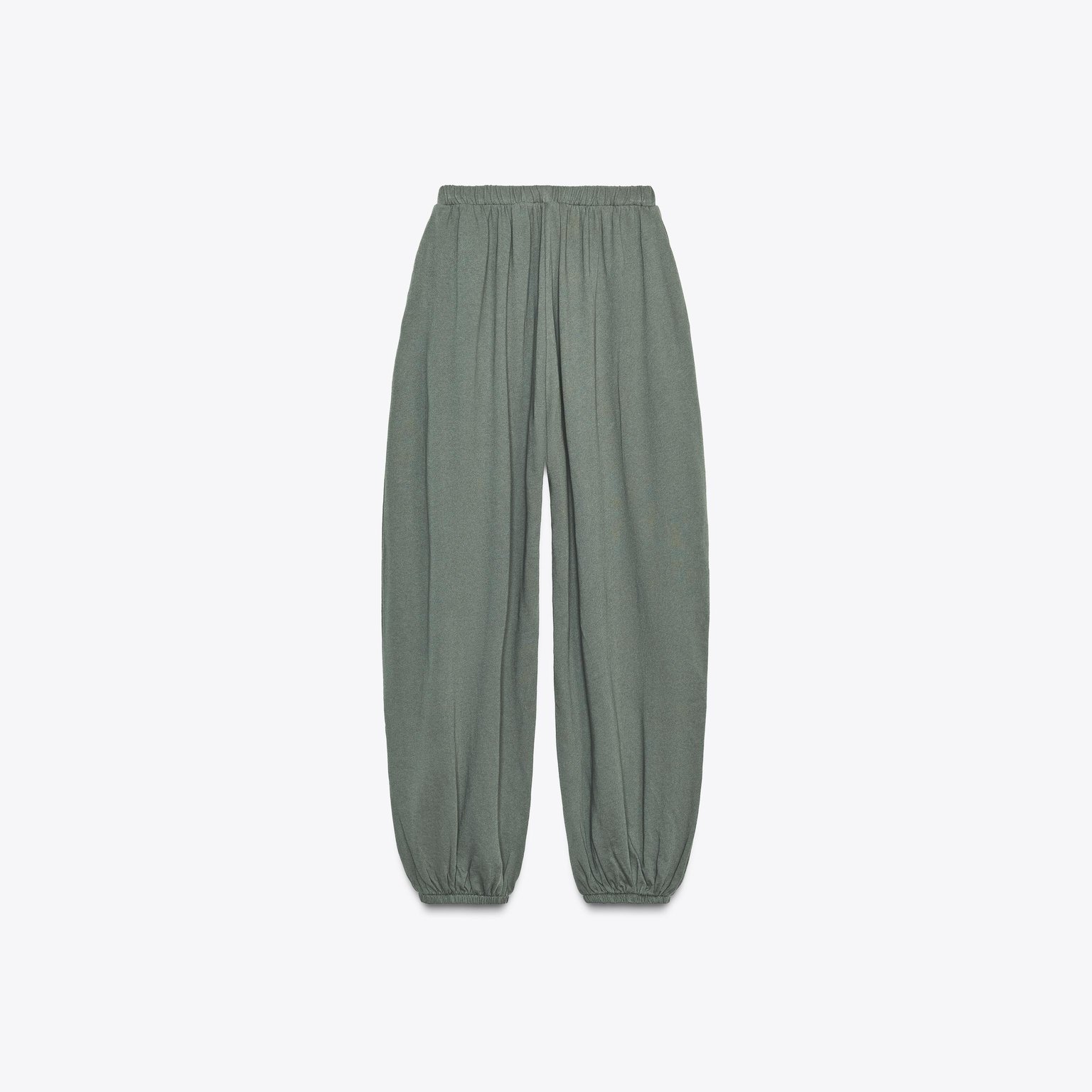 بنطال بملمس ناعم بقصّة بالون – لون أخضر – Green (Plush Balloon Trousers) بنطال مريح بتصميم بالون عصري، مصنوع من خامة ناعمة تمنح راحة يومية. يأتي بخصر مرتفع مع حزام مطاطي، إضافة إلى جيوب جانبية داخلية تمنح عملية وأناقة. الأطراف السفلية مزودة برباط مطاطي يمنح شكلًا بالون مميزًا يناسب الإطلالات اليومية والكاجوال.