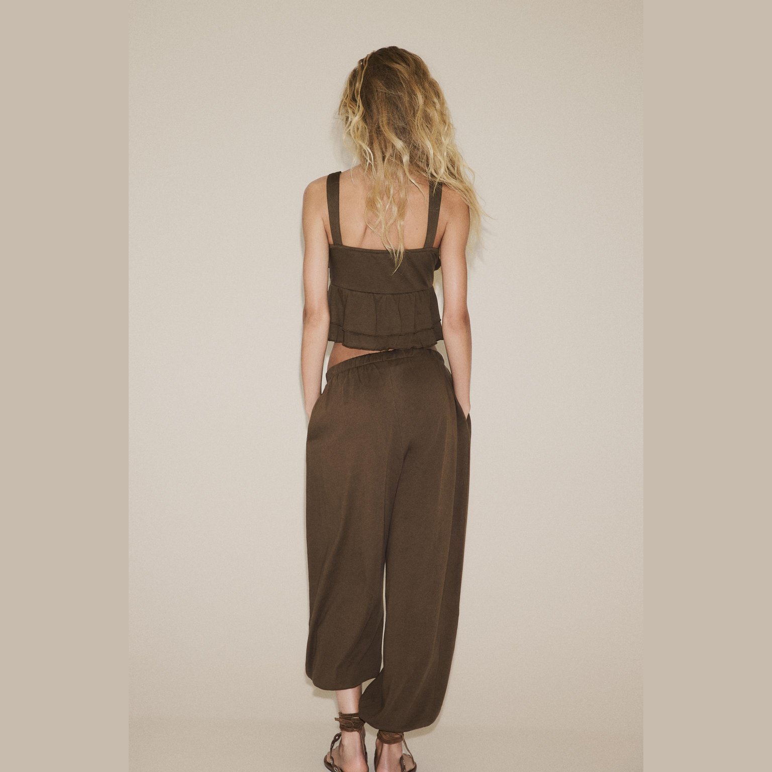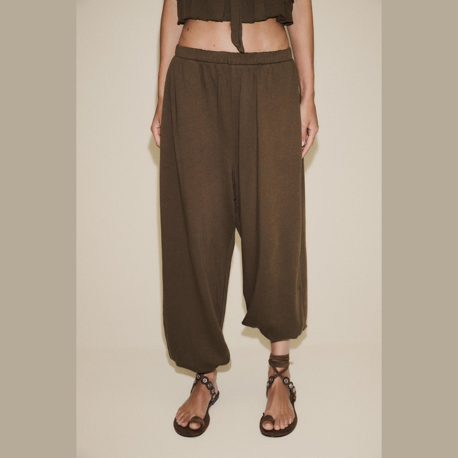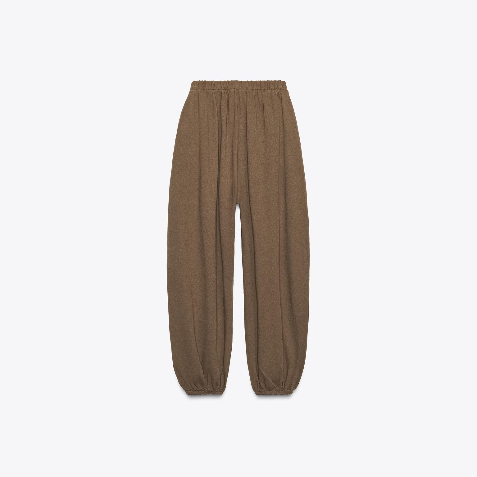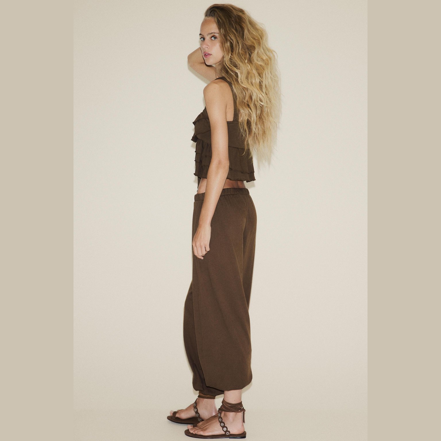 بنطال بملمس ناعم بقصّة بالون – لون بني – Brown (Plush Balloon Trousers) بنطال مريح بتصميم بالون عصري، مصنوع من خامة ناعمة تمنح راحة يومية. يأتي بخصر مرتفع مع حزام مطاطي، إضافة إلى جيوب جانبية داخلية تمنح عملية وأناقة. الأطراف السفلية مزودة برباط مطاطي يمنح شكلًا بالون مميزًا يناسب الإطلالات اليومية والكاجوال.