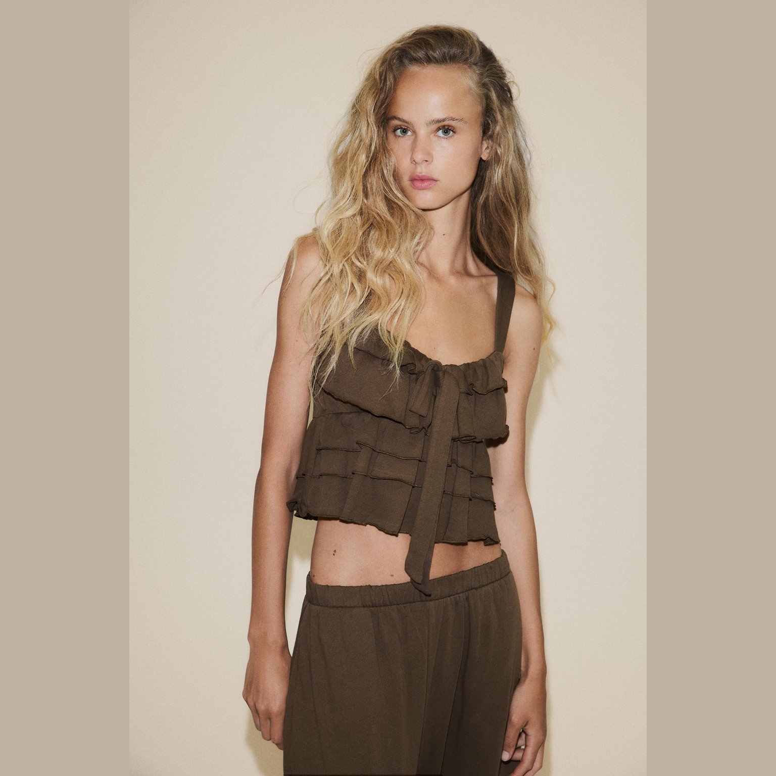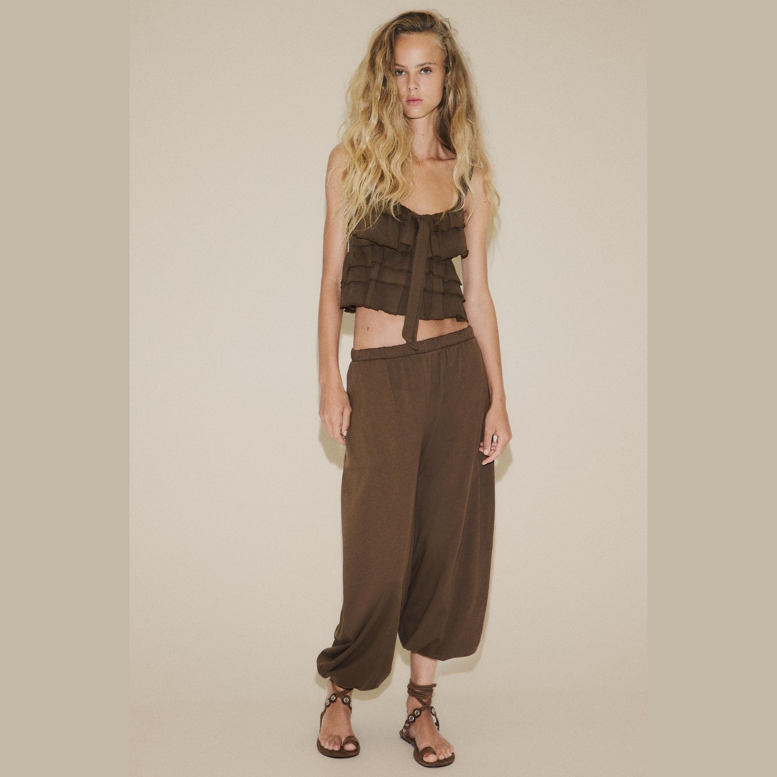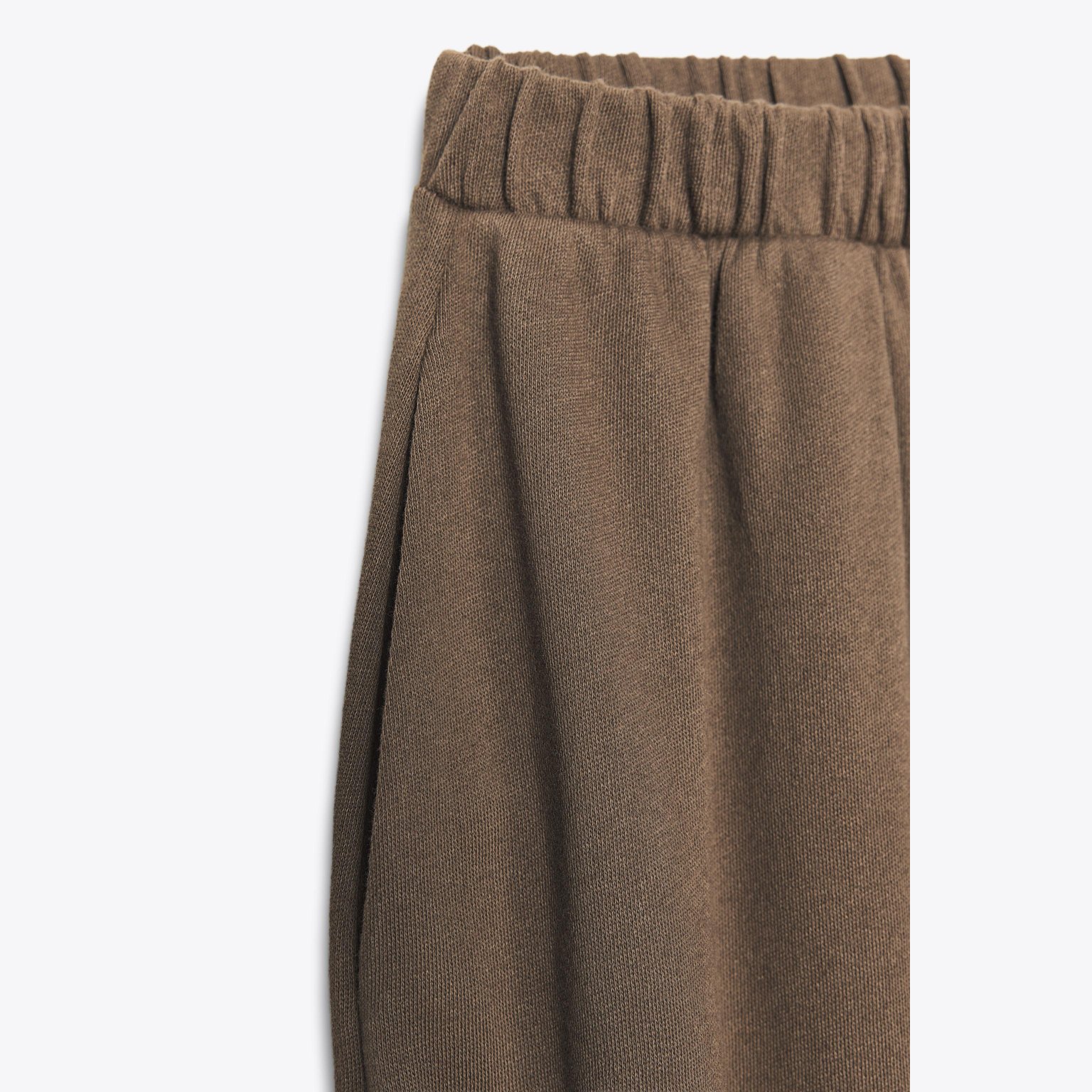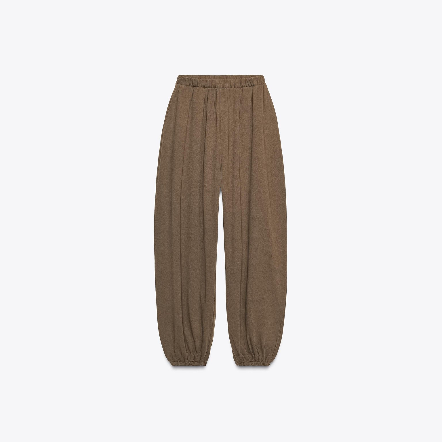 بنطال بملمس ناعم بقصّة بالون – لون بني – Brown (Plush Balloon Trousers) بنطال مريح بتصميم بالون عصري، مصنوع من خامة ناعمة تمنح راحة يومية. يأتي بخصر مرتفع مع حزام مطاطي، إضافة إلى جيوب جانبية داخلية تمنح عملية وأناقة. الأطراف السفلية مزودة برباط مطاطي يمنح شكلًا بالون مميزًا يناسب الإطلالات اليومية والكاجوال.