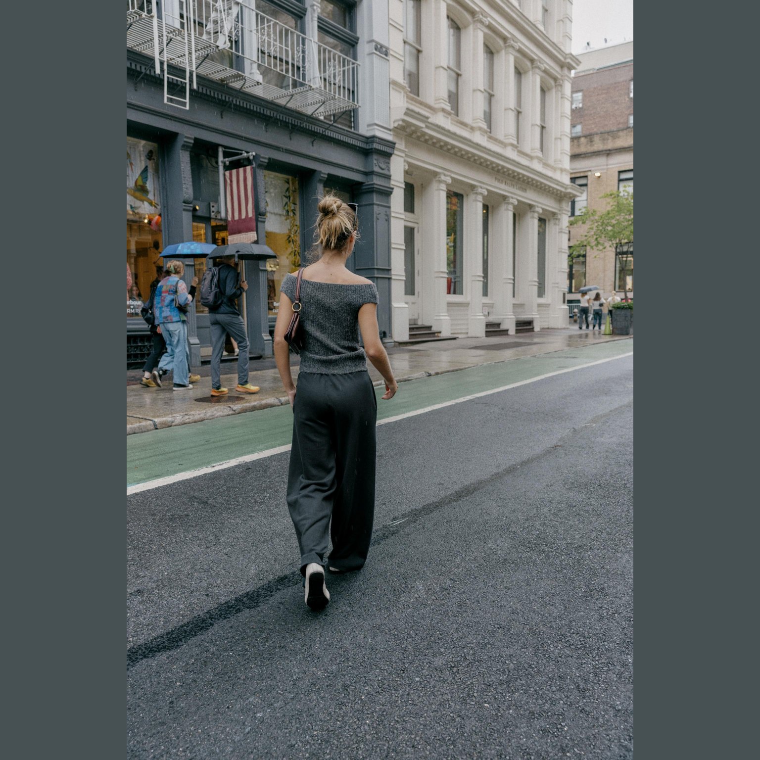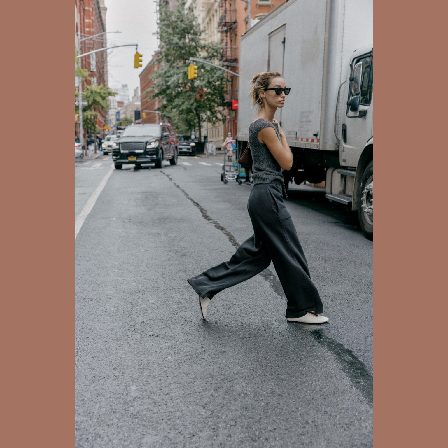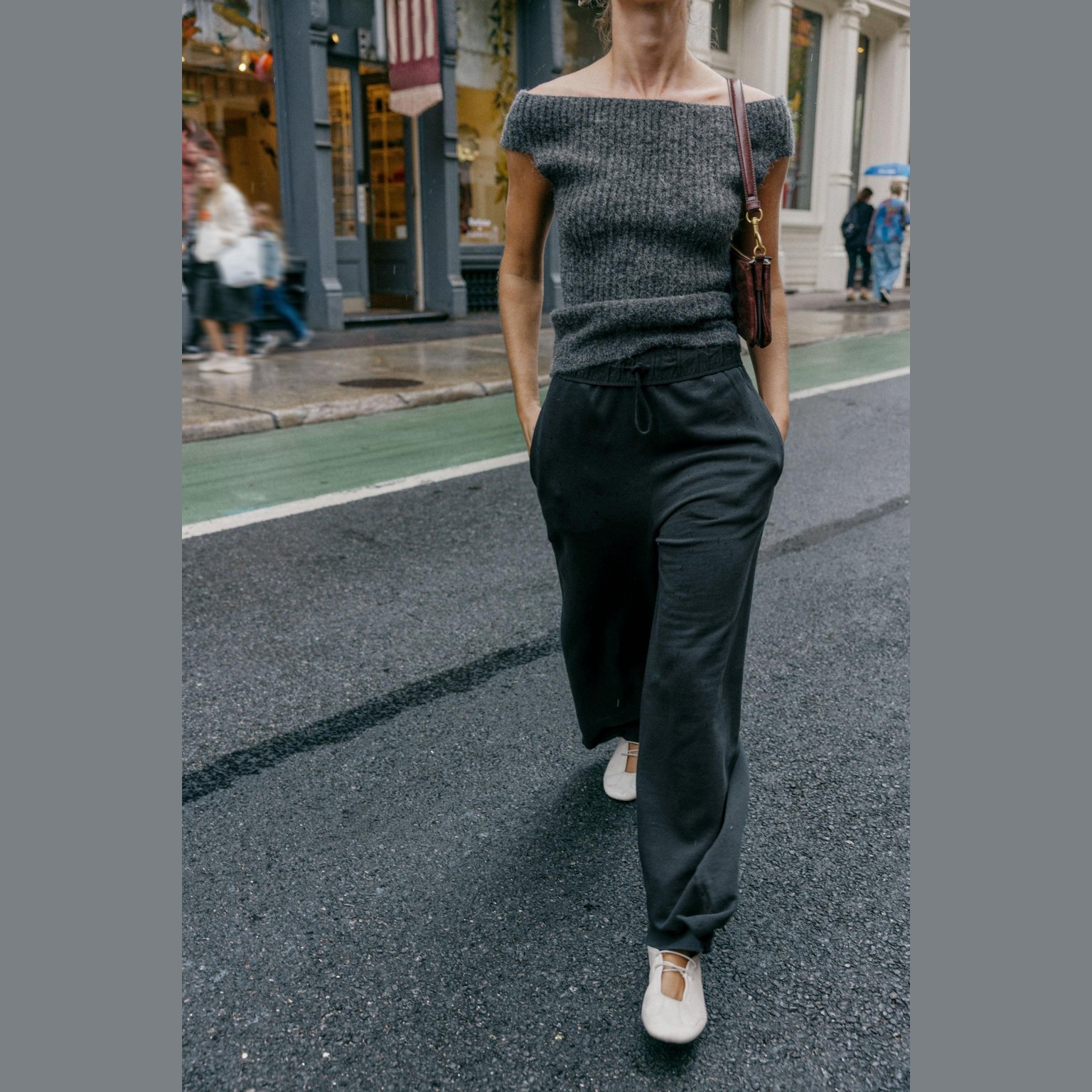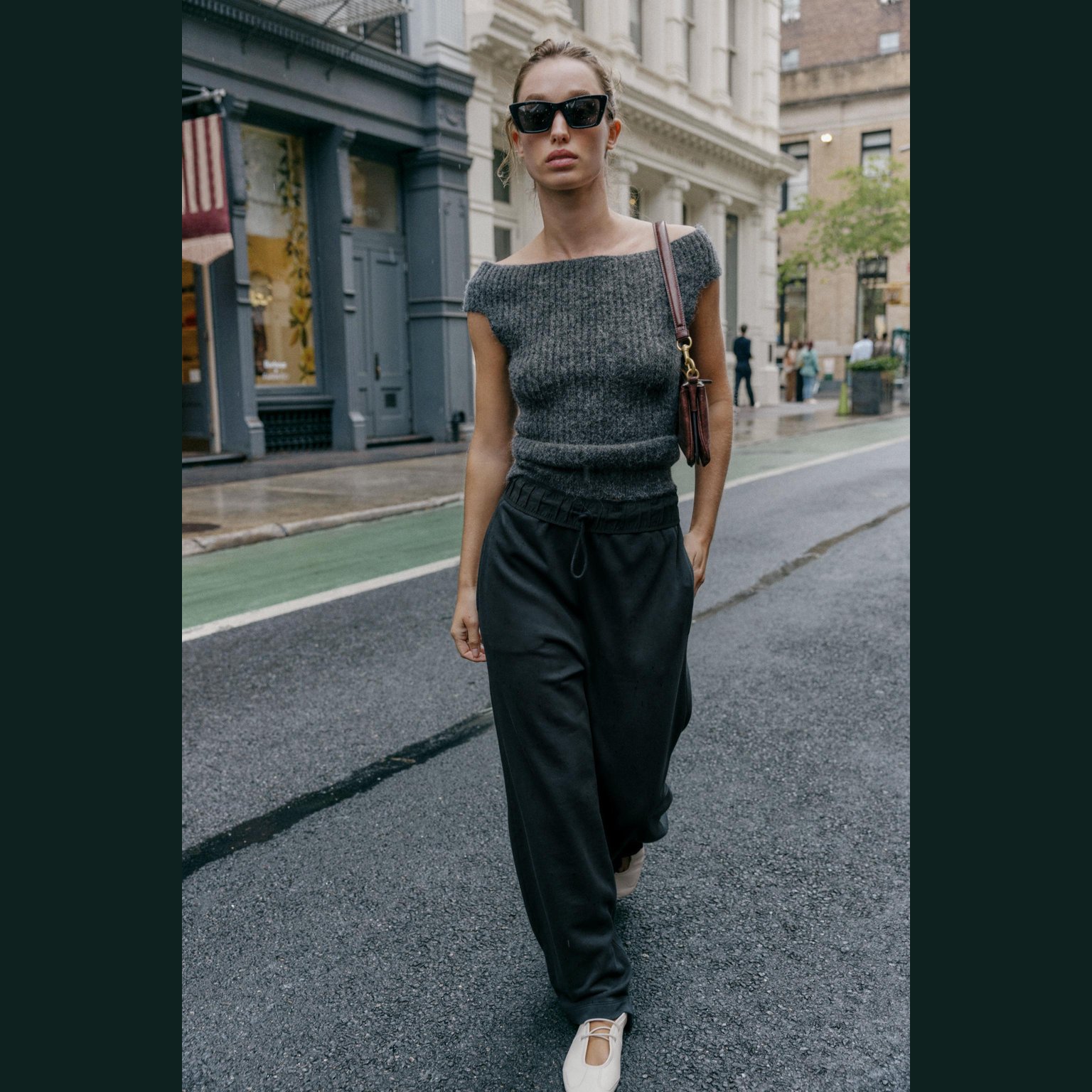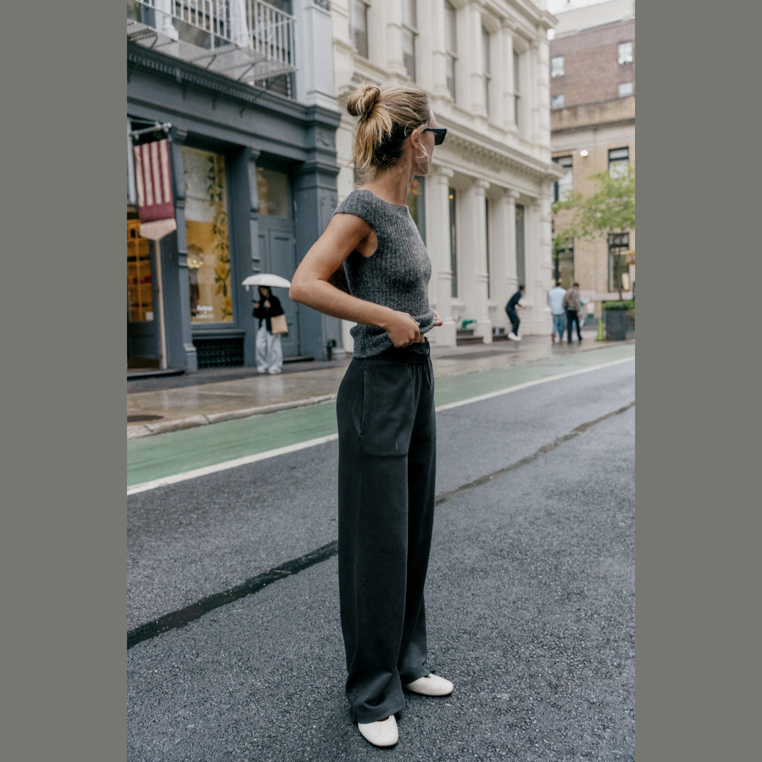بنطال بتأثير مغسول مع تفاصيل متباينة – لون فحمي – Charcoal (Washed‑Effect Contrast Trousers) بنطال مريح بخصر متوسط الارتفاع، يأتي بحزام مطاطي مزوّد برباط قابل للشد لمزيد من الراحة والثبات. يتميز بجيوب جانبية مخفية داخل الخياطة، مع قصّة واسعة وانسيابية تمنح مظهرًا عصريًا. الأطراف الجانبية مزودة بشقوق صغيرة تضيف لمسة تصميمية بسيطة وأنيقة.