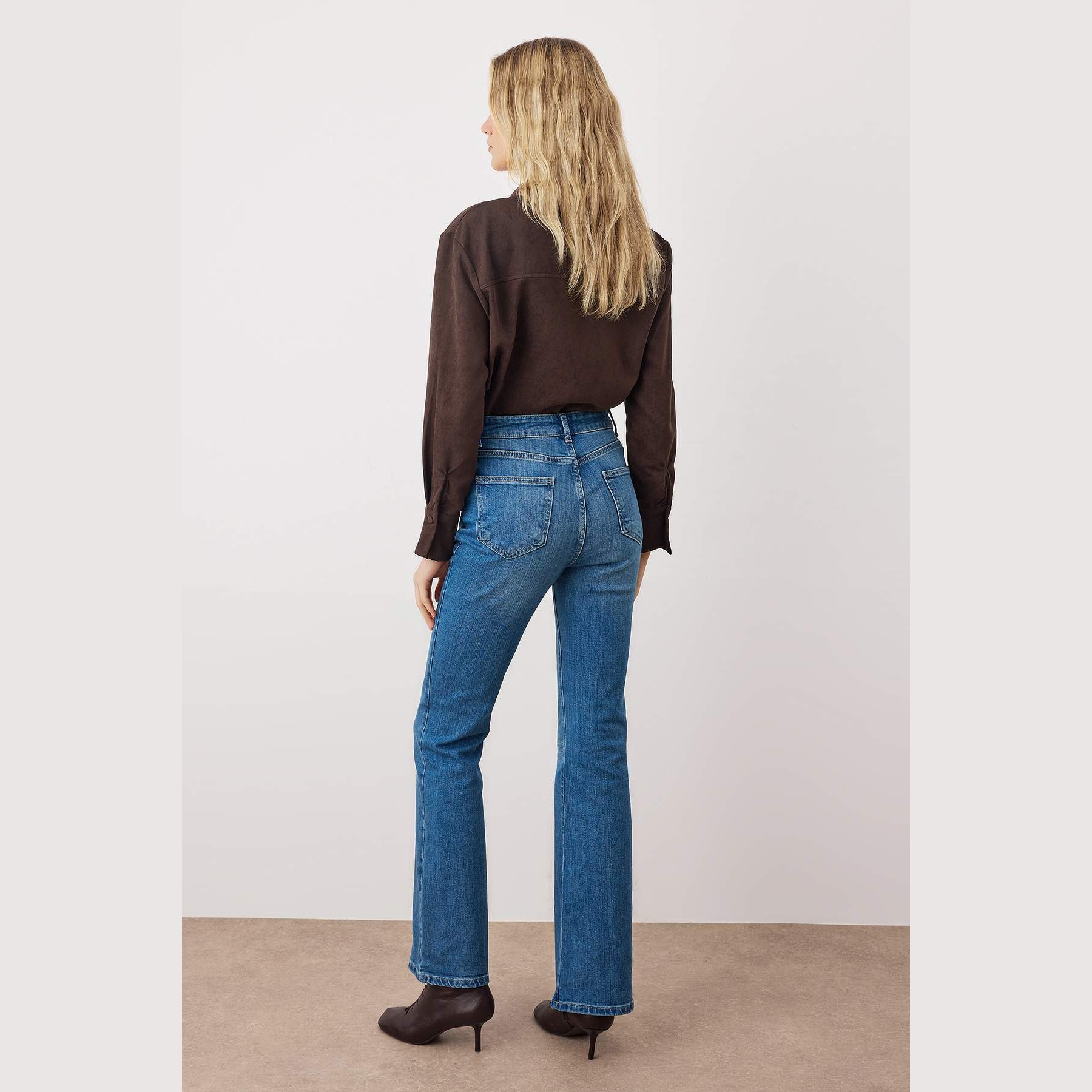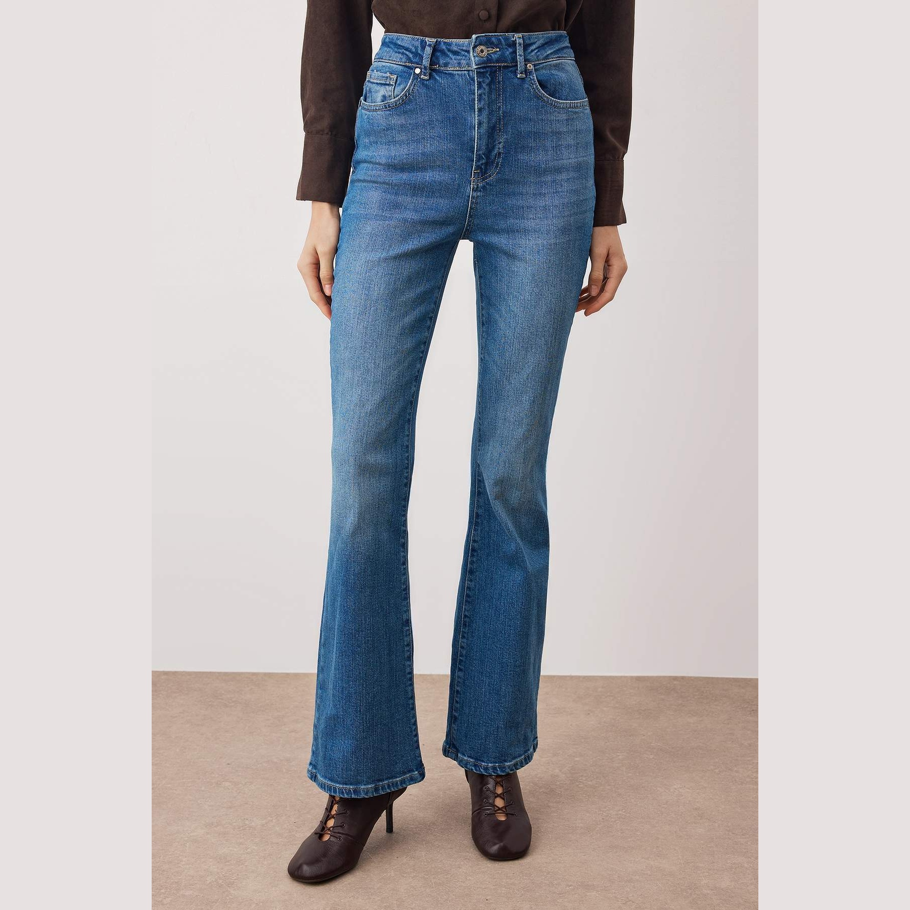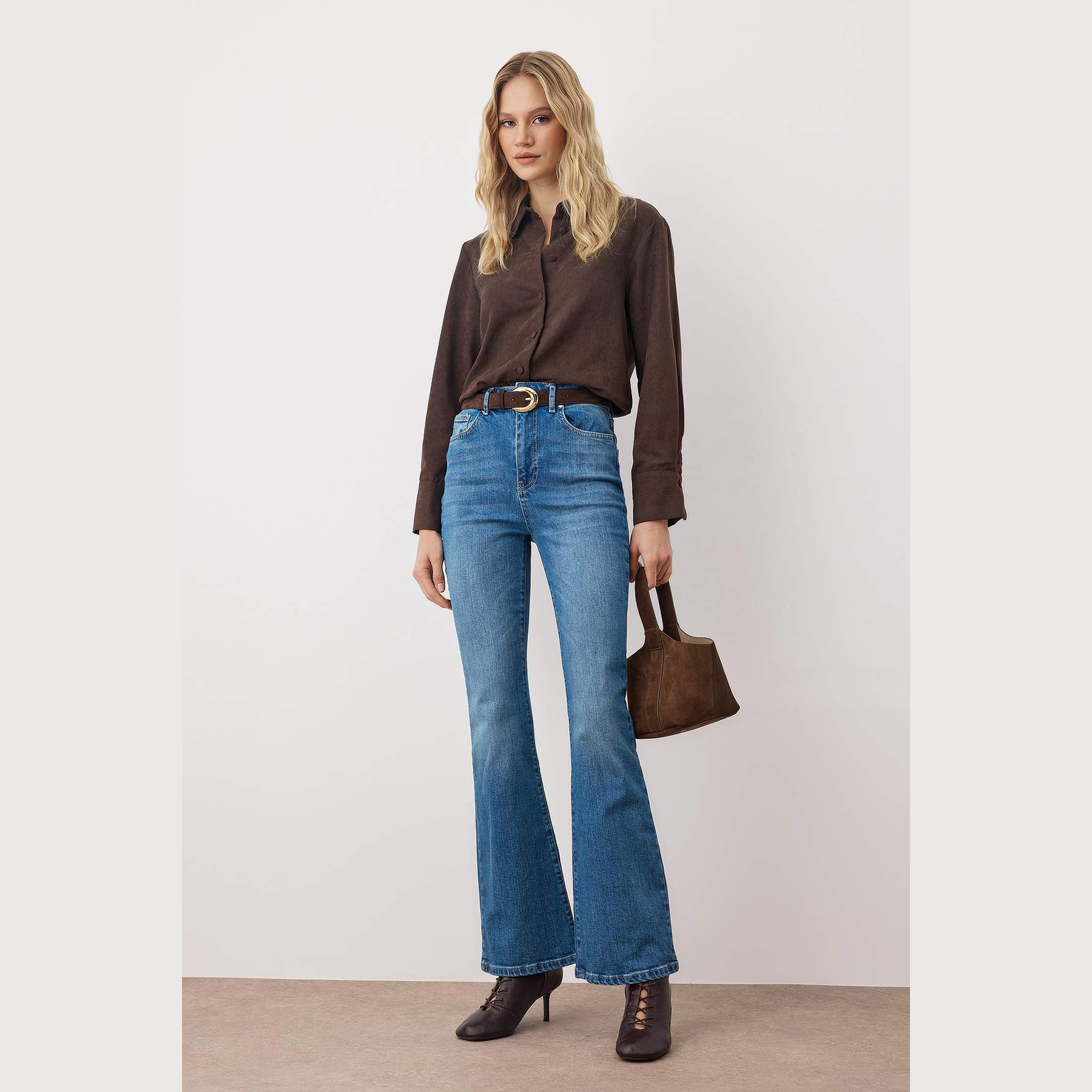 • القصة: قصة واسعة من الأسفل (Flare Jeans) مع خصر مرتفع جداً (Super High Waist).