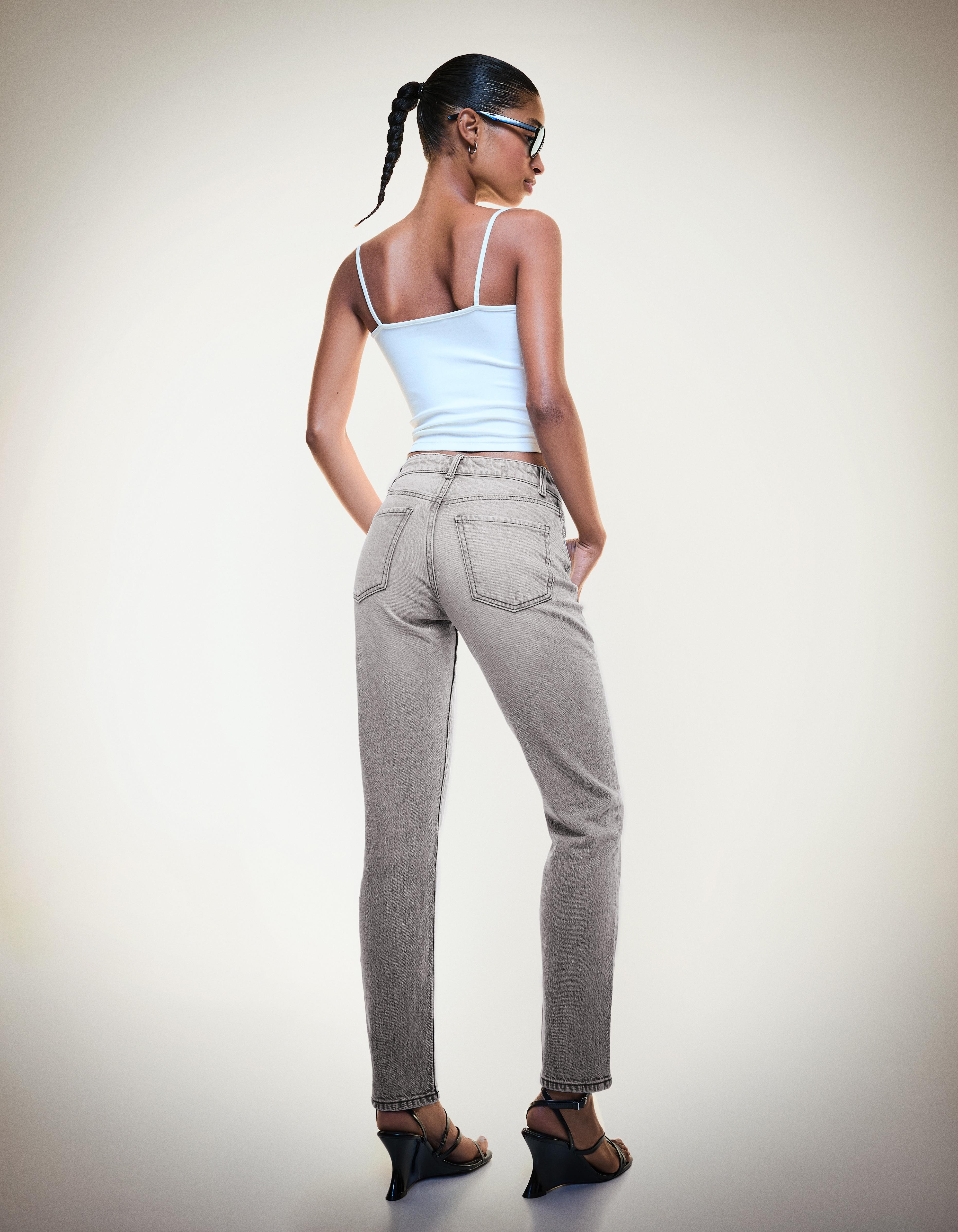 اختاري التوازن المثالي بين الراحة والأناقة مع جينز موم من Bershka بلونه الرمادي العصري. تصميمه بخصر مرتفع وقصّة مريحة يمنحك إطلالة أنثوية عملية، بينما يضفي اللون الرمادي لمسة حيادية أنيقة تناسب مختلف التنسيقات.