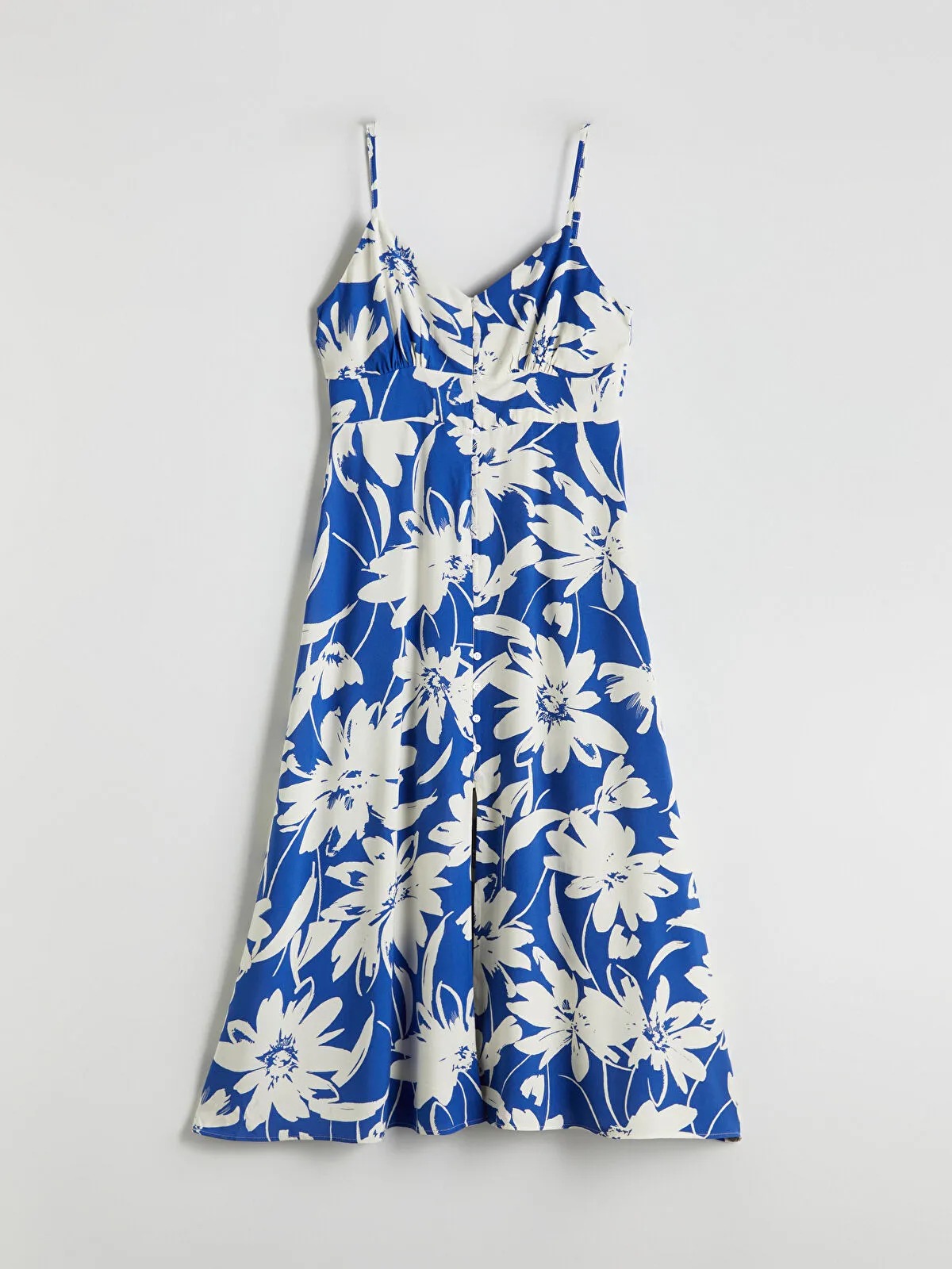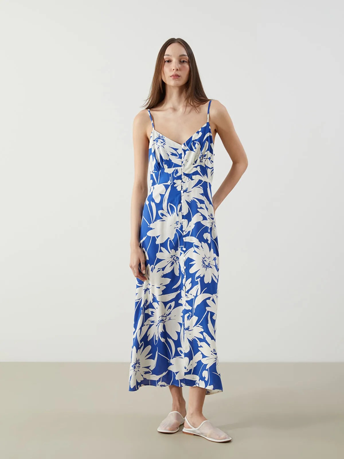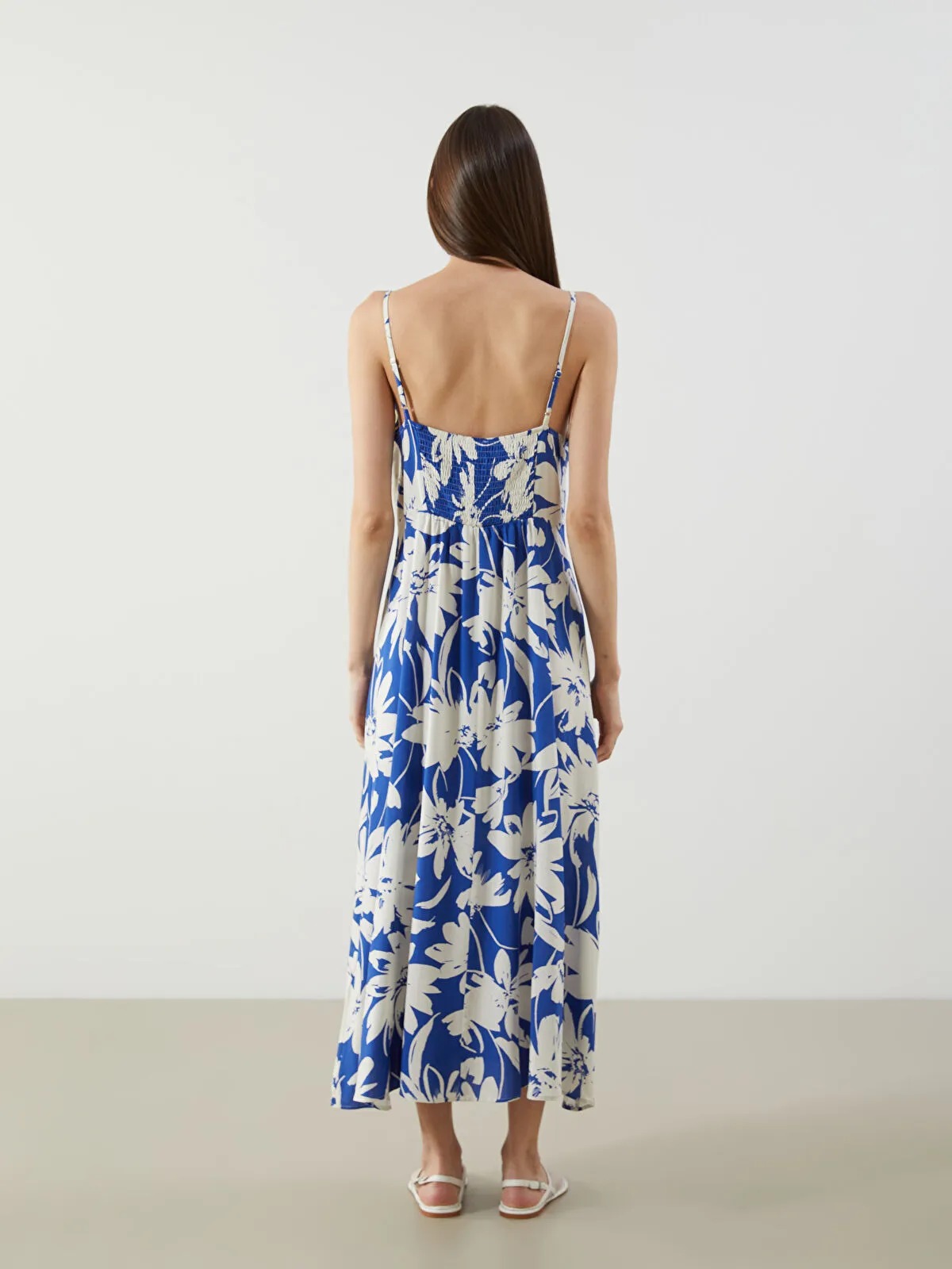 فستان أزرق مزخرف بطبعات زهرية أنثوية، بتصميم بياقة V وأكتاف مكشوفة (رقيقة)، يمنحك مظهرًا أنيقًا وراحدًا دون إجهاد، مثالي لأيام الصيف والإطلالات النهارية.