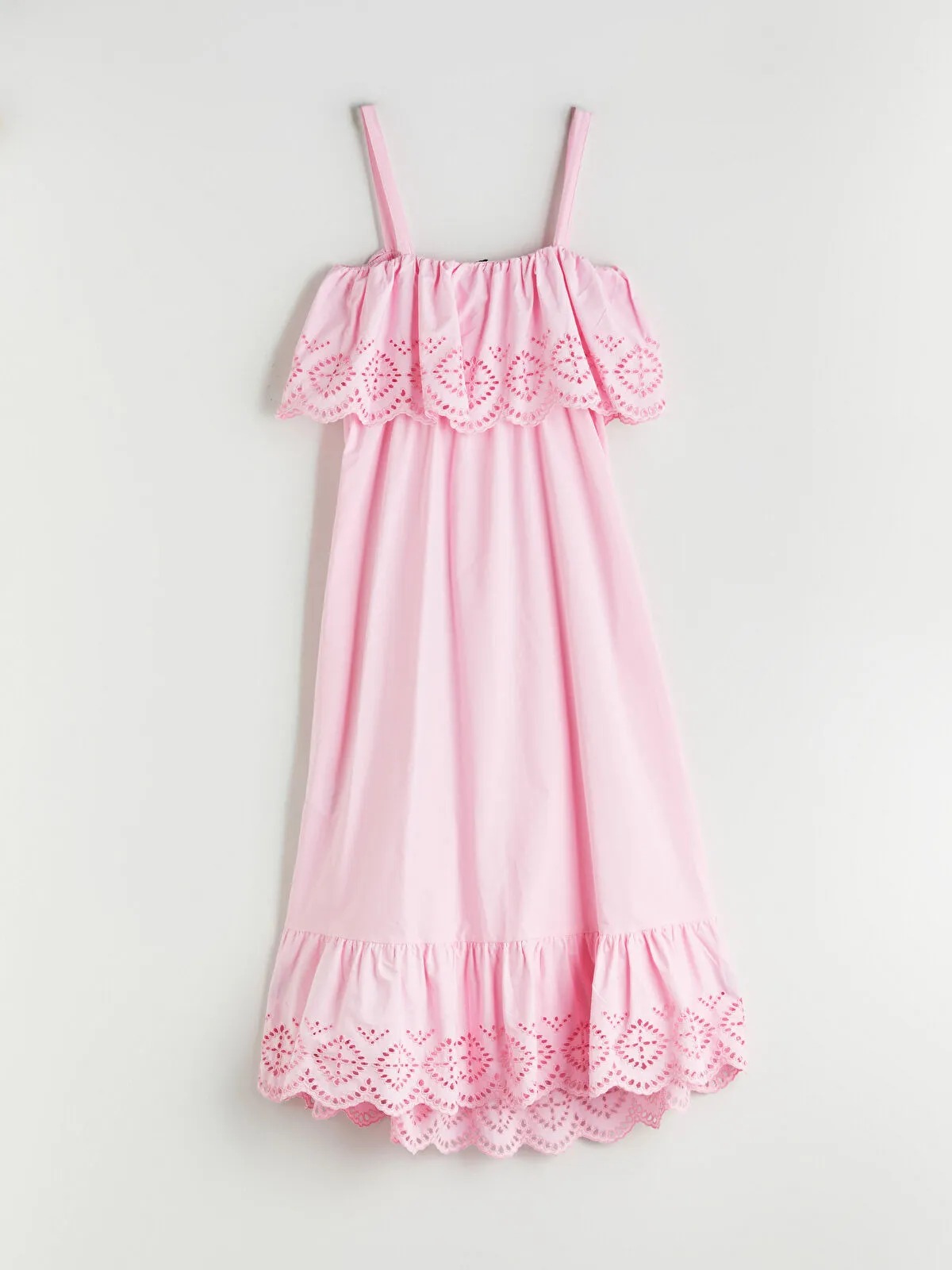 فستان زهري Poplin بتصميم أنثوي ناعم، بياقة مخططة (Square Neck) بدون أكمام مع تفاصيل كشكش عند الخصر والصدر، يمنحك إطلالة صيفية أنيقة ومريحة تتميز بلمسة مرحة دون مبالغة.
