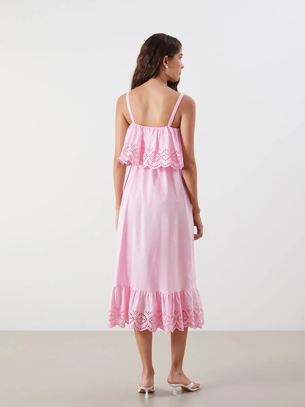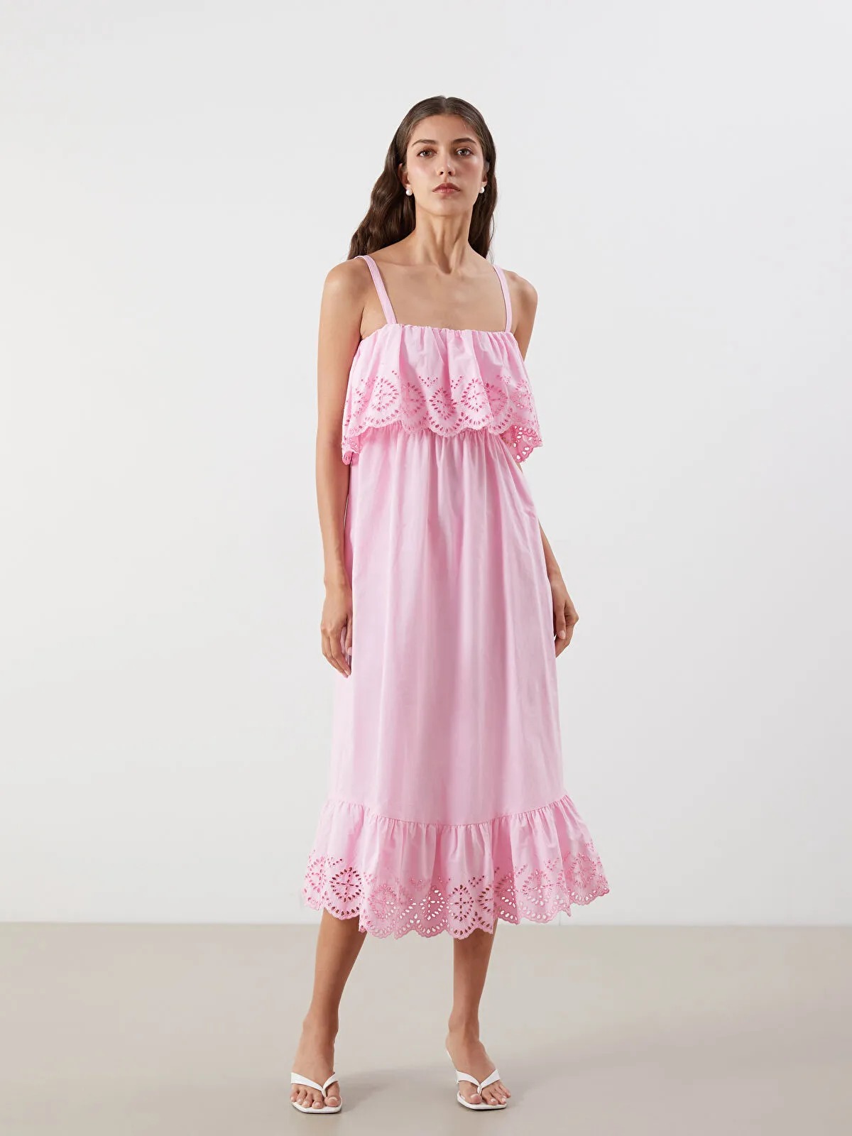 قصة مريحة (Regular Fit) مع خصر محدد (Belden Oturtmalı)، بدون بطانة، بطول Midi تقريبًا، بياقة مربعة، بدون أكمام، مزوّدة بكشكش ظريف عند الصدر وتفاصيل مطرزة (Ajurlu) في حافة الصدر وحوالي الصدر والصدر الأمامي للحصول على شكل أنثوي متوازن