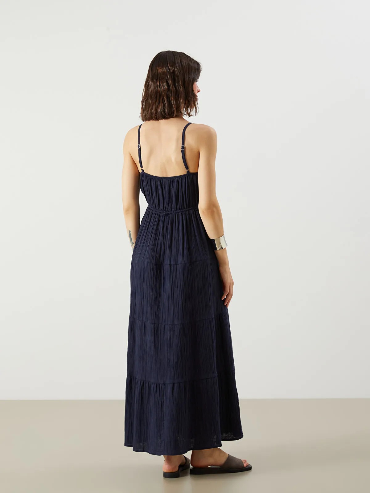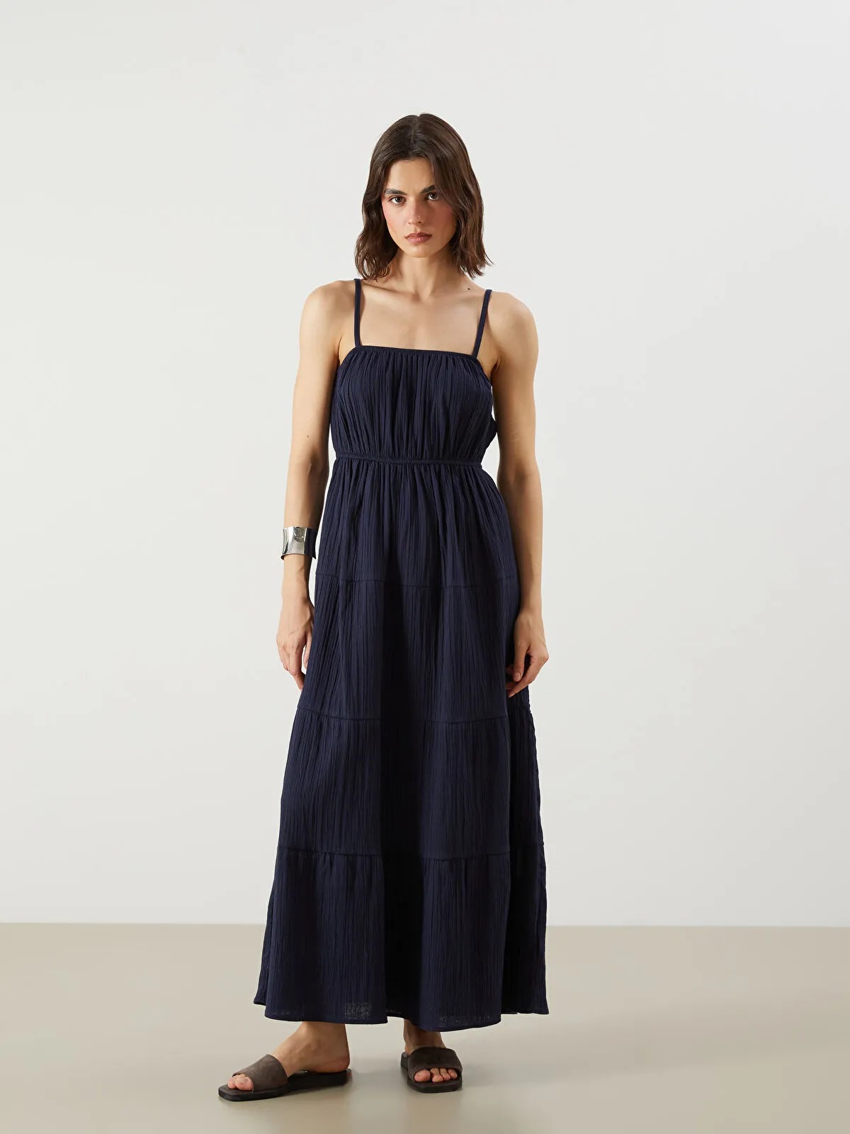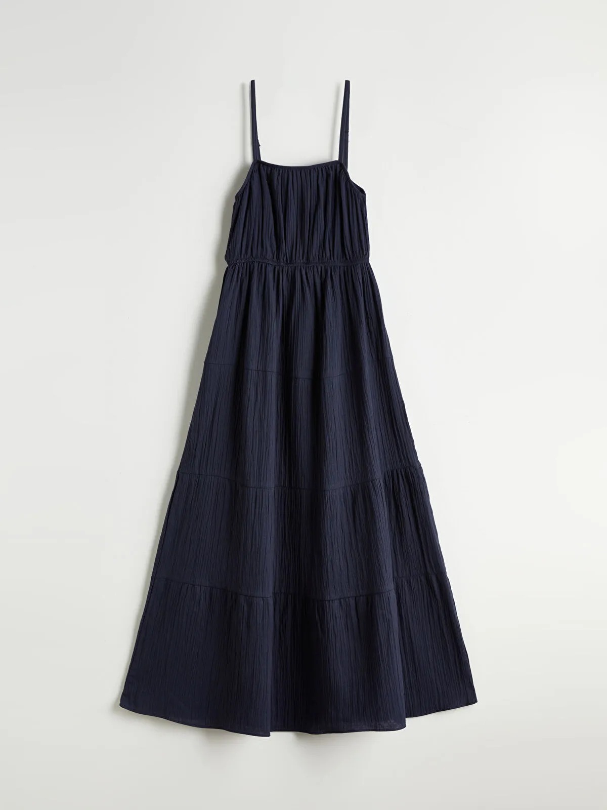 فستان طويل أنيق بلون نيلي، تصميمه بياقة U مكشكشة (U يـٰـا̄قة بُوَزغة) بدون أكمام، بتصميم A‑Cut يُبرز خصرًا محددًا بدقة مع انسجام انسيابي، مثالي للصيف والاستخدام اليومي بأناقة خفيفة.