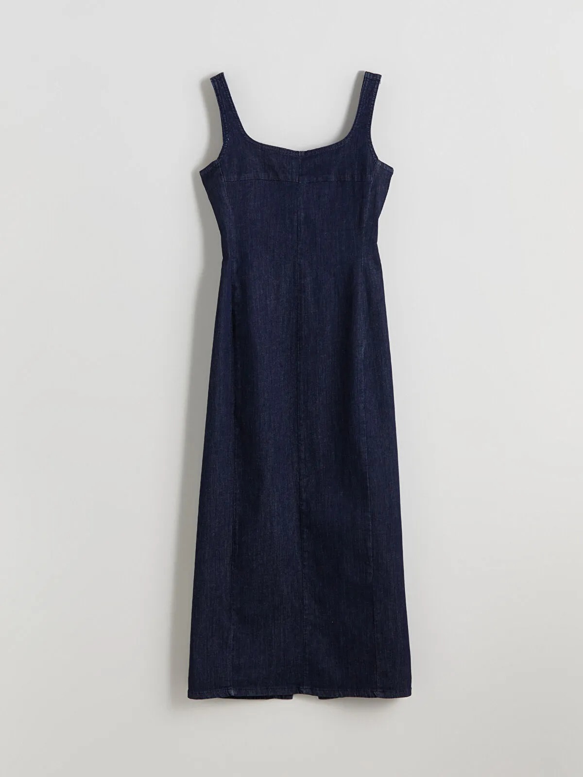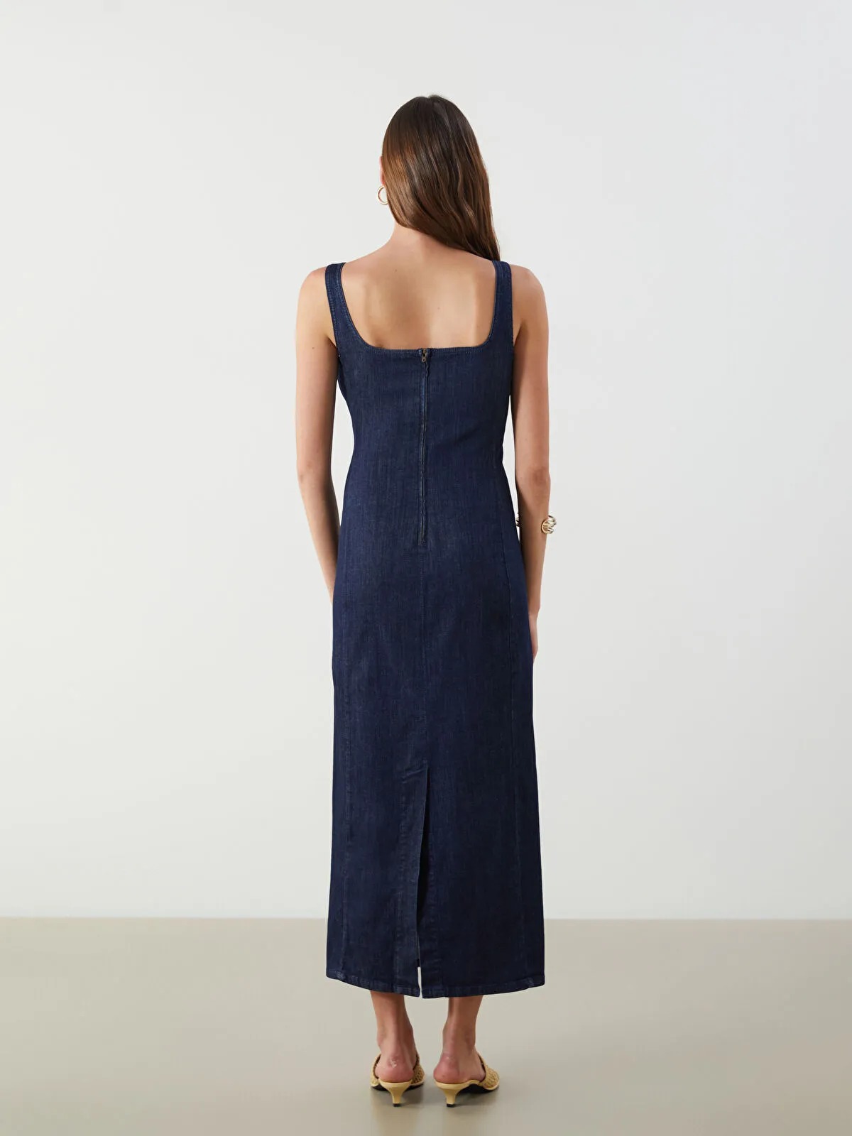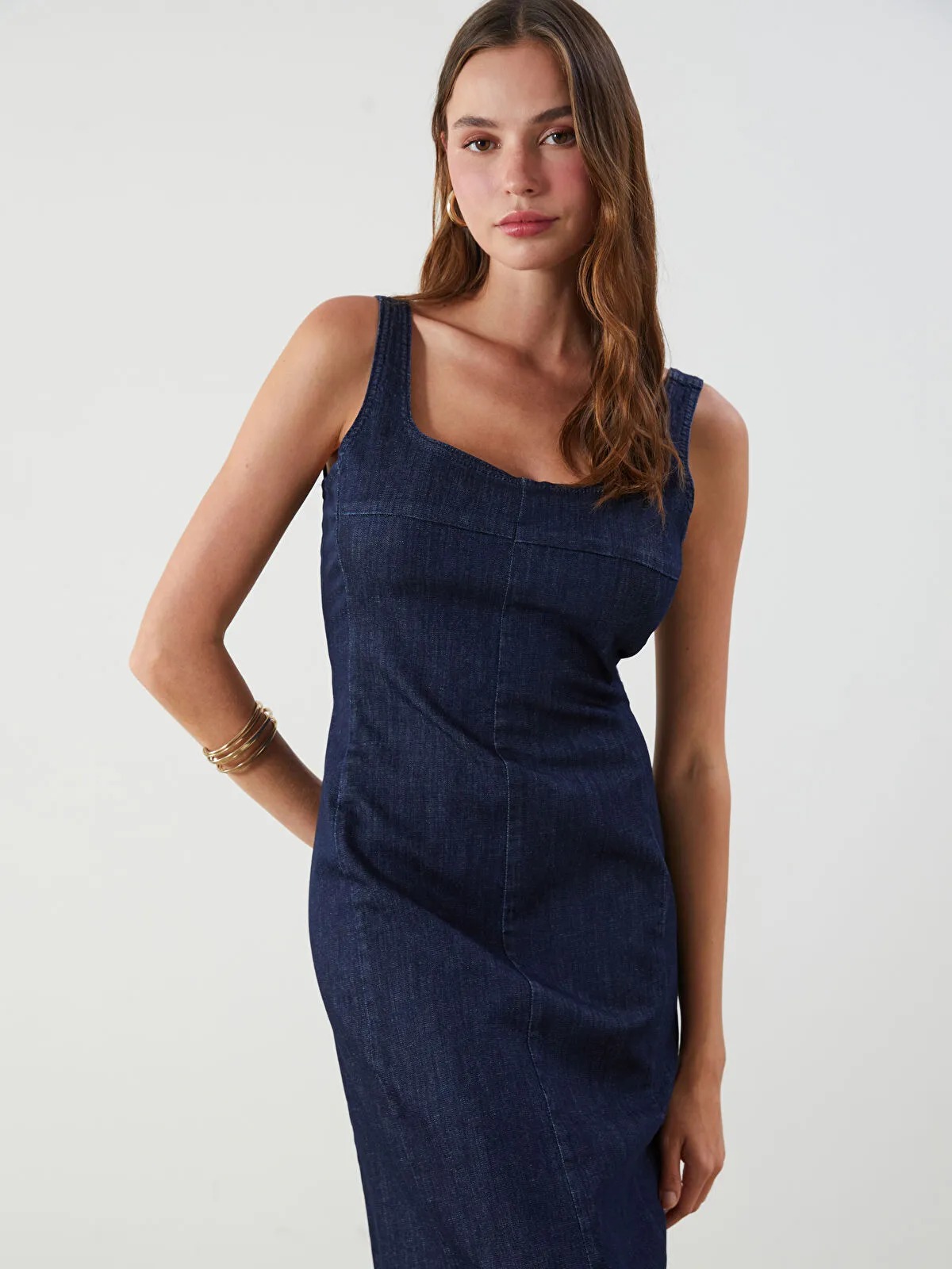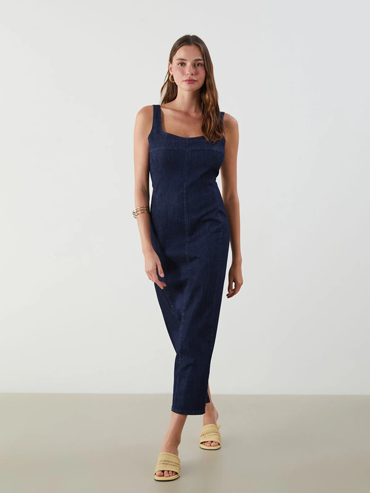 فستان دنيم بأسلوب صيفي أنيق وطابع عملي، بنمط بدون أكمام وبياقة U، مناسب للمناسبات الكاجوال والمظهر اليومي المريح.