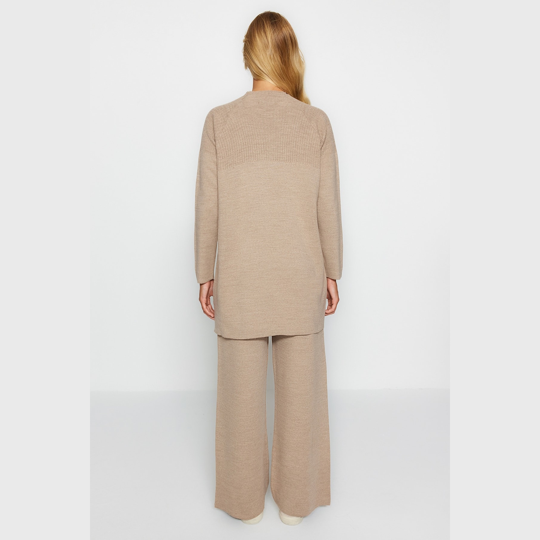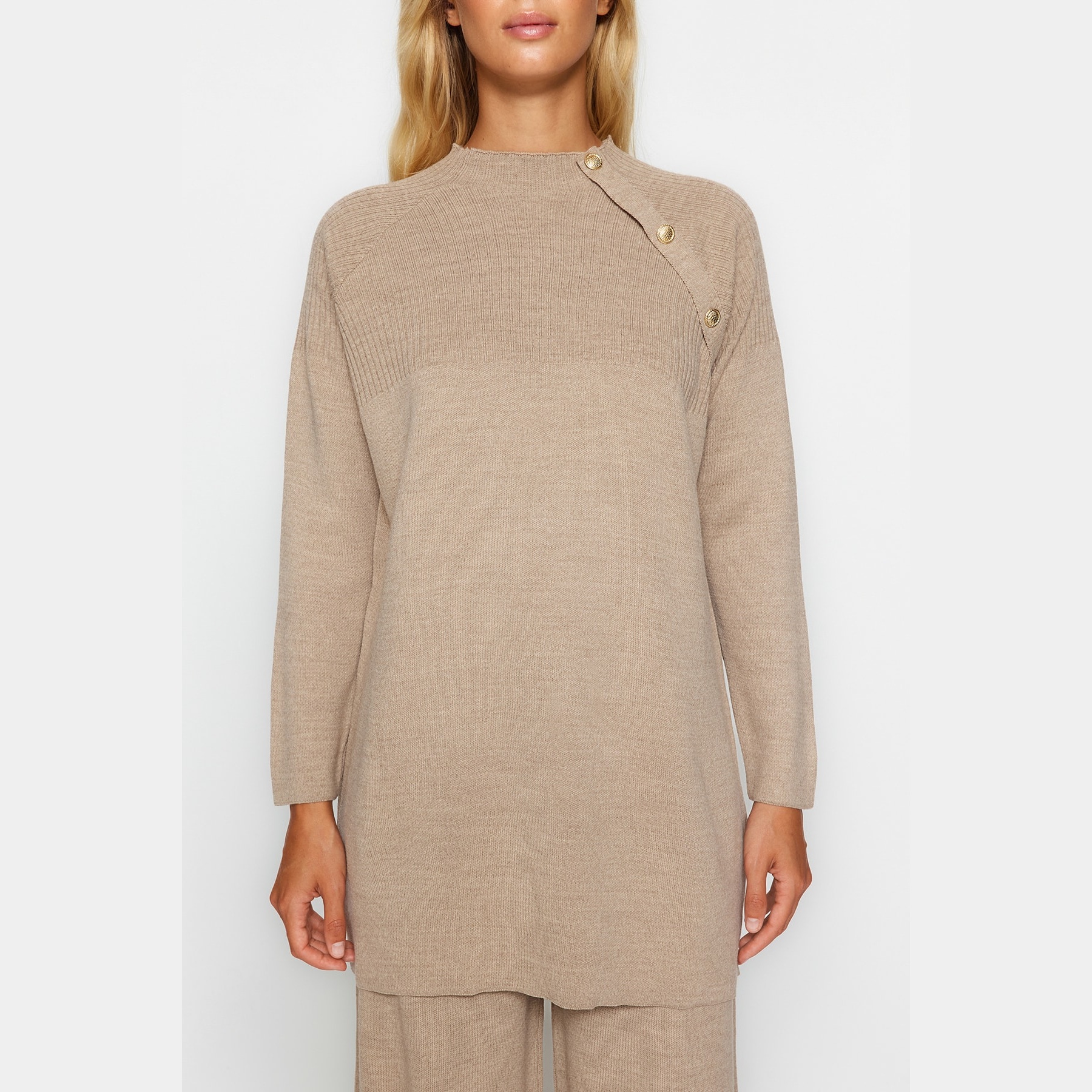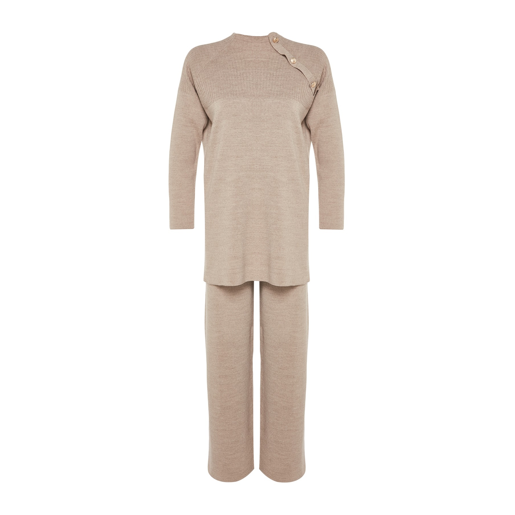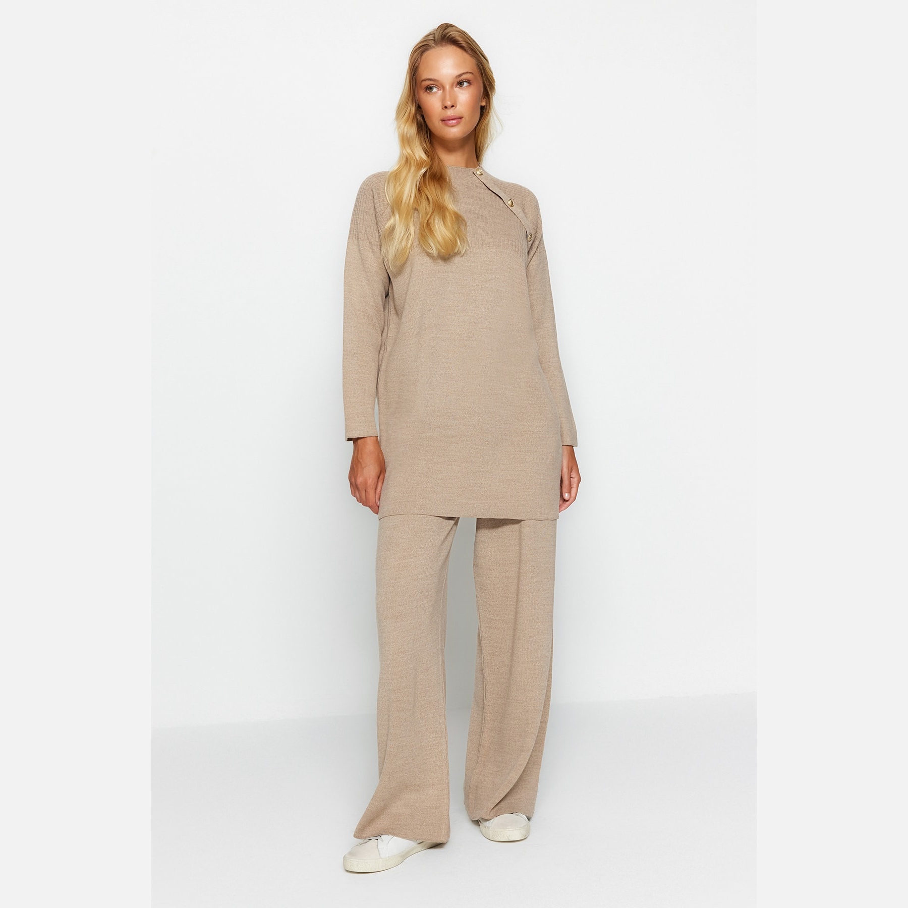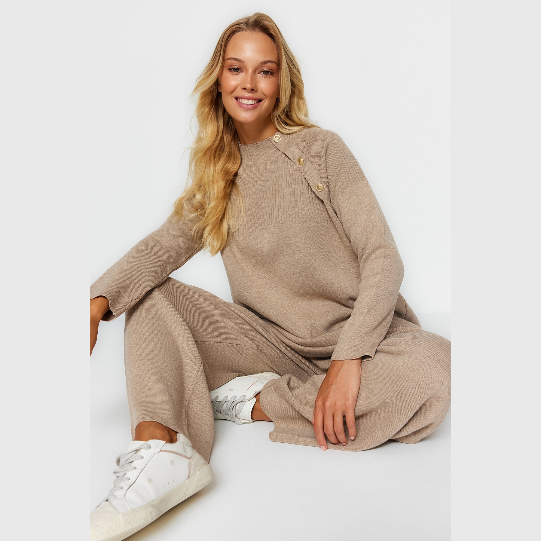 طقم أنيق بلون بيج فاتح موحد من مجموعة Trendyolmilla Modest – لأناقة شتوية مريحة ومحتشمة بلمسة كلاسيكية، يتكون من كنزة بياقة عالية مزينة بأزرار أمامية غير وظيفية مع بنطال واسع بخصر مرتفع، مصنوع من خامة تريكو أكريليك مزدوجة الطبقة بملمس دافئ ومريح، ما يجعله مثاليًا للأجواء الباردة والإطلالات اليومية المحتشمة.