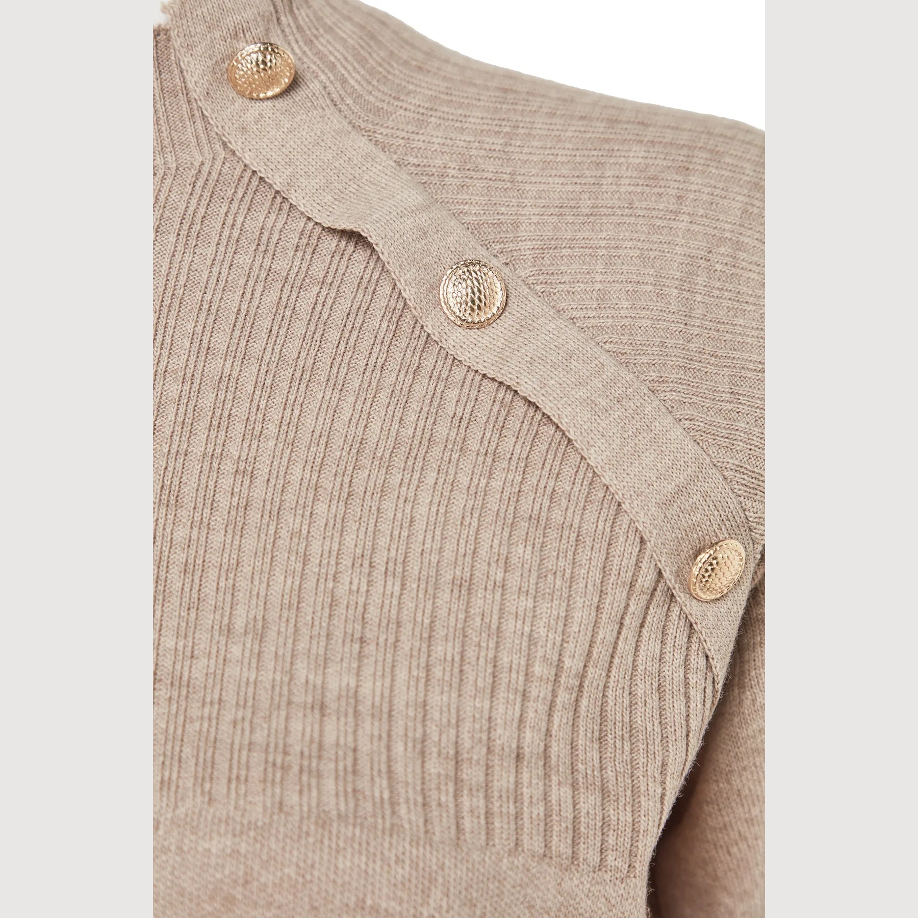 طقم نسائي مكون من كنزة وبنطال – بيج فاتح بتفاصيل أزرار (قماش تريكو ناعم، تصميم محتشم)