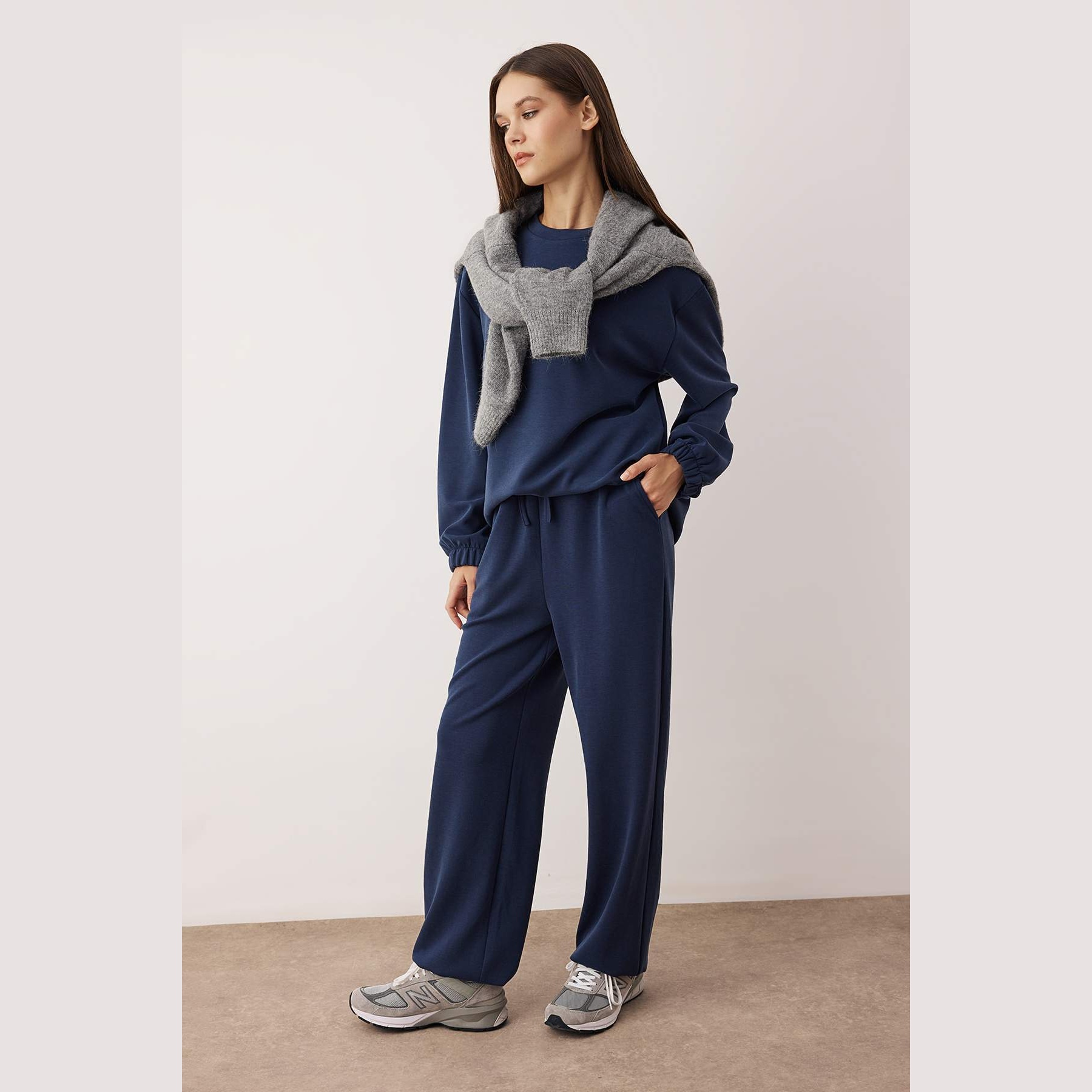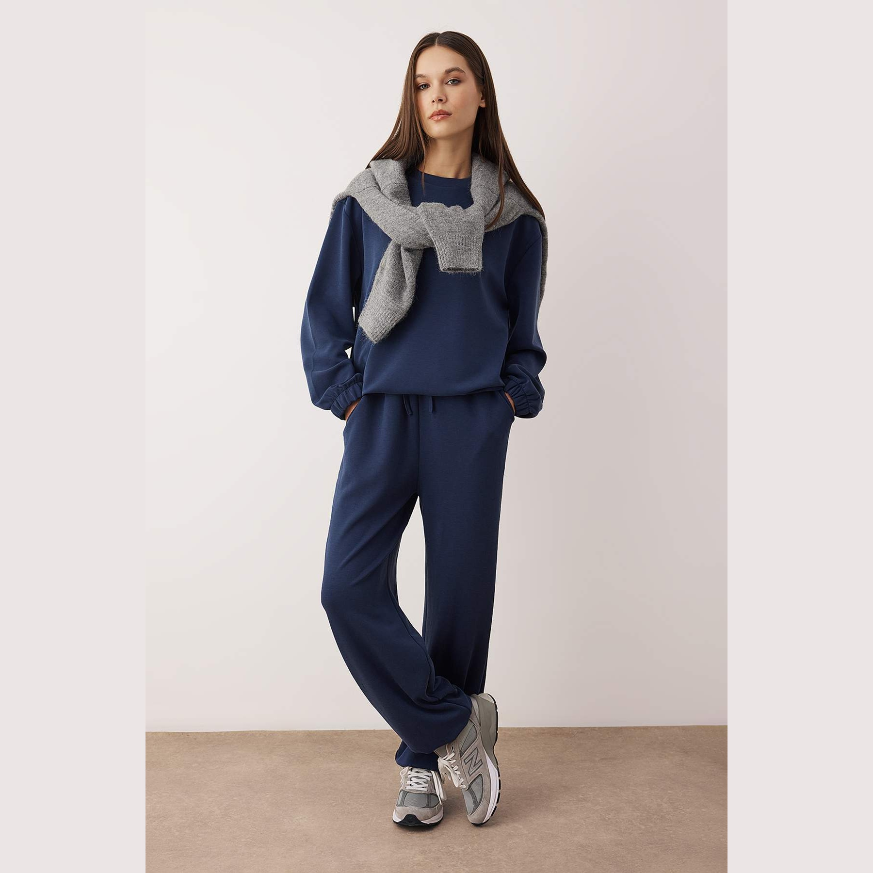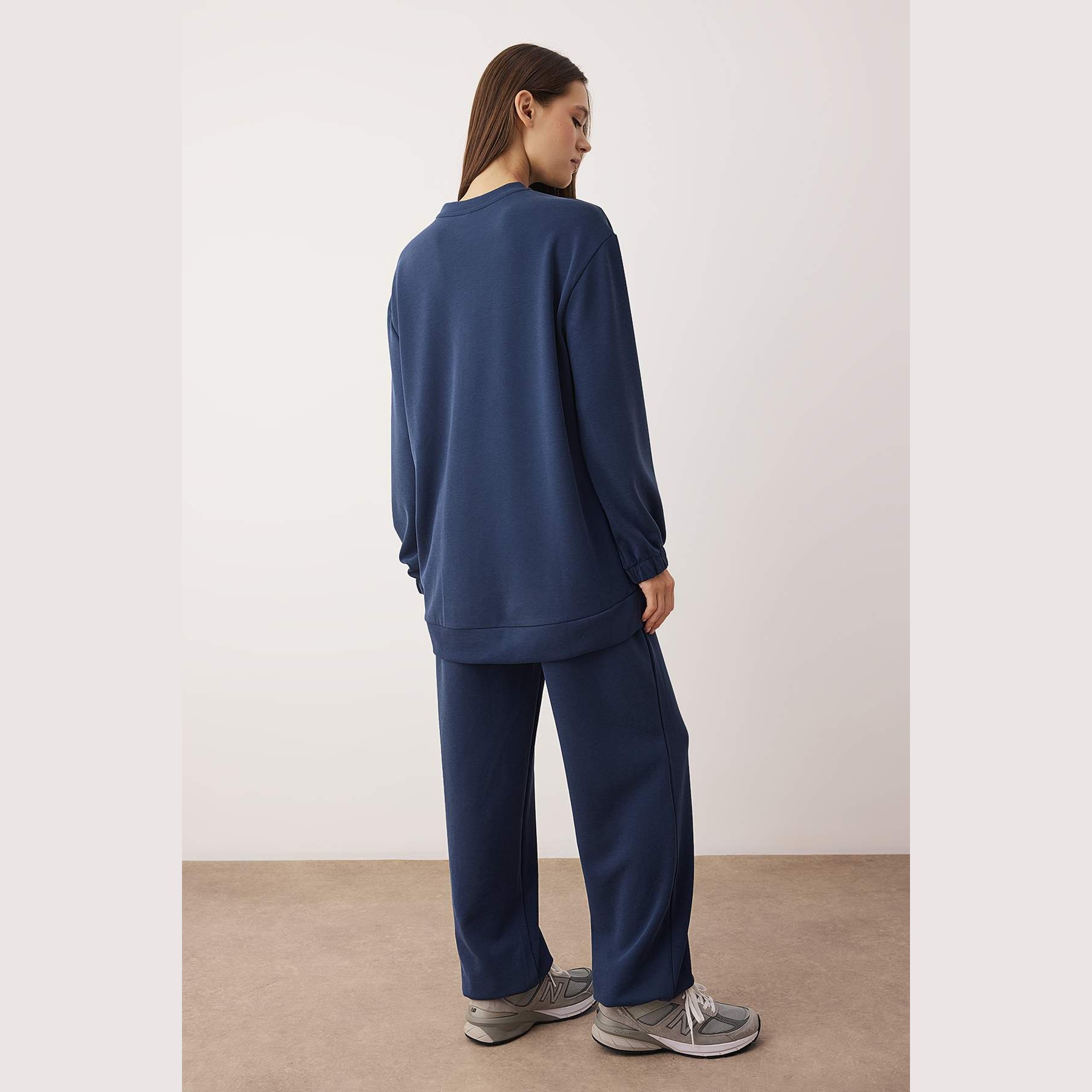 طقم أنيق بلون كحلي سادة داكن من مجموعة Trendyolmilla Modest – Care Collection | More Sustainable، يجمع بين الراحة اليومية والأناقة المحتشمة، بتصميم مكوّن من كنزة طويلة بأكمام منخفضة وبنطال بأرجل مطاطية. يتميز بقصة واسعة (Oversize) وخامة ناعمة ومرنة بتركيبة مستدامة من %49 مودال، %46 بوليستر، %5 إيلاستان، ما يجعله مثاليًا للإطلالات العملية في المواسم المعتدلة.