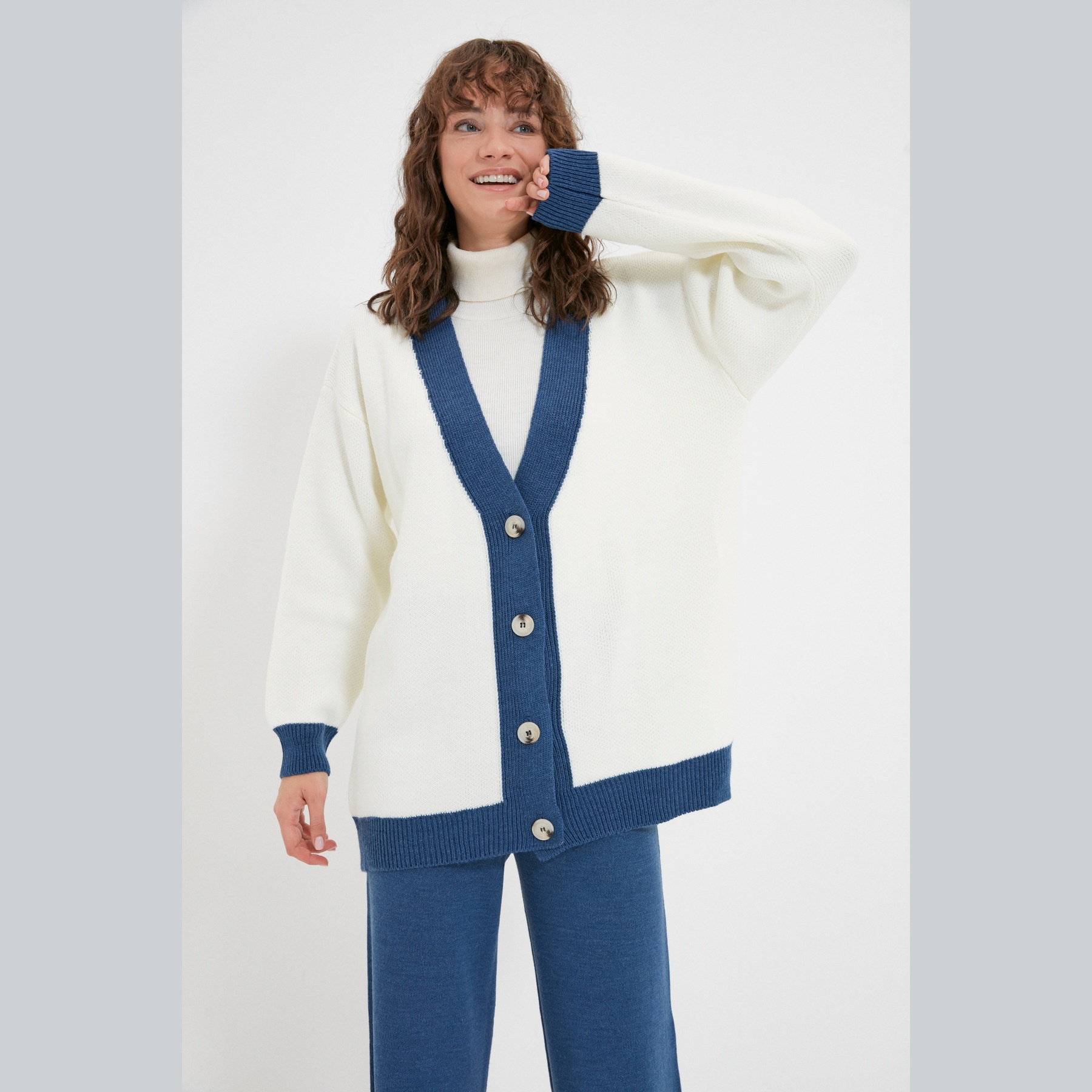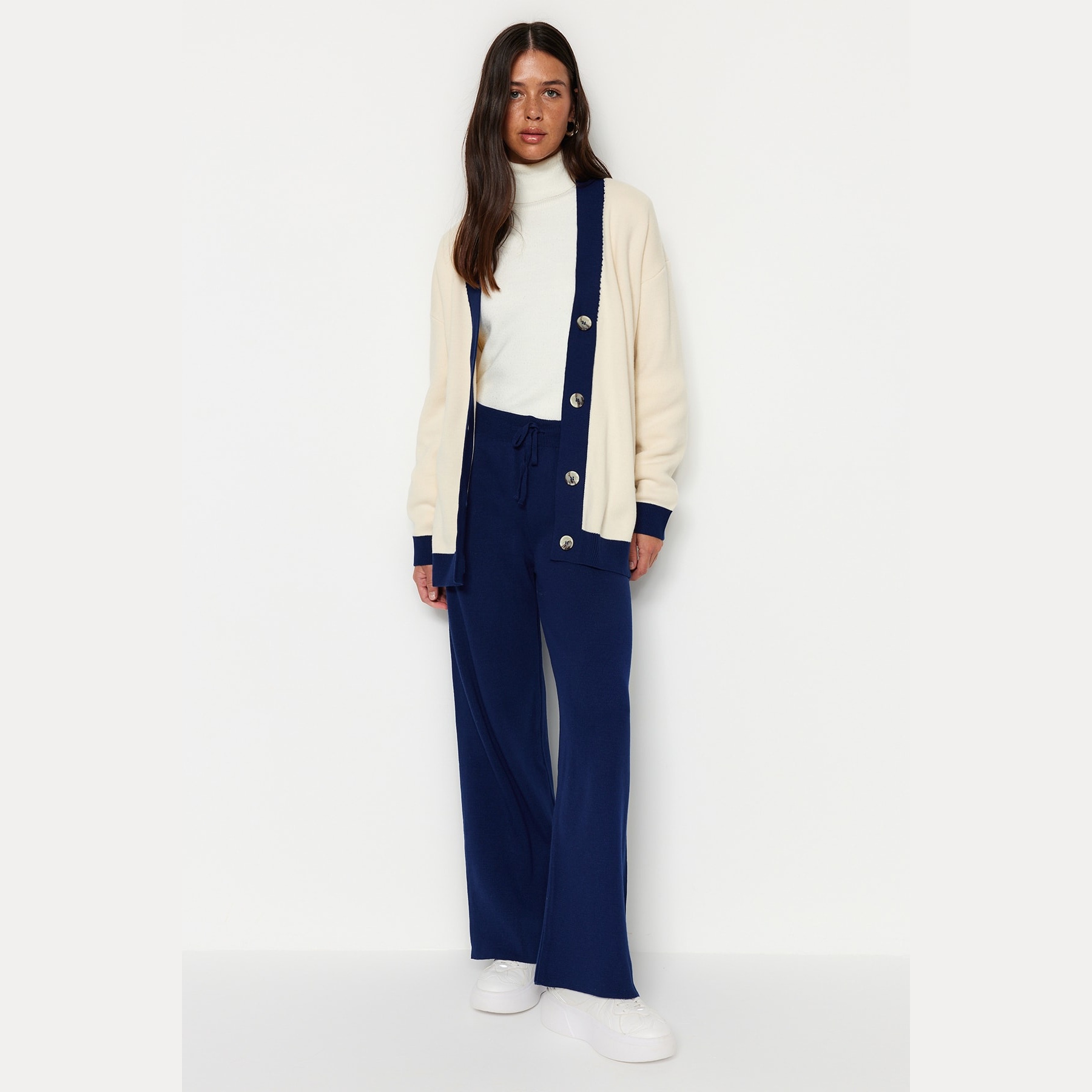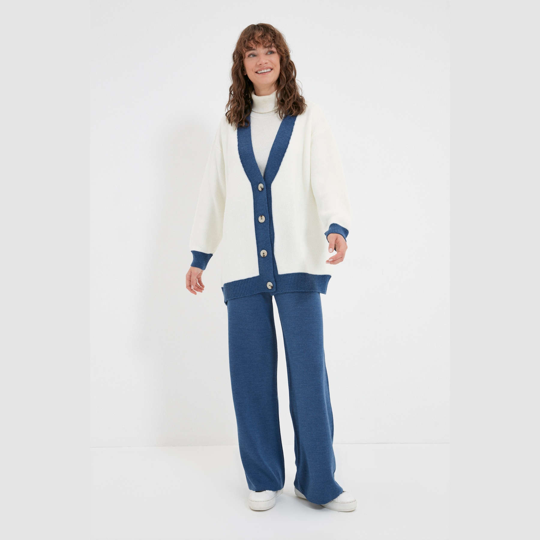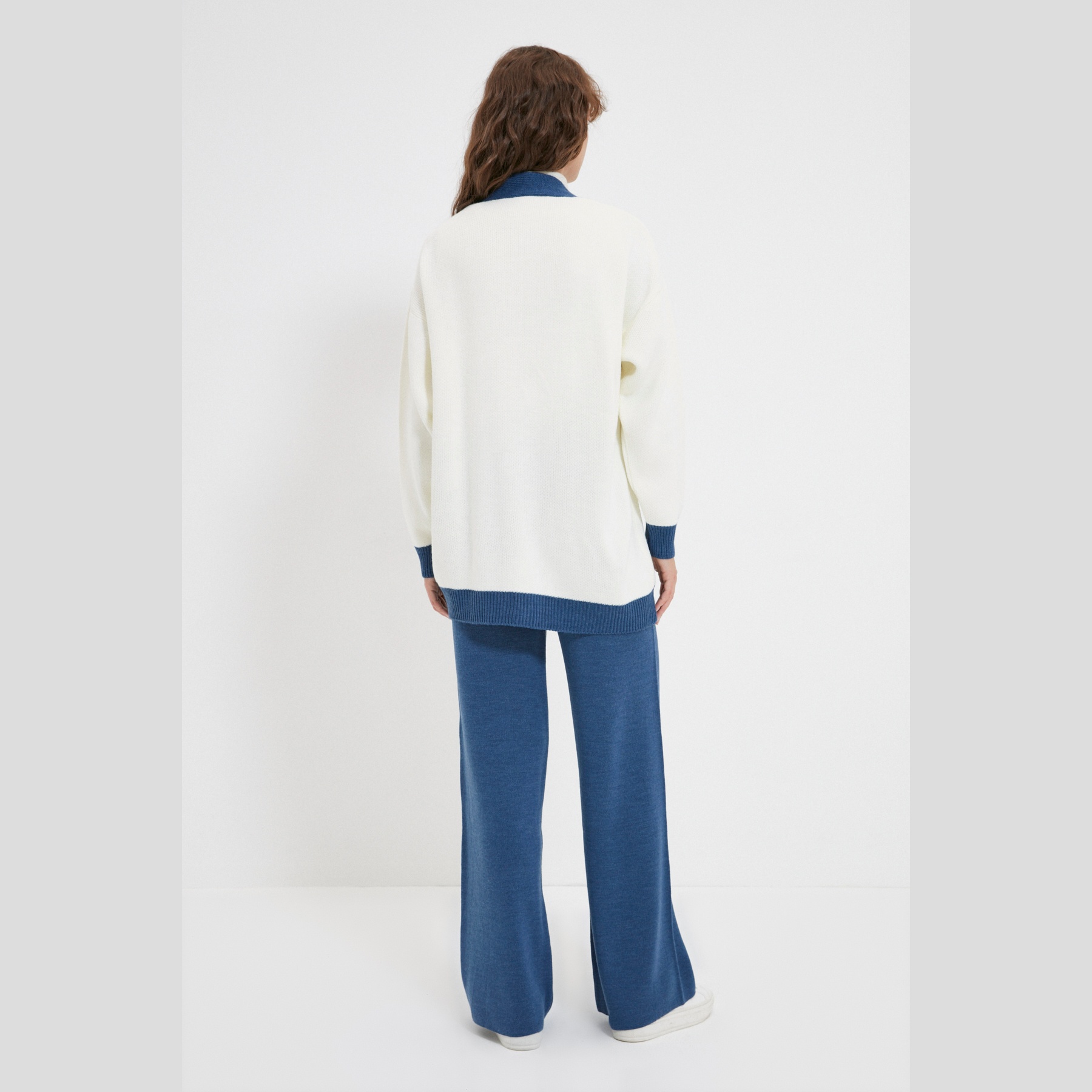 طقم أنيق بلون نيلي موحد مع خطوط متباينة من مجموعة Trendyolmilla Modest – لأناقة شتوية مريحة ومحتشمة بلمسة عصرية، يتكون من كنزة طويلة بأزرار أمامية وبنطال واسع بخصر مرتفع، مصنوع من خامة تريكو ناعمة ومضلعة بتركيبة 100% أكريليك، ما يجعله مثاليًا للأجواء الباردة والإطلالات اليومية المحتشمة.