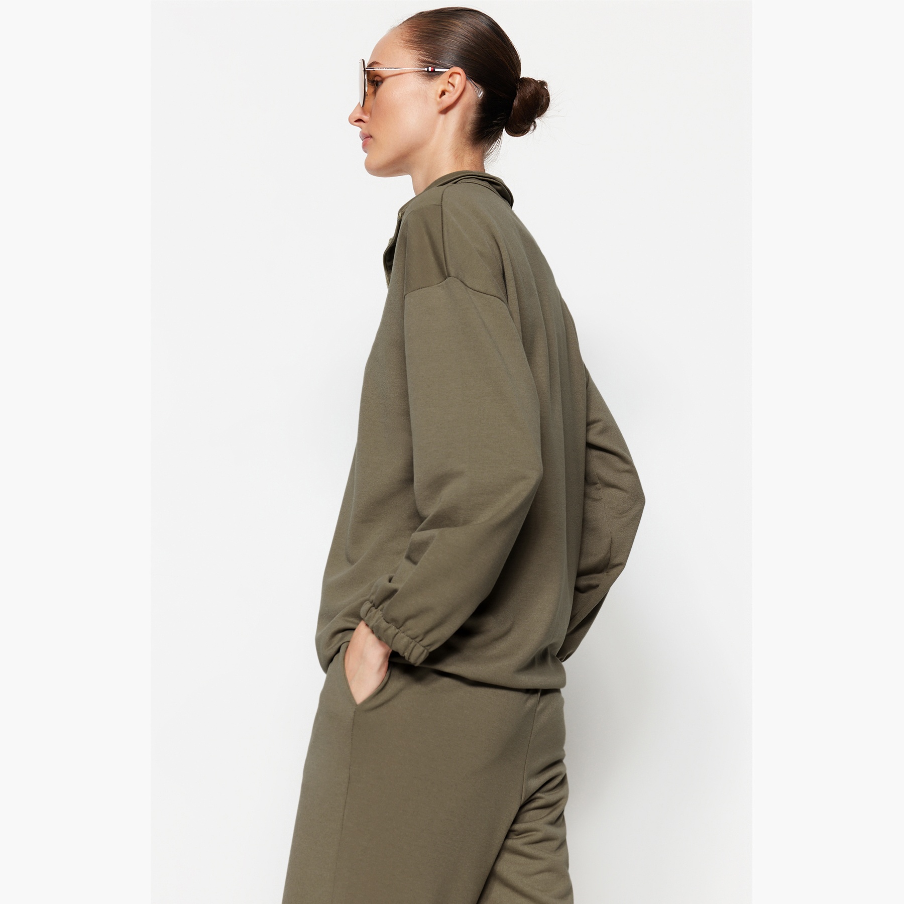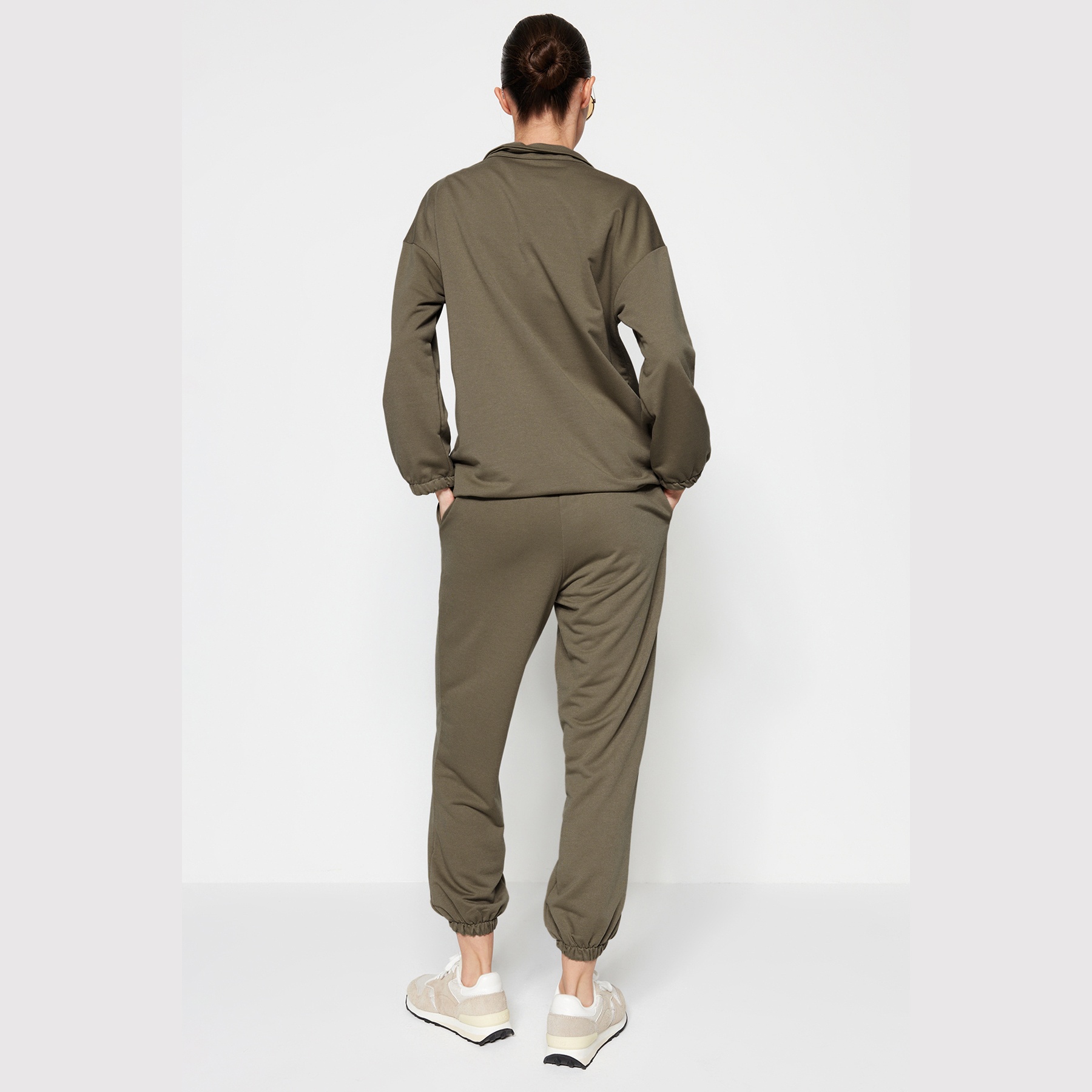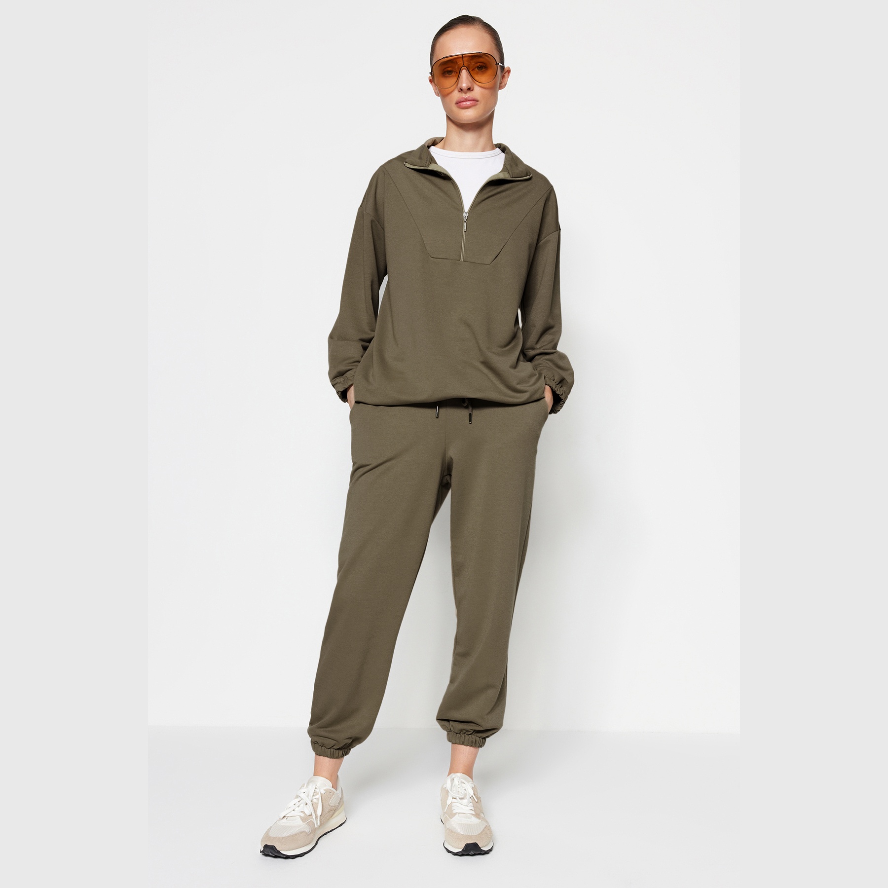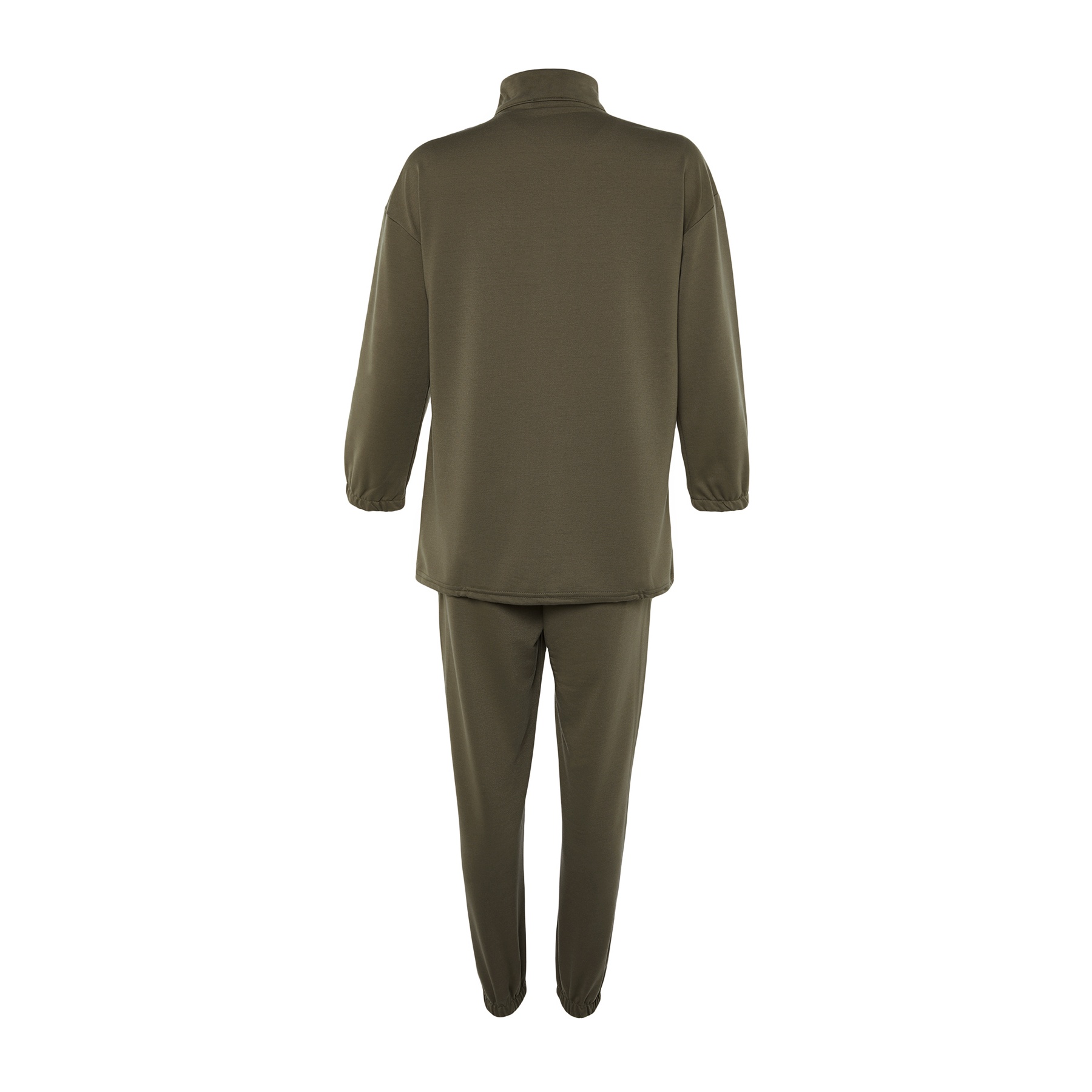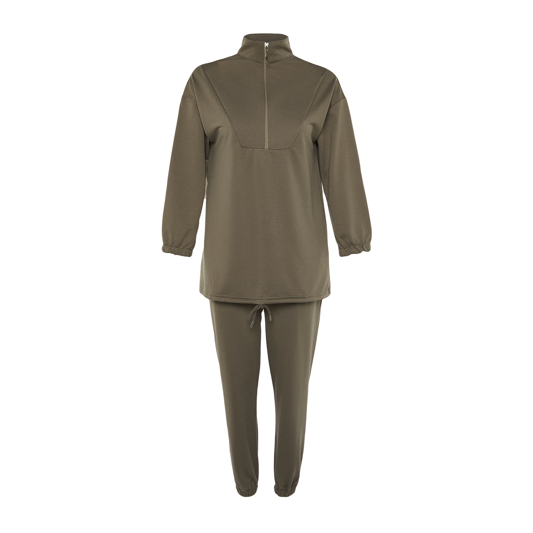 طقم رياضي أنيق بلون زيتي داكن موحد من مجموعة Trendyolmilla Modest – لأناقة يومية مريحة ومحتشمة بلمسة عملية، يتكون من كنزة بسحاب وياقة عالية مع بنطال بأرجل ضيقة وأطراف مجمّعة، مصنوع من خامة قطنية مرنة ومريحة بتركيبة %74 قطن، %21 بوليستر، %5 إيلاستان، ما يجعله مثاليًا للأجواء المعتدلة والارتداء اليومي.