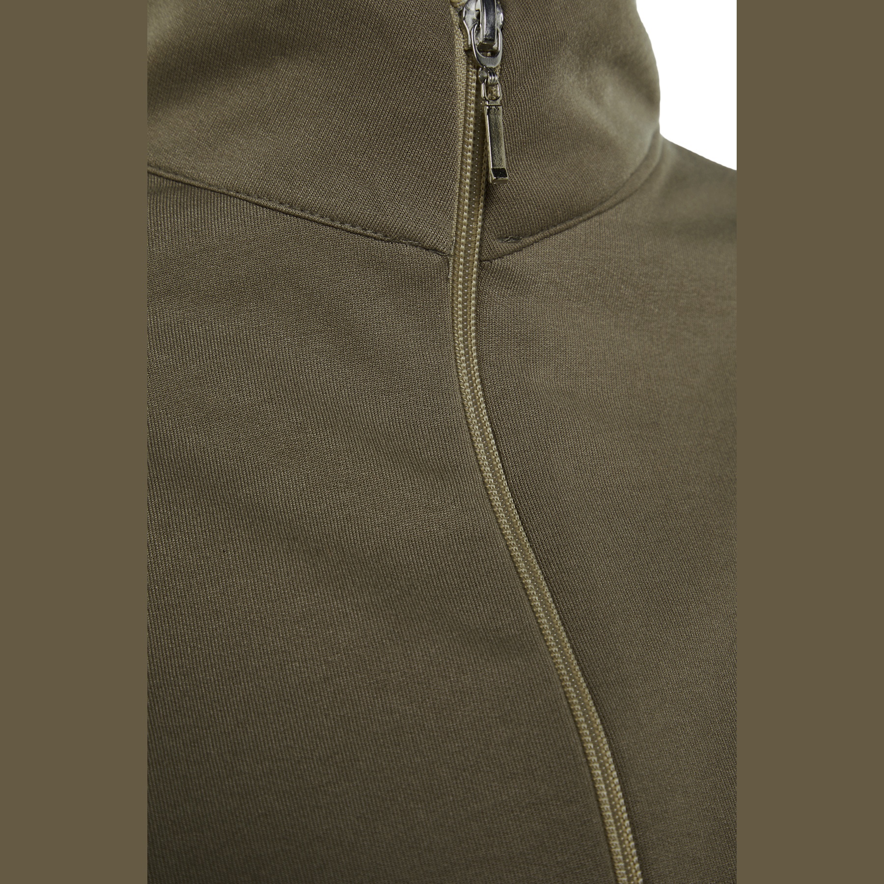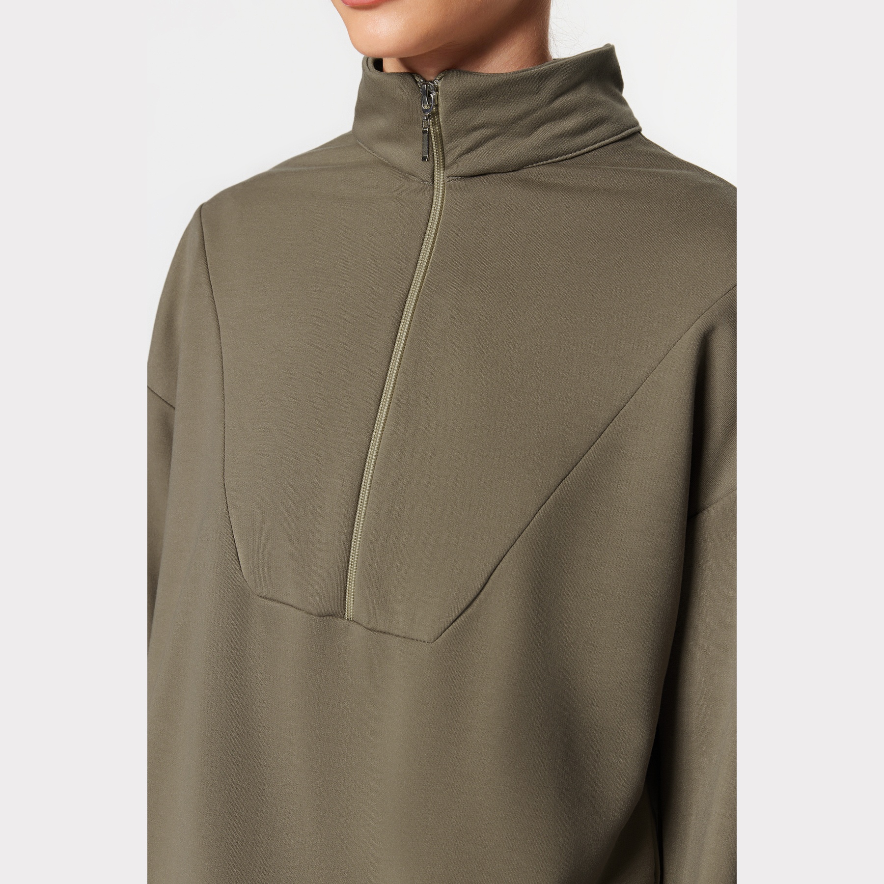 طقم رياضي نسائي – زيتي داكن بسحاب وياقة عالية مع أطراف مجمّعة (قماش قطني مرن، تصميم محتشم)