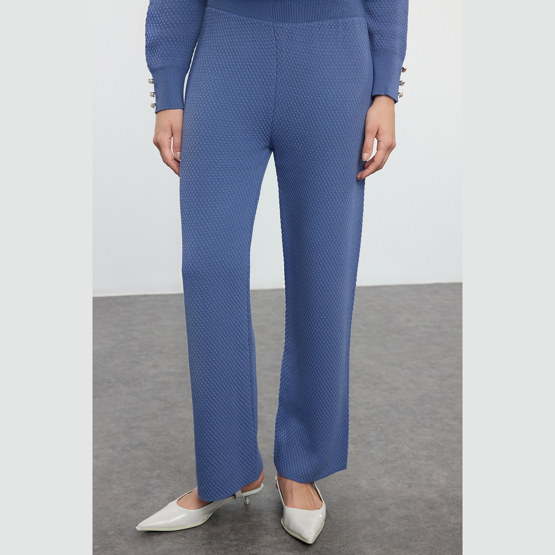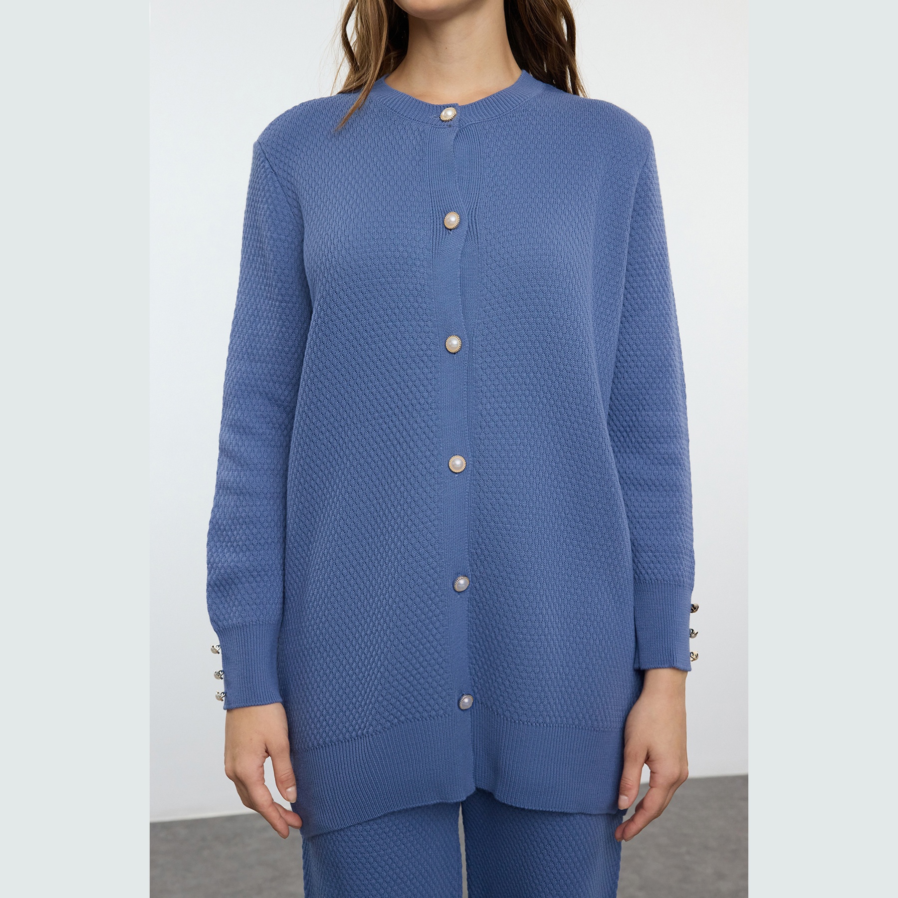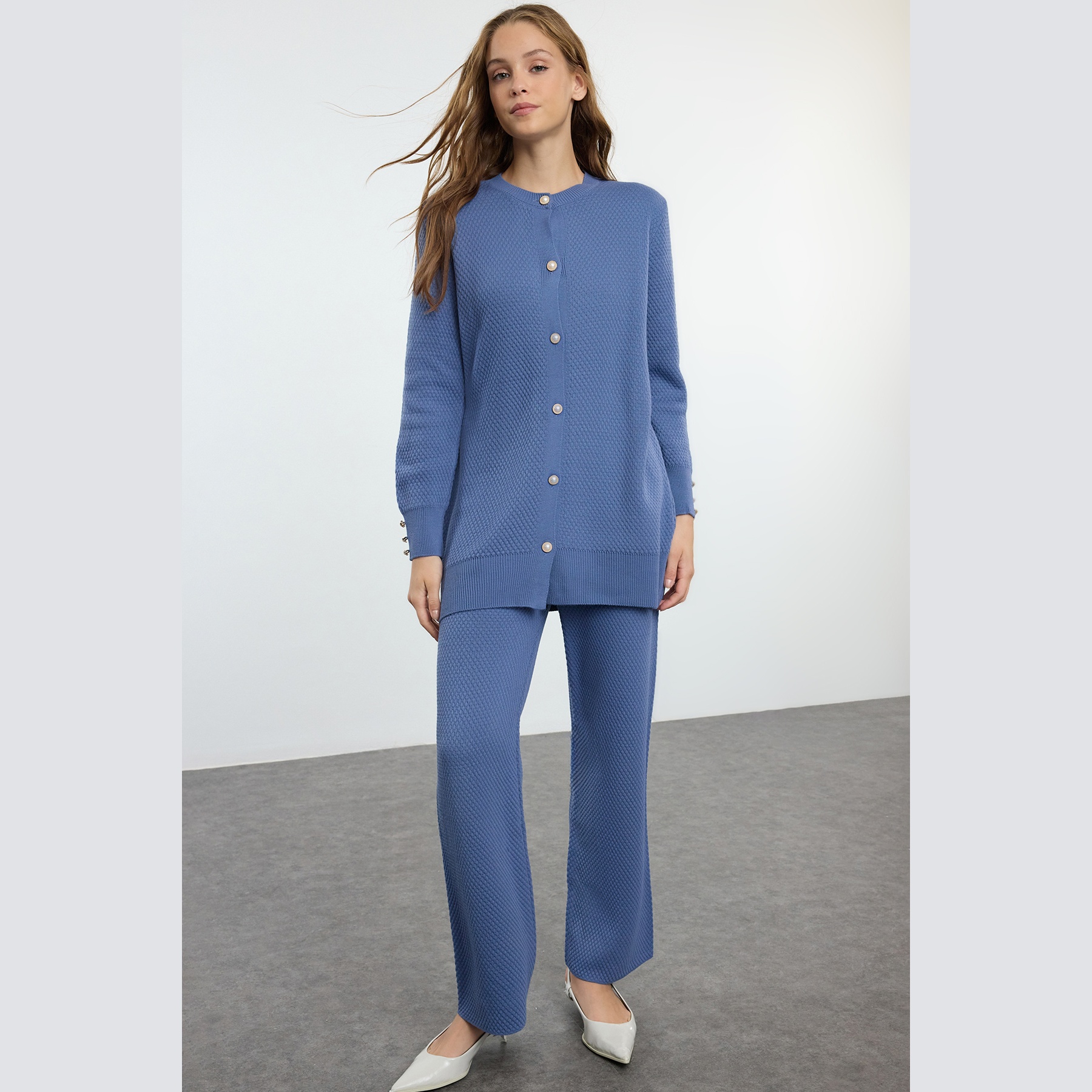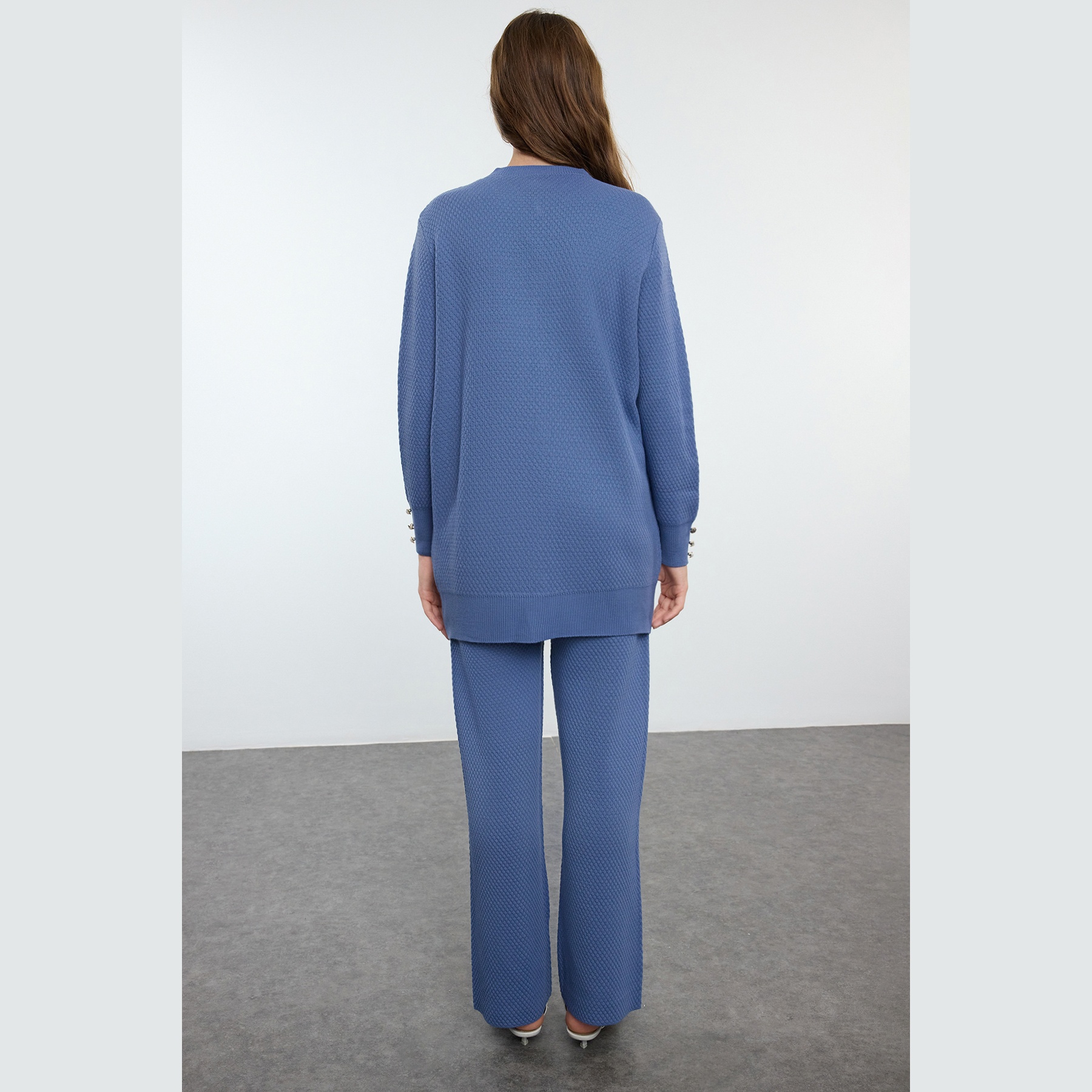 طقم أنيق بلون نيلي موحد من مجموعة Trendyolmilla Modest – لأناقة شتوية ناعمة ومحتشمة بلمسة أنثوية، يتكون من كنزة طويلة مزينة بأزرار لؤلؤية على الأكمام مع بنطال واسع بخصر مرتفع، مصنوع من خامة تريكو أكريليك مزدوجة الطبقة بملمس دافئ ومريح، ما يجعله مثاليًا للأجواء الباردة والإطلالات اليومية المحتشمة.