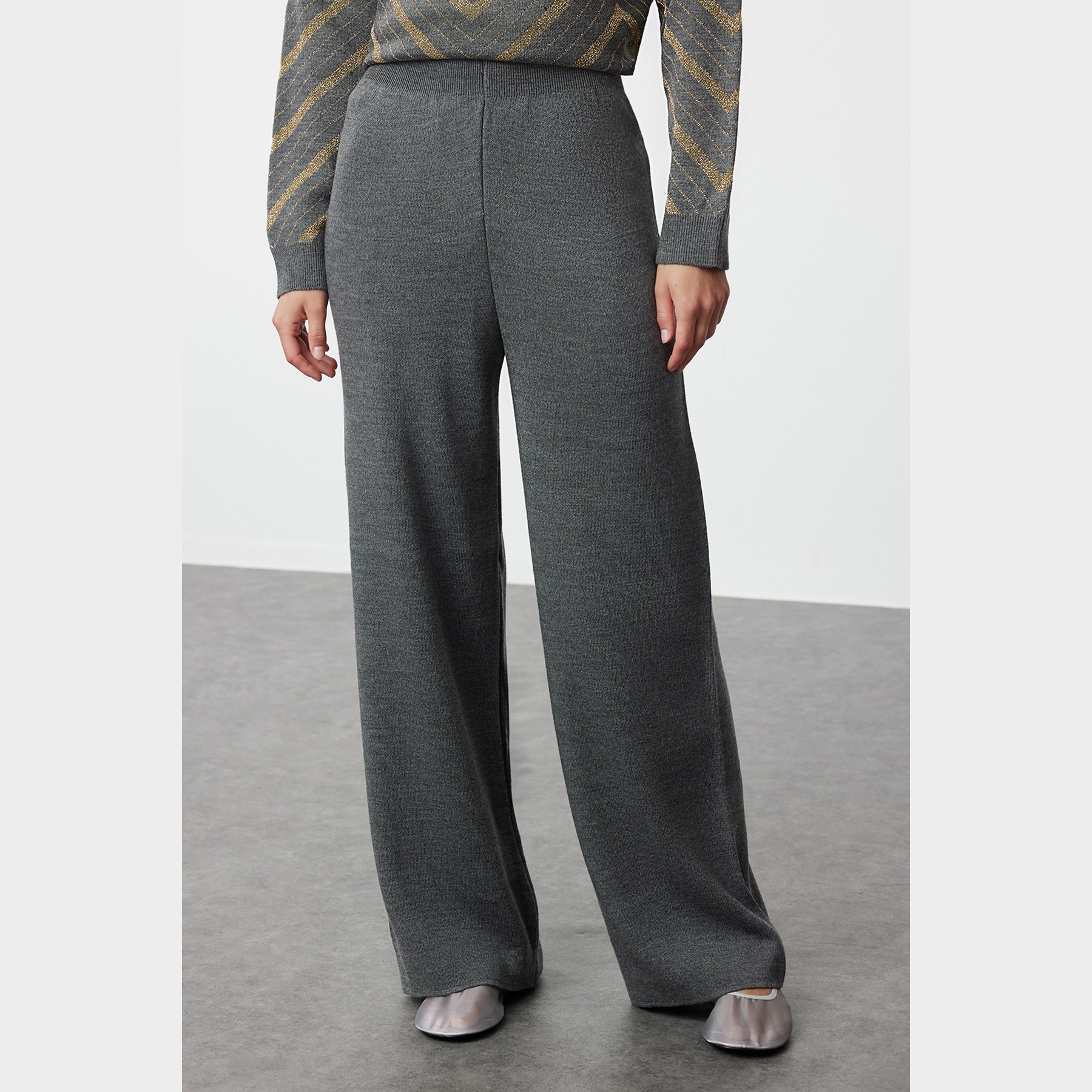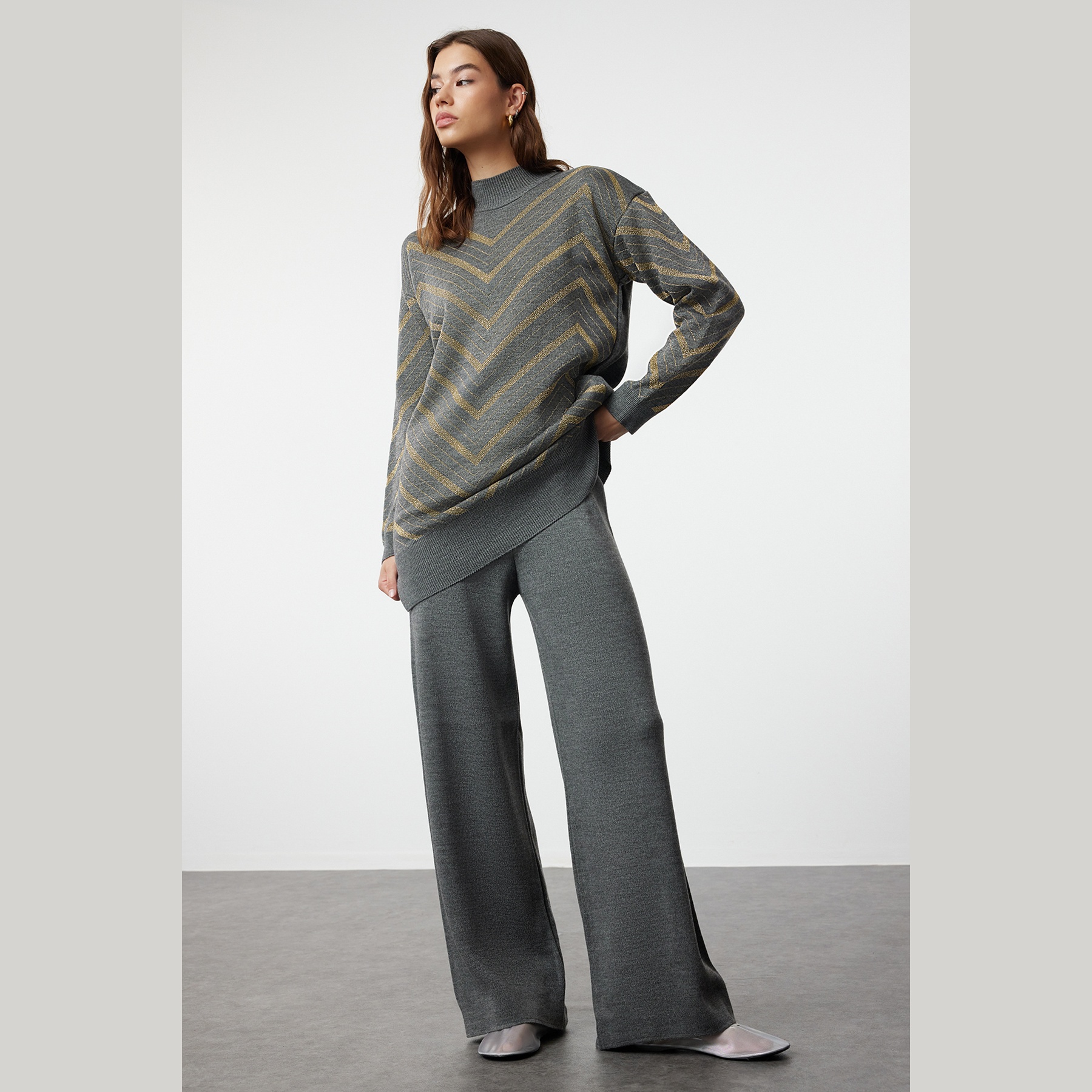 طقم نسائي مكون من كنزة وبنطال – رمادي داكن بخيوط لامعة (قماش تريكو ناعم، تصميم محتشم)