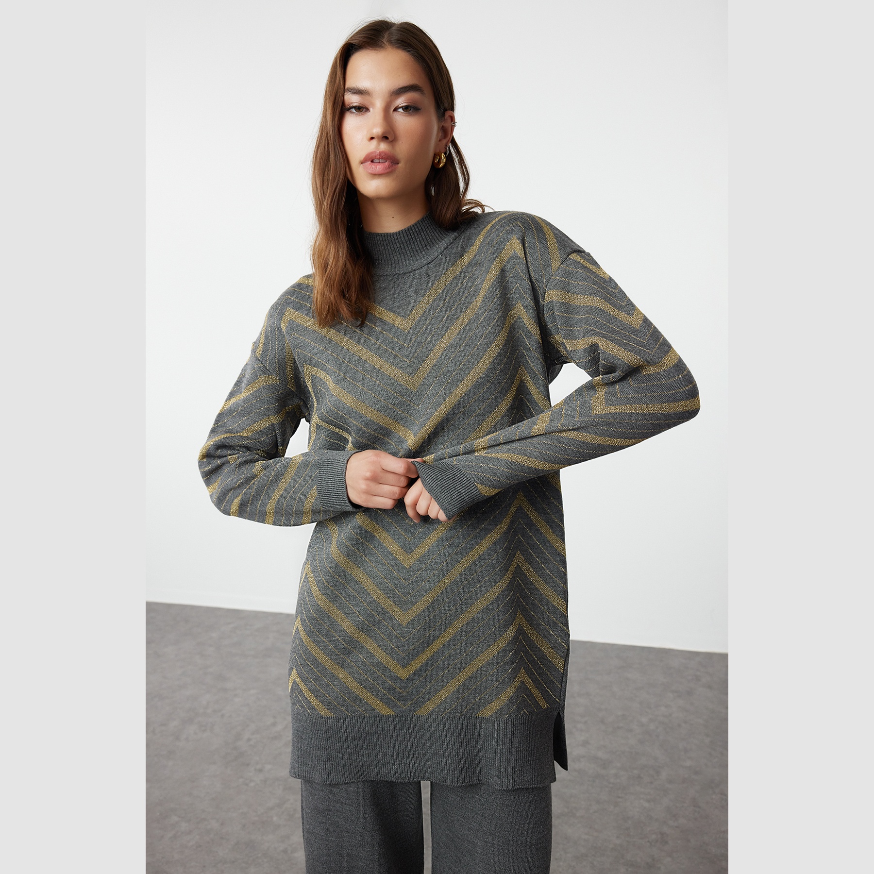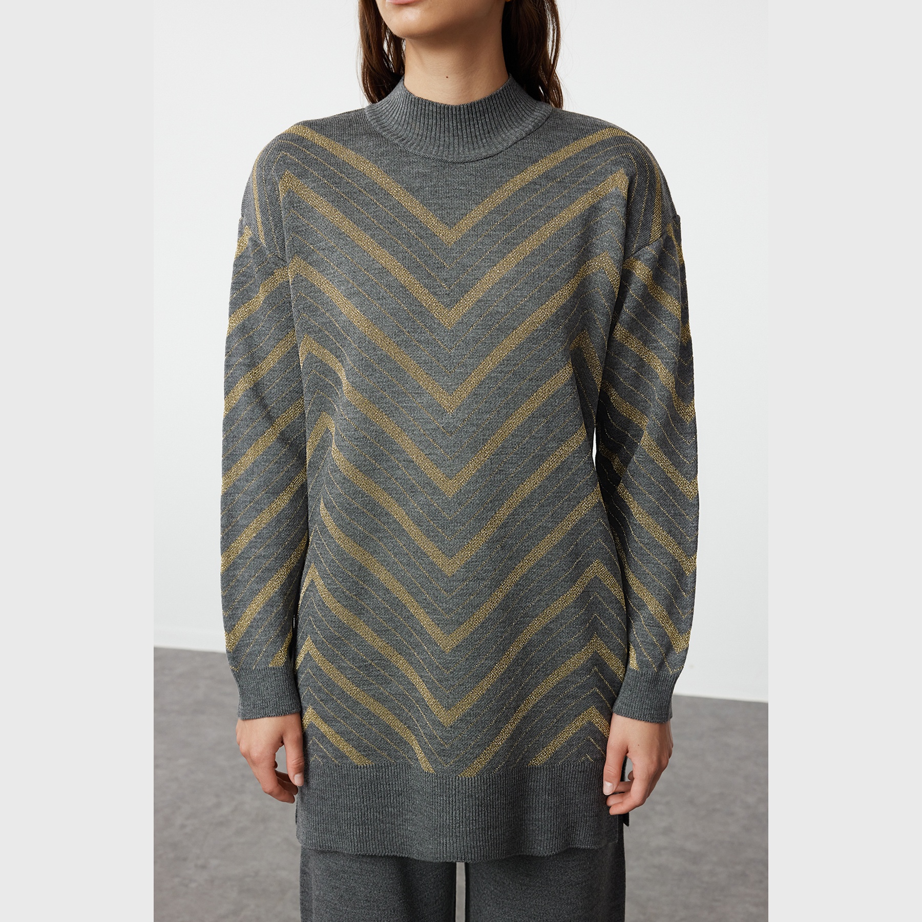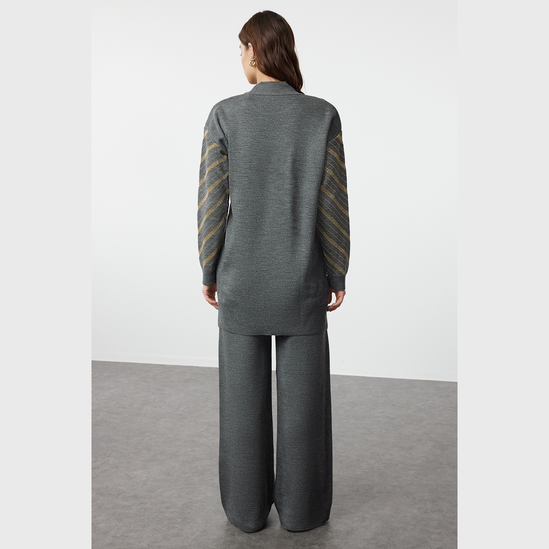 طقم أنيق بلون رمادي داكن موحد من مجموعة Trendyolmilla Modest – لأناقة شتوية مريحة ومحتشمة بلمسة براقة، يتكون من كنزة طويلة بياقة عالية وأكمام منخفضة مع بنطال واسع بخصر مرتفع، مصنوع من خامة تريكو ناعمة بخيوط لامعة (ميتاليك) بتركيبة %95 أكريليك، %3 خيط معدني، %2 بوليستر، ما يجعله مثاليًا للأجواء الباردة والإطلالات اليومية المحتشمة.
