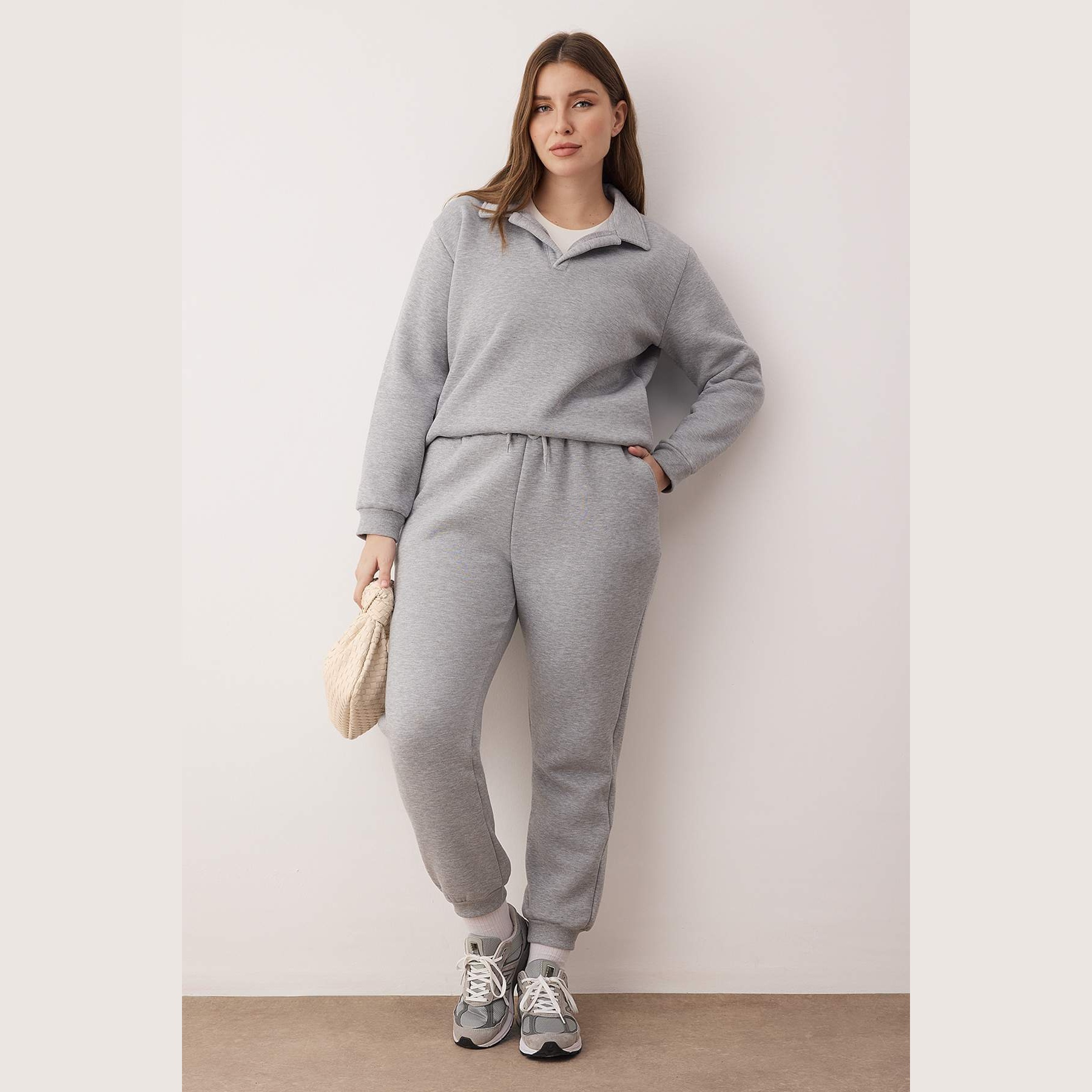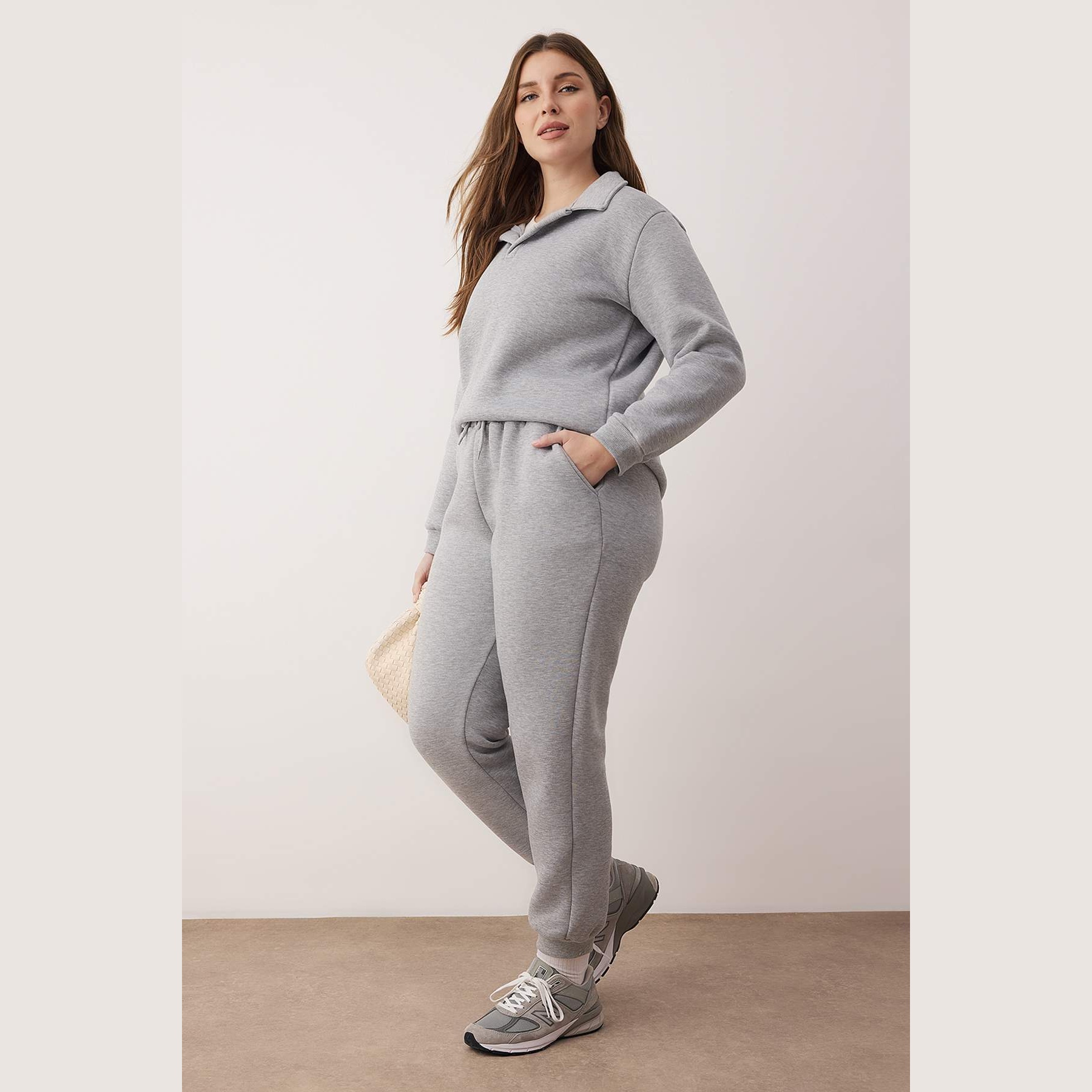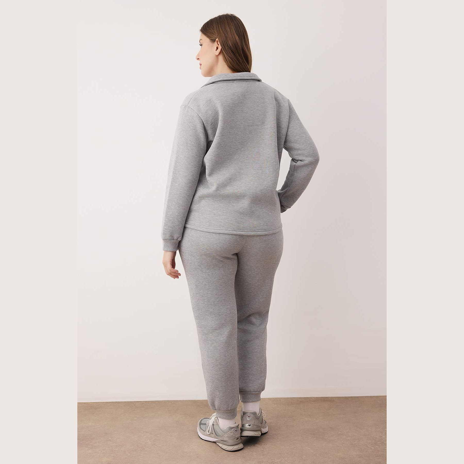 طقم رياضي بلون رمادي فاتح موحد (ميلانج) من مجموعة Trendyolmilla Curve Büyük Beden – لأناقة يومية عملية ومحتشمة بلمسة رياضية مريحة، يتكون من كنزة بياقة بولو طويلة الأكمام مع بنطال بأرجل مطاطية، مصنوع من خامة تريكو خفيفة ومرنة بتركيبة %76 قطن، %18 بوليستر، %6 إيلاستان، ما يجعله مثاليًا للأجواء المعتدلة والارتداء اليومي.