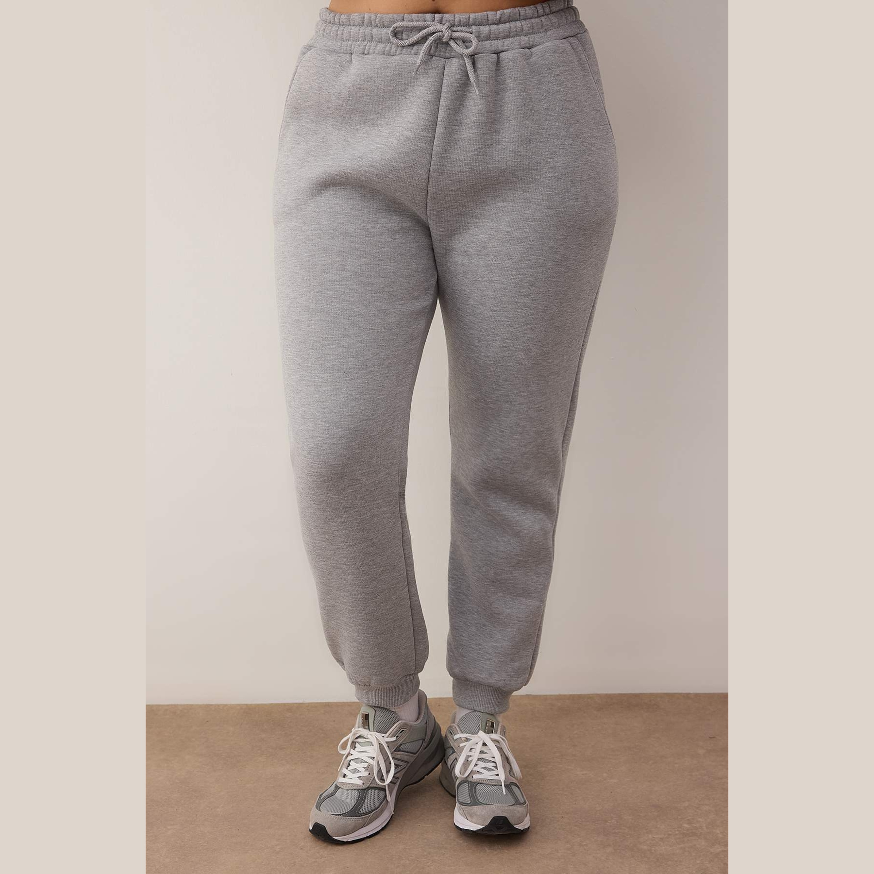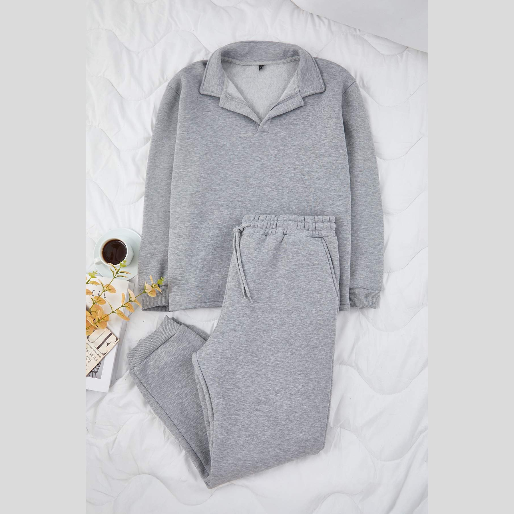 طقم رياضي نسائي – رمادي فاتح بياقة بولو وأرجل مطاطية (قماش خفيف، تصميم محتشم)