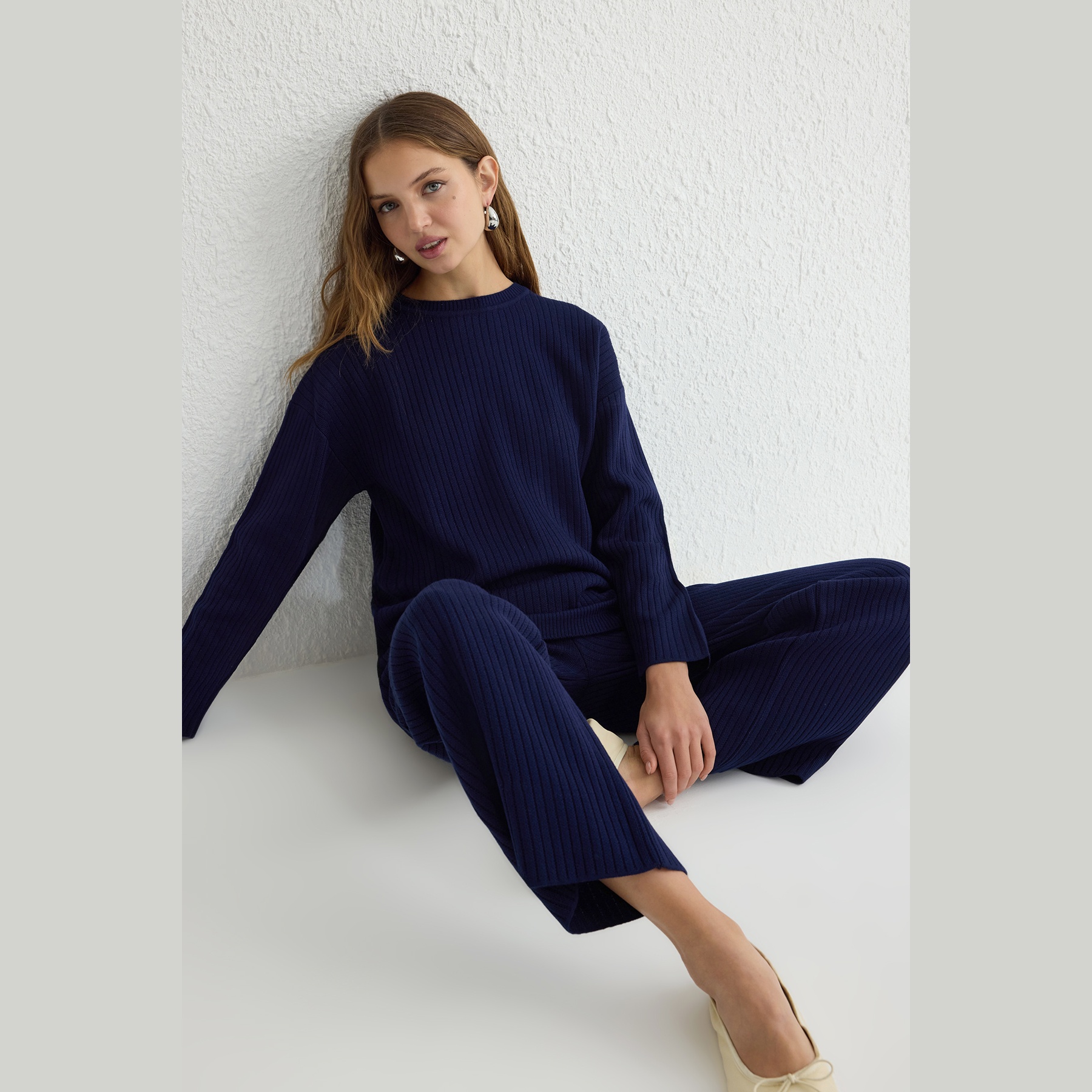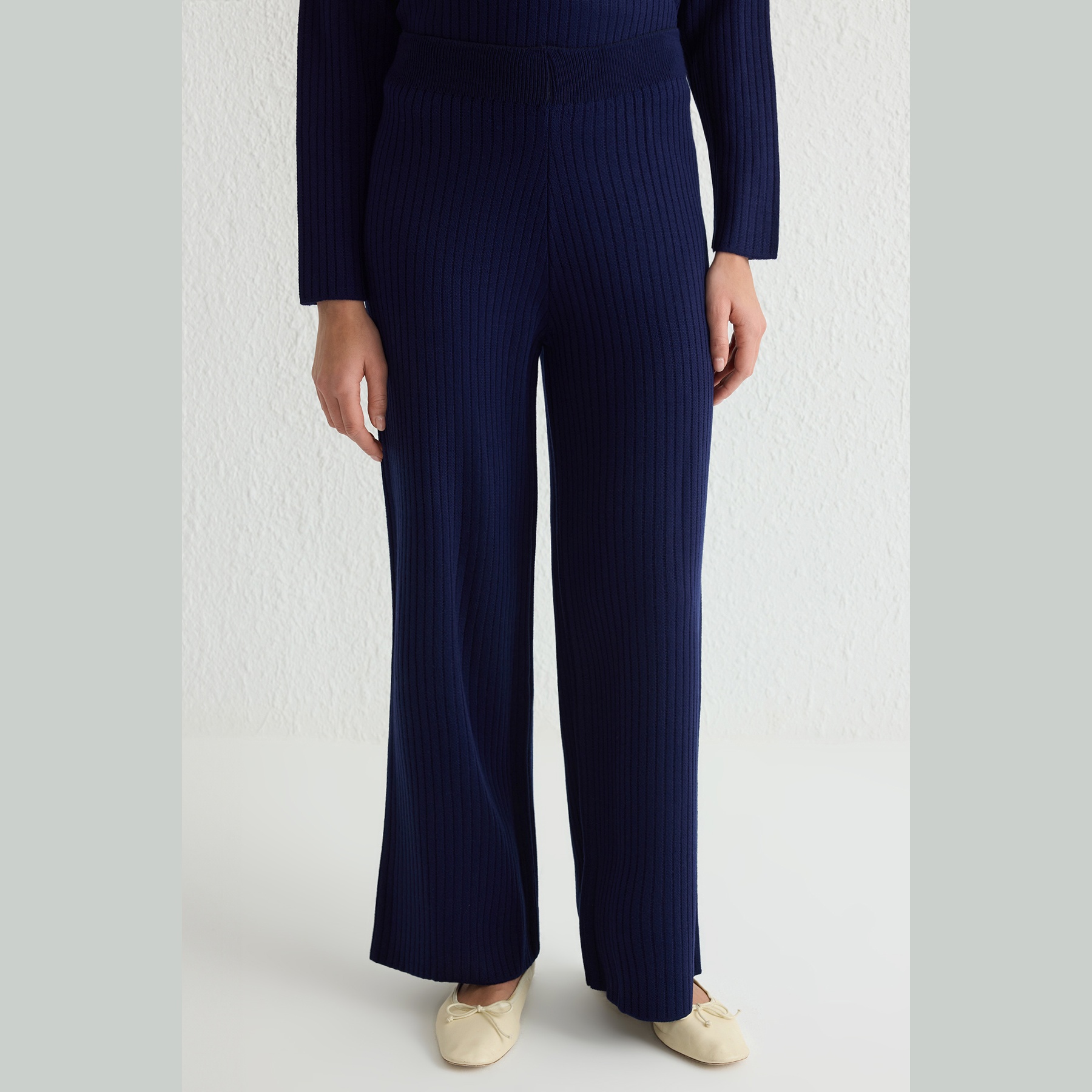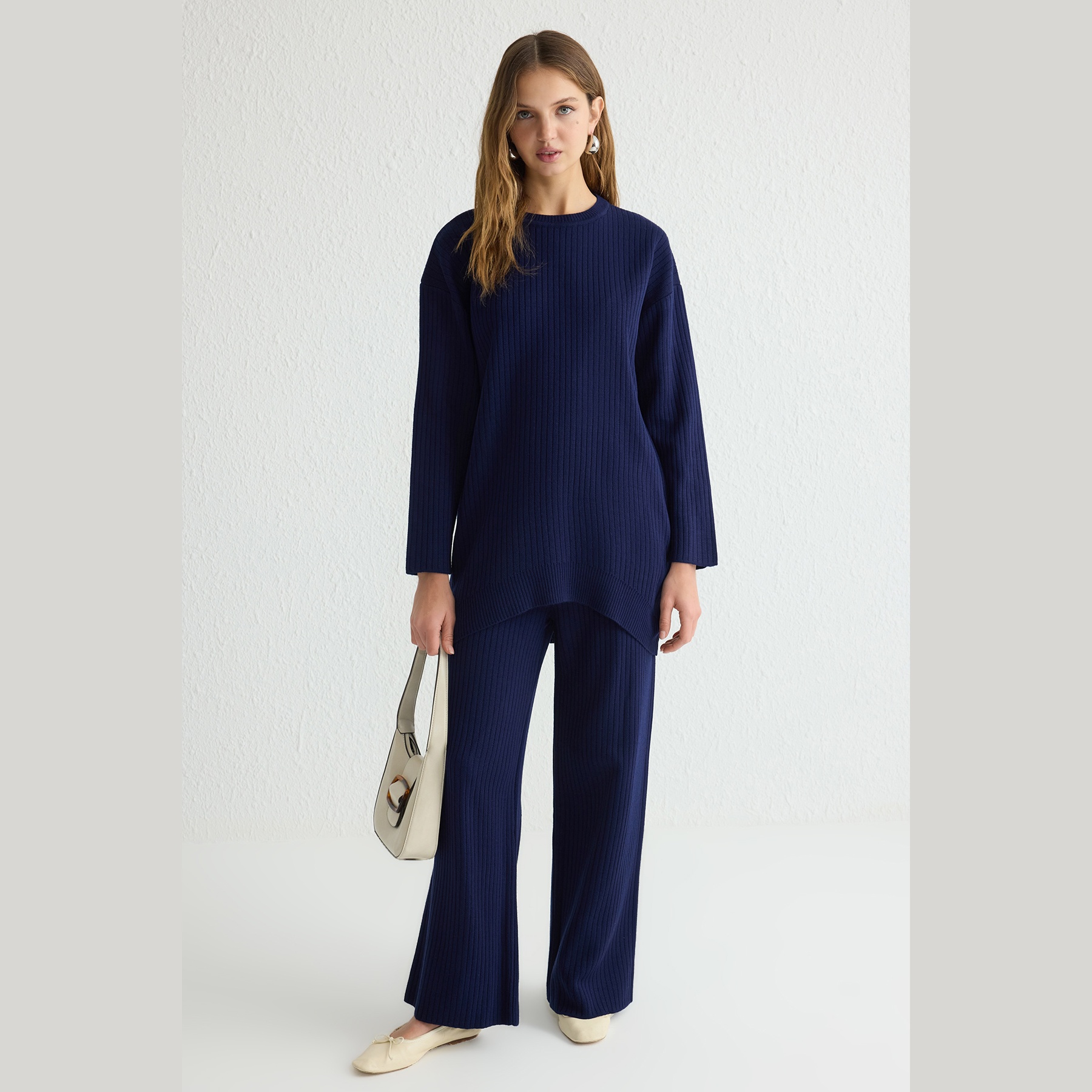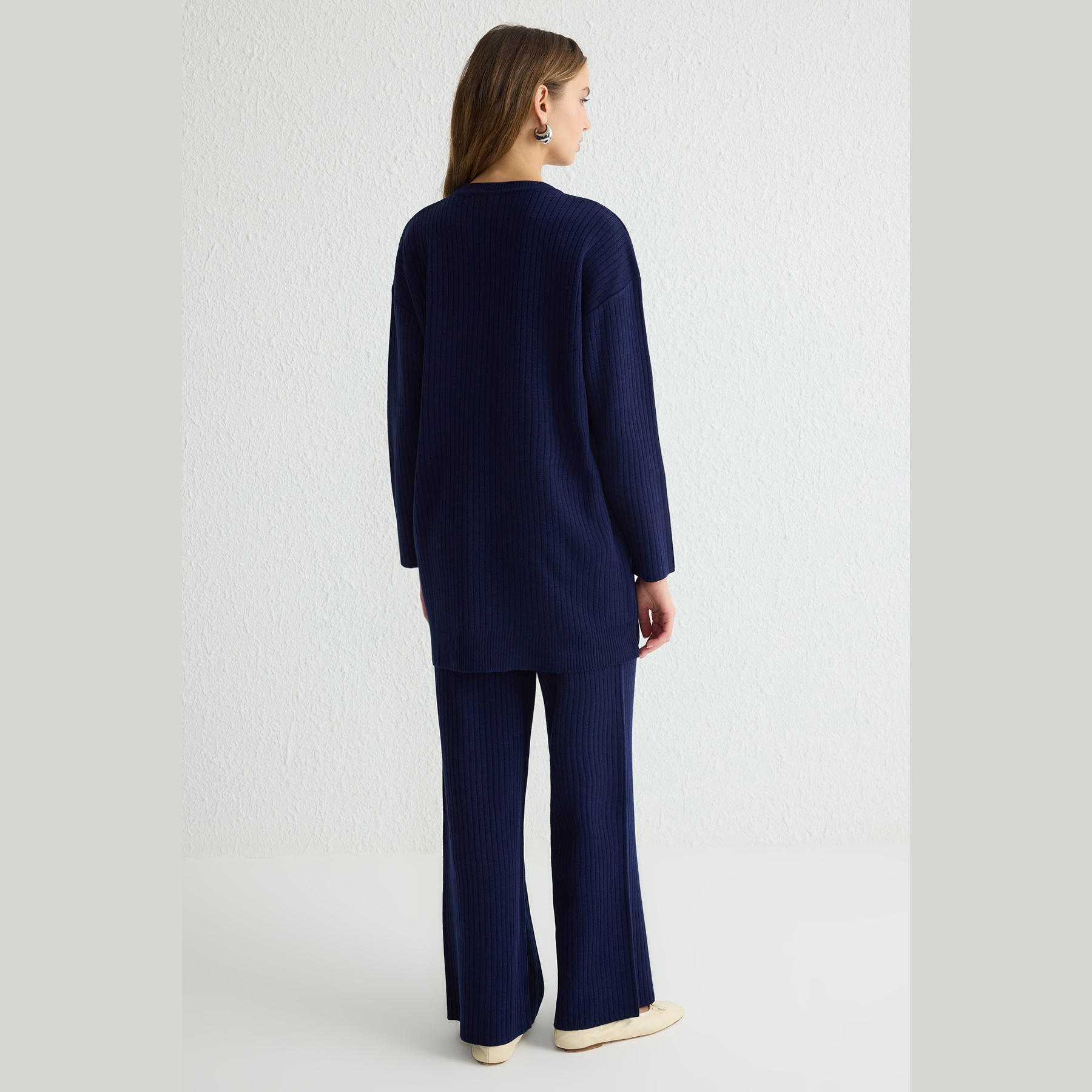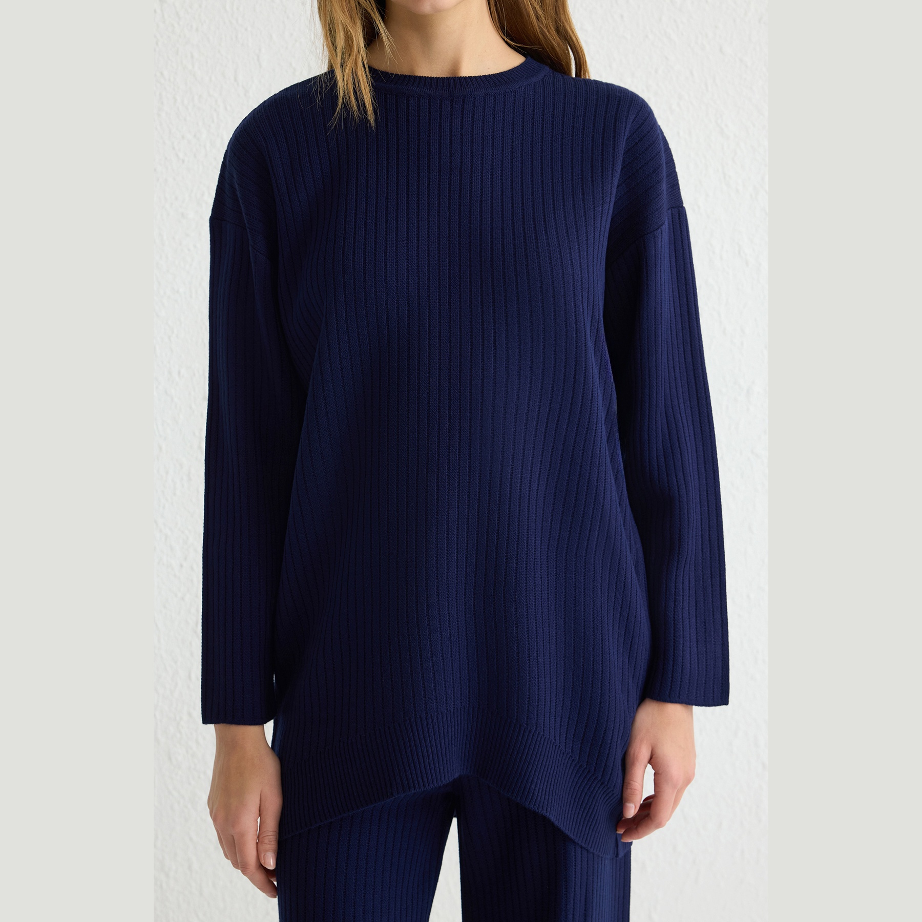 طقم أنيق بلون كحلي موحد من مجموعة Trendyolmilla Modest – لأناقة شتوية مريحة ومحتشمة بلمسة عملية، يتكون من كنزة طويلة بقصة واسعة وياقة دائرية مع بنطال مريح بخصر مطاطي، مصنوع من خامة تريكو مضلع سميك بتركيبة 100% أكريليك، ما يجعله مثاليًا للأجواء الباردة والإطلالات اليومية المحتشمة.