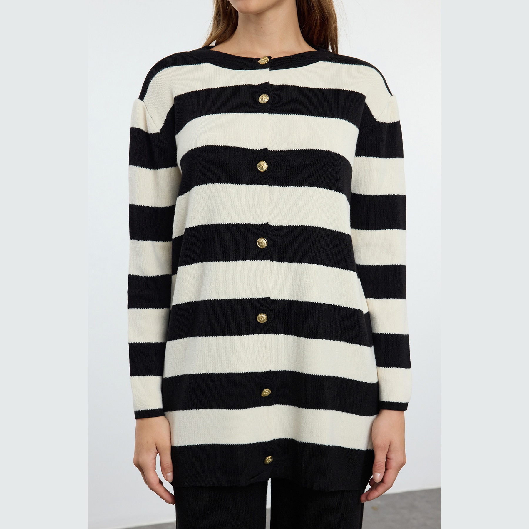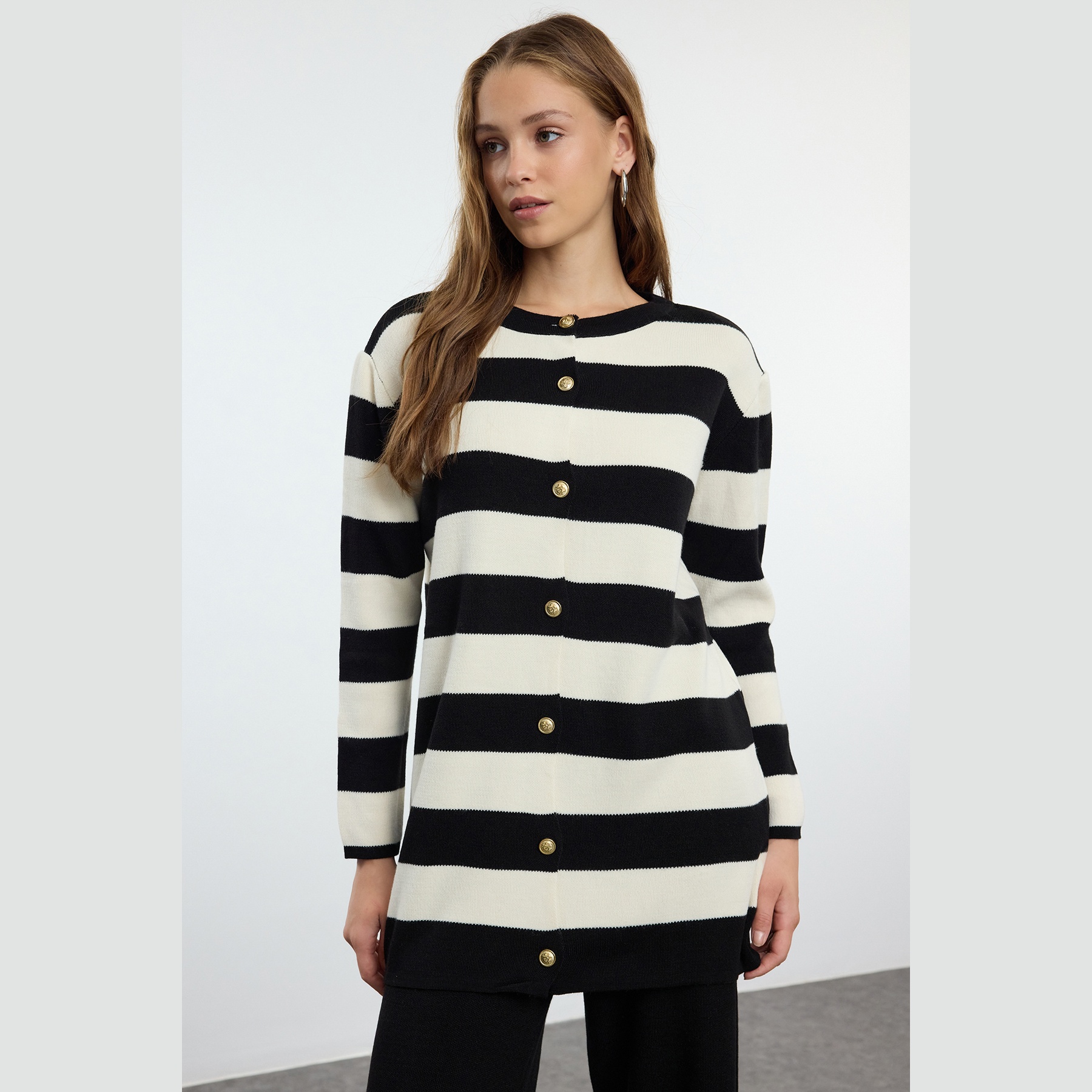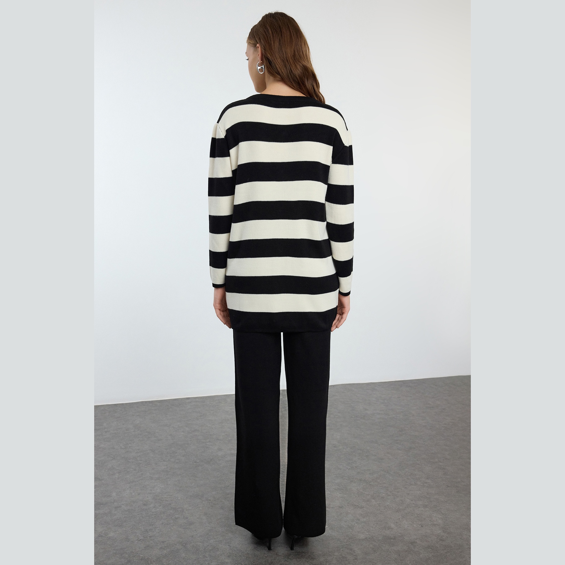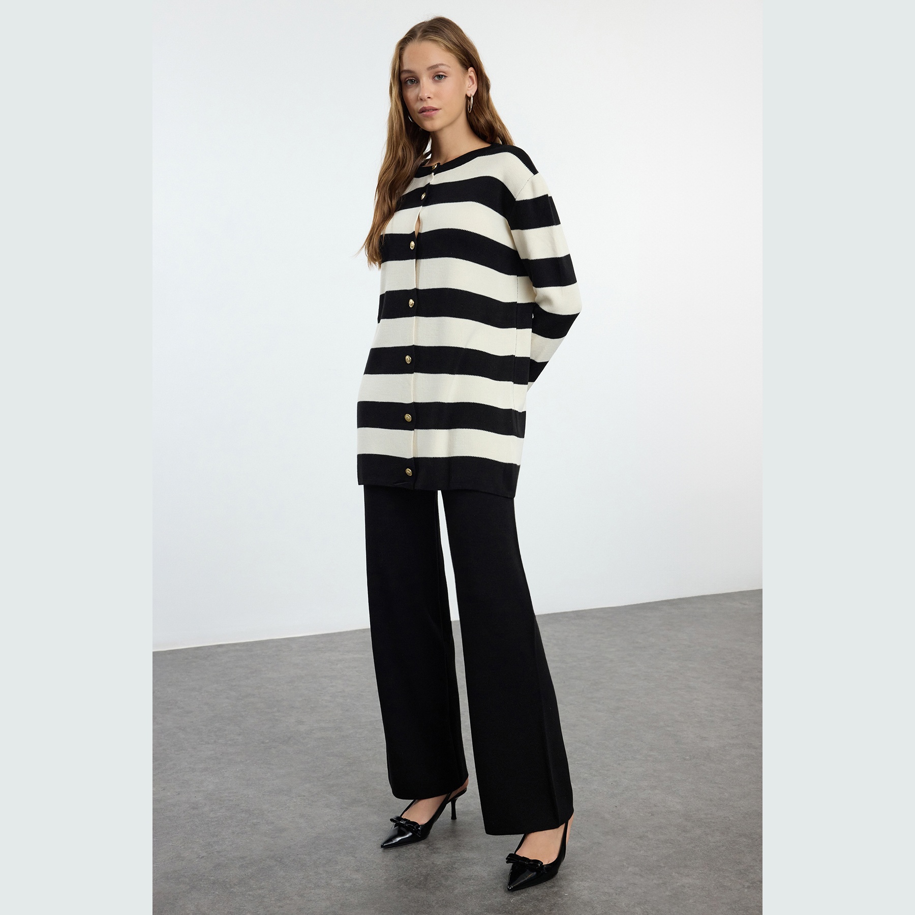 طقم أنيق بلون أسود مزين بخطوط بيج متباينة من مجموعة Trendyolmilla Modest – لأناقة شتوية مريحة ومحتشمة بلمسة عصرية، يتكون من كنزة طويلة بأزرار أمامية وياقة V مع بنطال مستقيم بخصر مرتفع، مصنوع من خامة تريكو جاكار ناعمة بتركيبة 100% أكريليك، ما يجعله مثاليًا للأجواء الباردة والإطلالات اليومية المحتشمة.