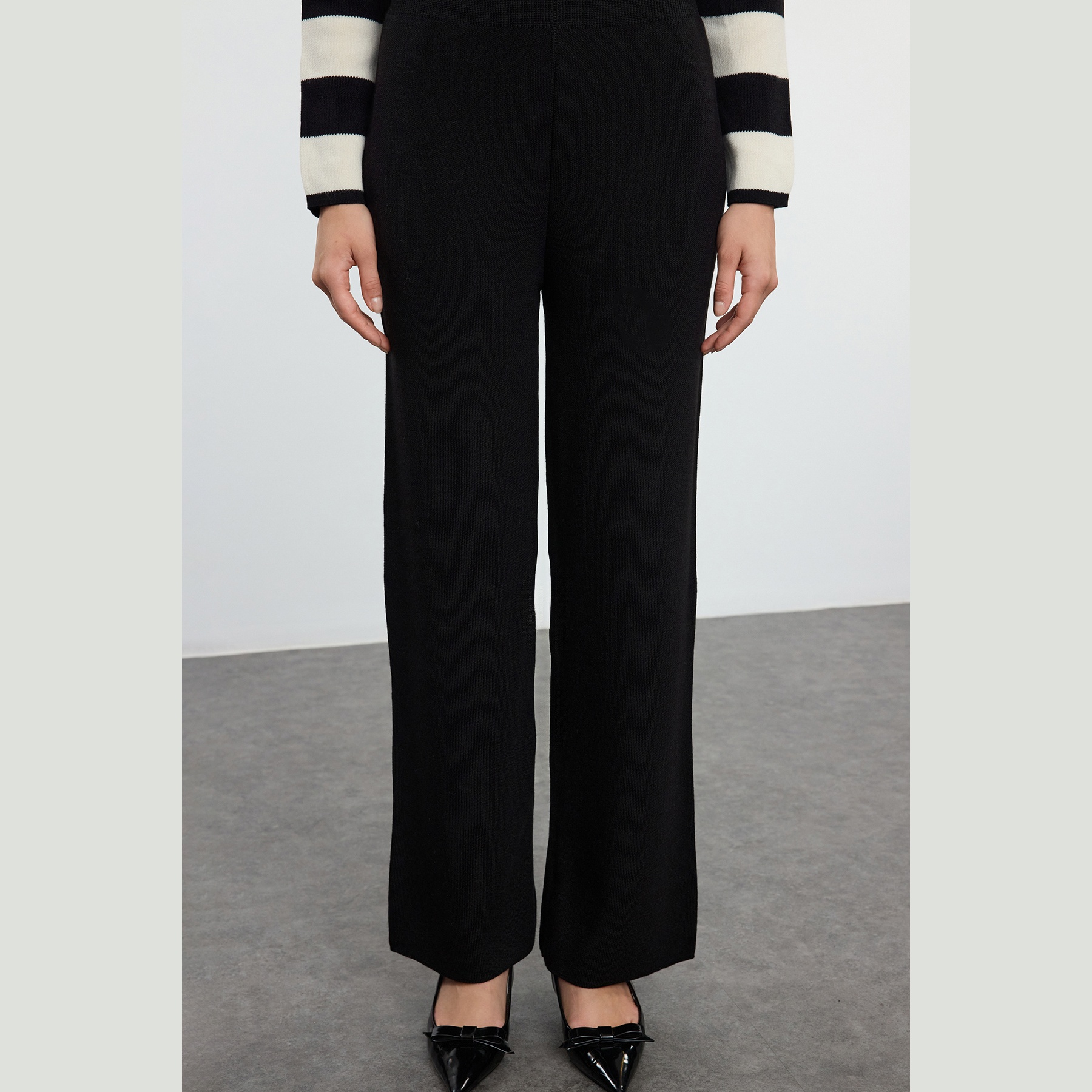 طقم نسائي مكون من كنزة وبنطال – أسود بخطوط متباينة (قماش تريكو جاكار، تصميم محتشم)