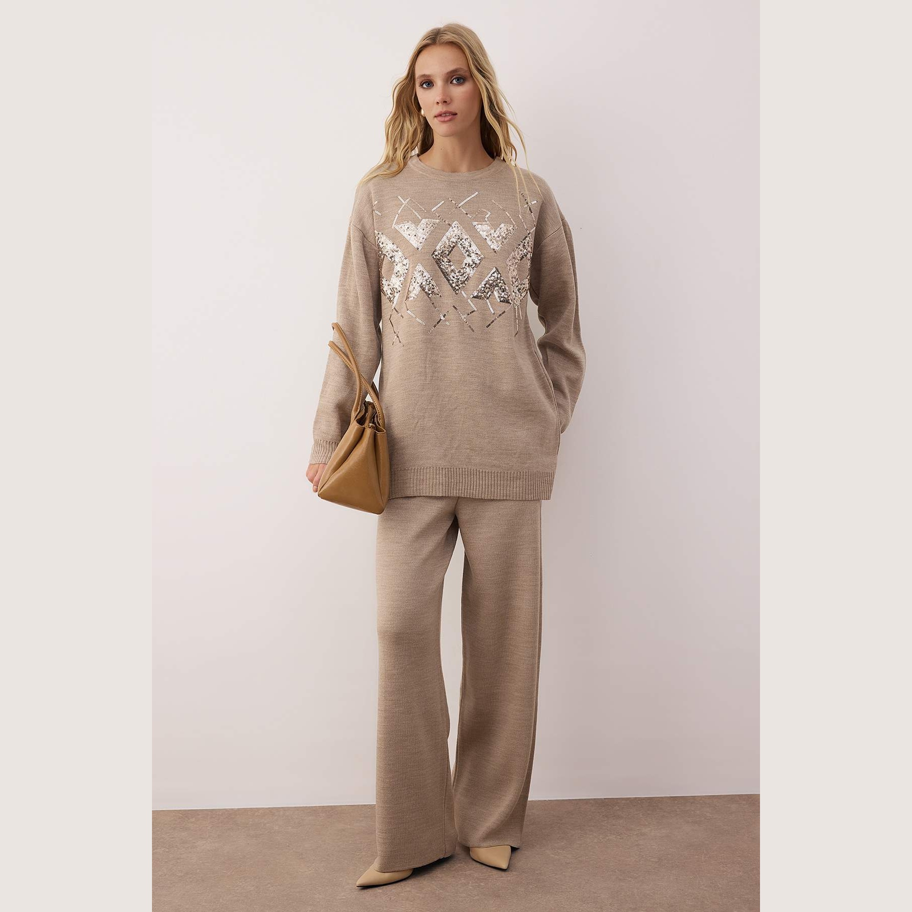 طقم نسائي مكون من كنزة وبنطال – بيج مزين بترتر لامع (قماش تريكو، تصميم محتشم)