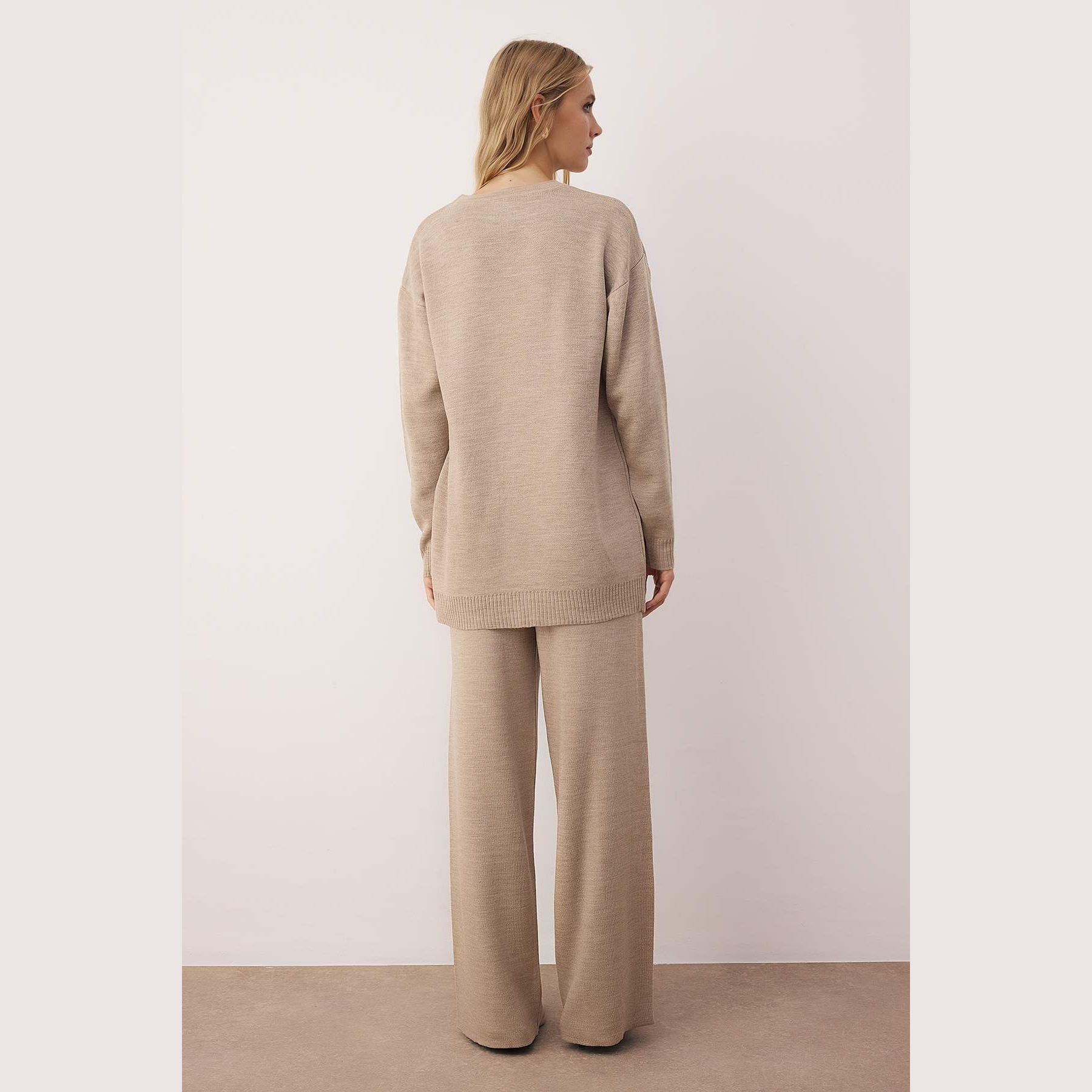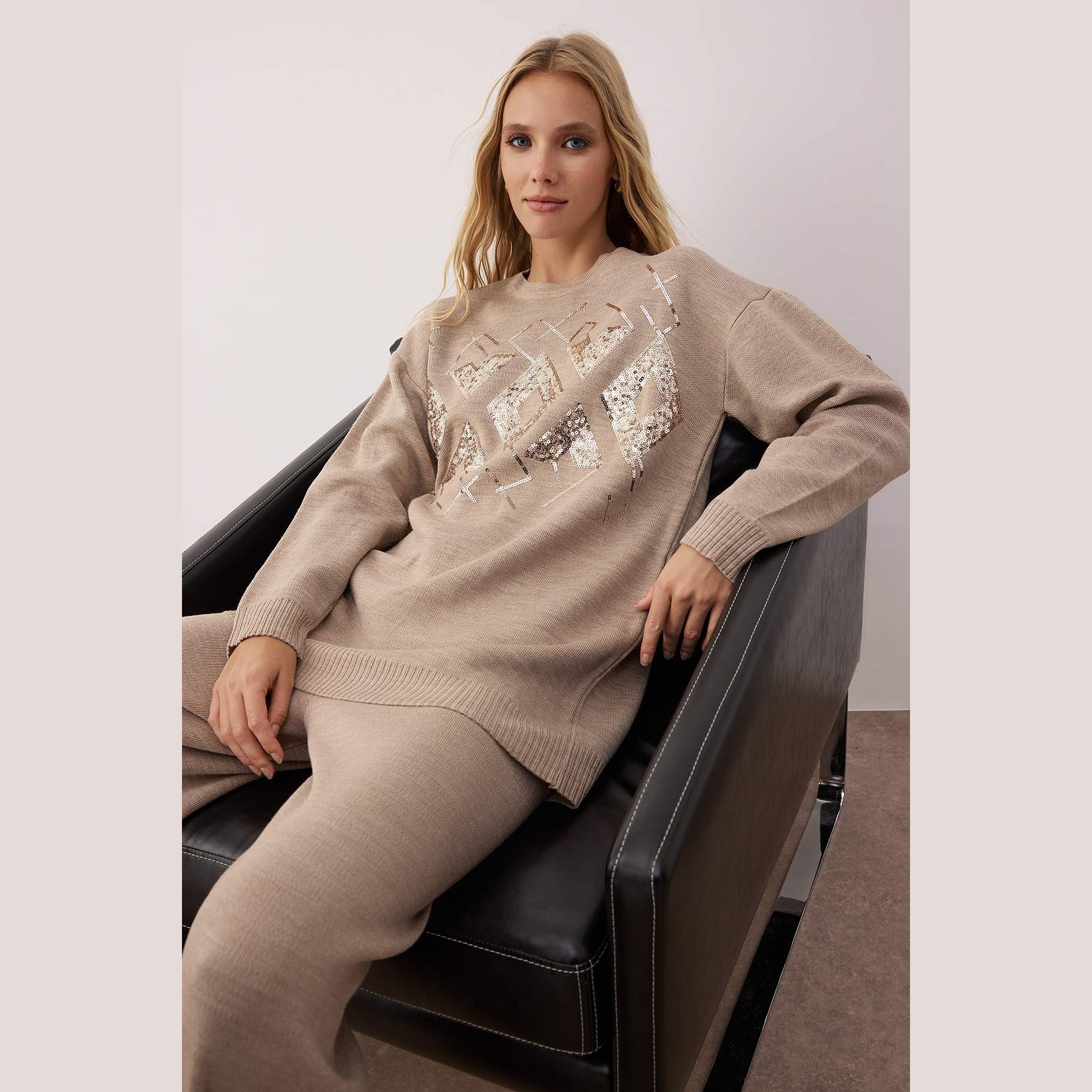 طقم أنيق بلون بيج (فيزون) من مجموعة Trendyolmilla Modest – لأناقة شتوية ناعمة ومحتشمة بلمسة براقة، يتكون من كنزة طويلة مزينة بتفاصيل ترتر لامع على الأكمام والصدر مع بنطال واسع بخصر مرتفع، مصنوع من خامة تريكو ناعمة مزدوجة الطبقة بتركيبة 100% أكريليك، ما يجعله مثاليًا للأجواء الباردة والإطلالات اليومية المحتشمة.
