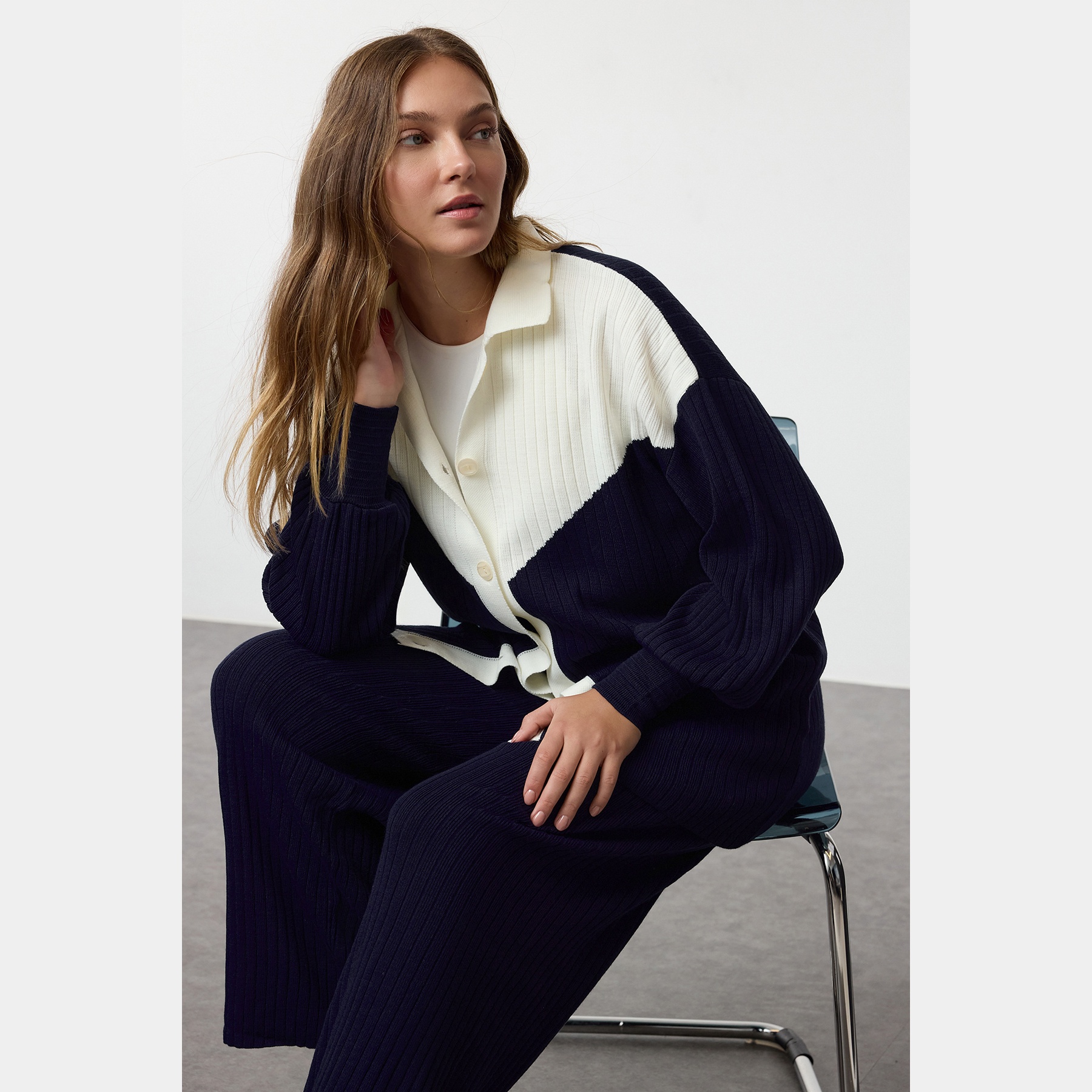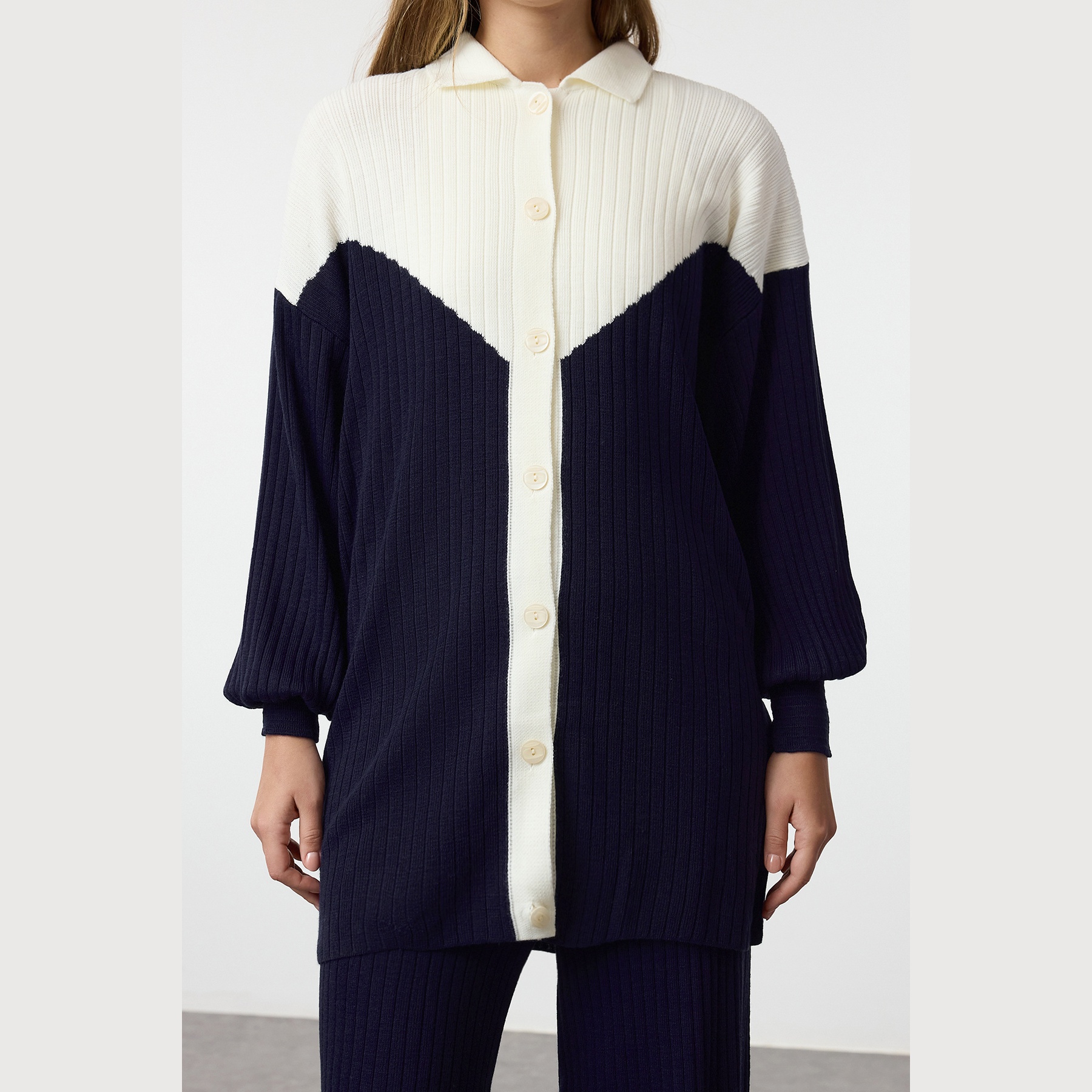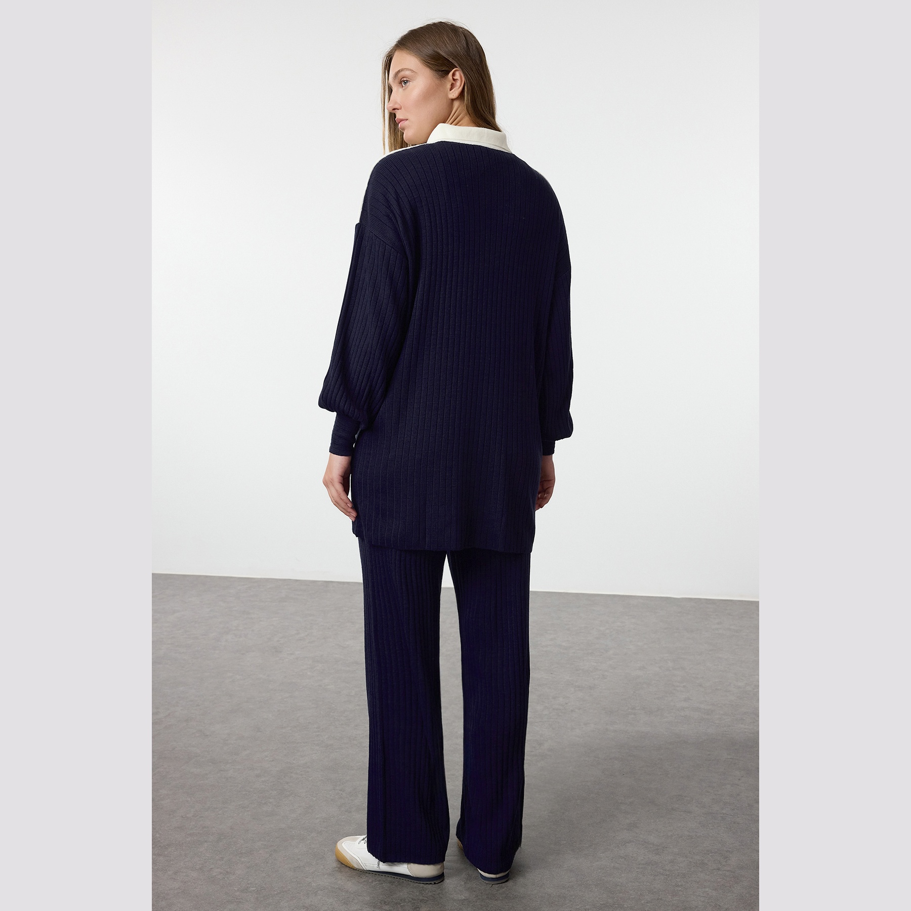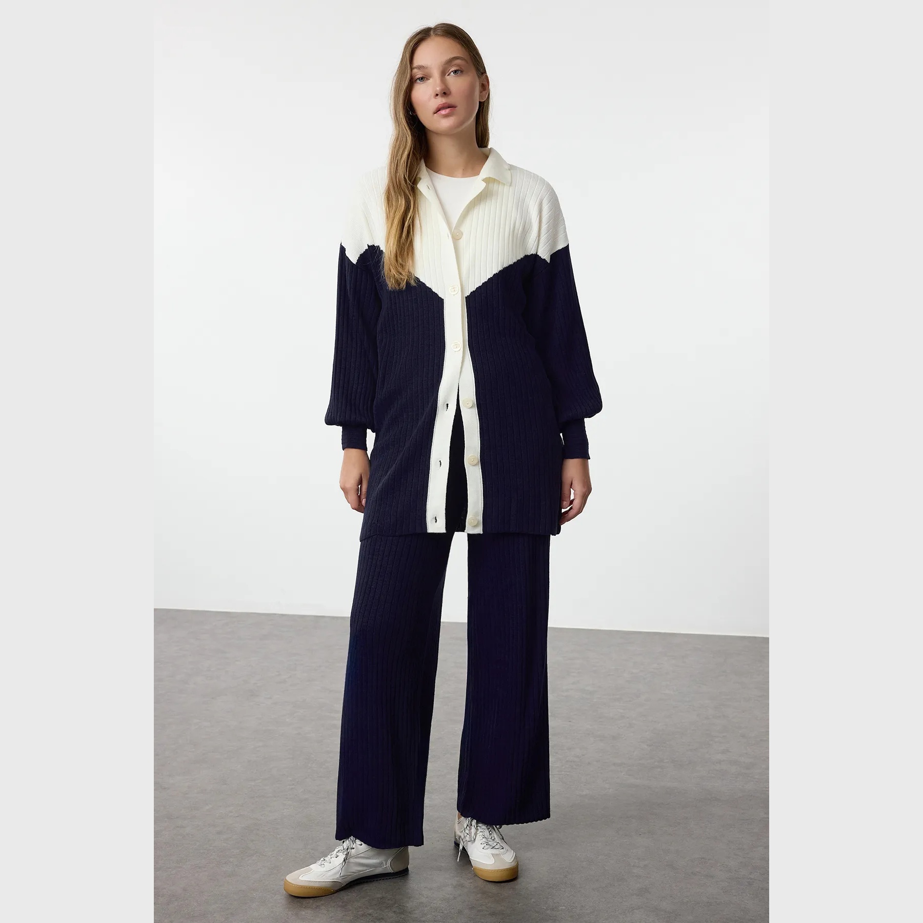 طقم أنيق بلون كحلي مع تفاصيل ألوان متداخلة من مجموعة Trendyolmilla Modest – لأناقة خريفية مريحة ومحتشمة بلمسة عصرية، يتكون من كنزة طويلة مضلعة بأزرار أمامية وياقة بولو مع بنطال مستقيم بخصر مرتفع، مصنوع من خامة تريكو مضلع (ريبانا/كاشكورس) بتركيبة 100% أكريليك، ما يجعله مثاليًا للأجواء المعتدلة والإطلالات اليومية المحتشمة.