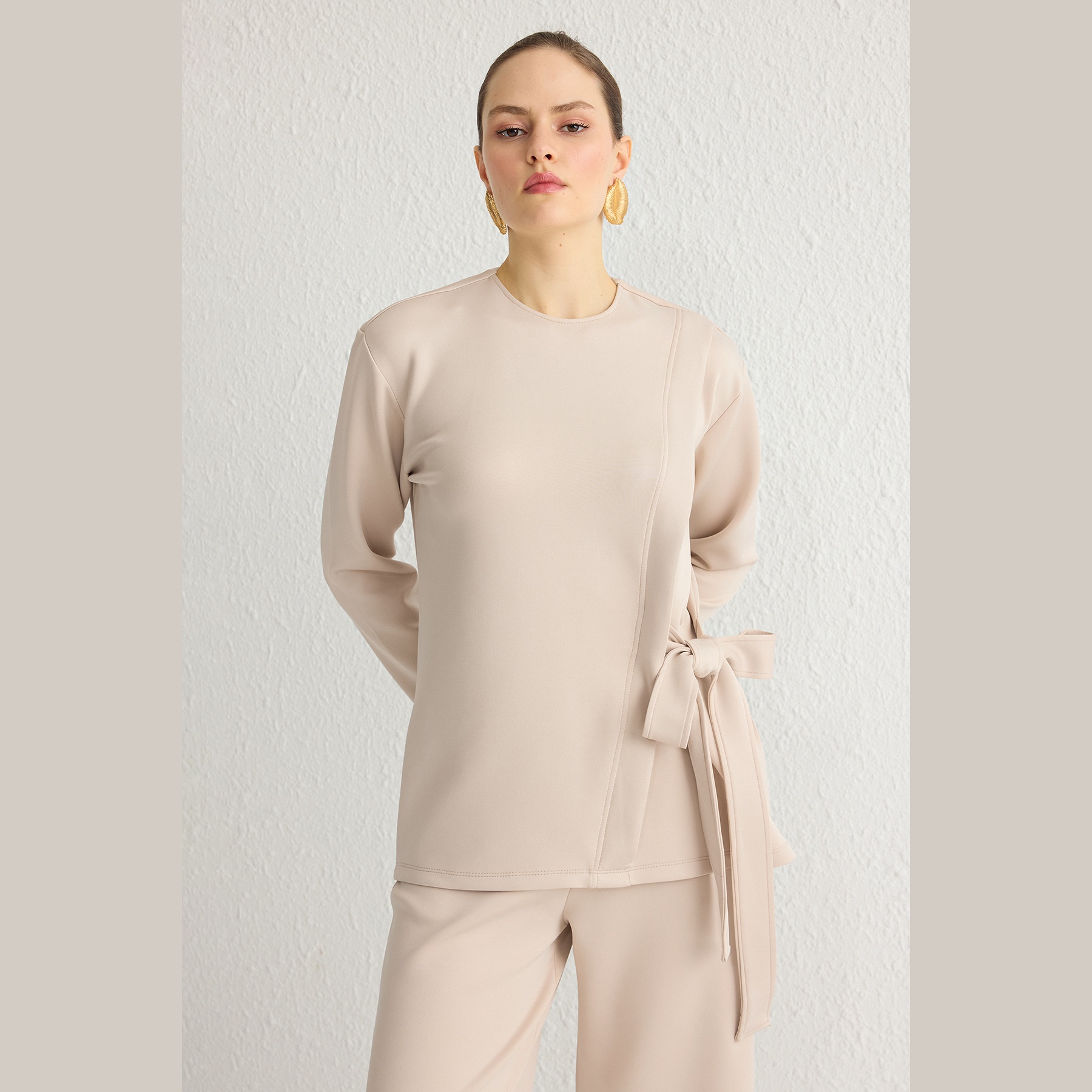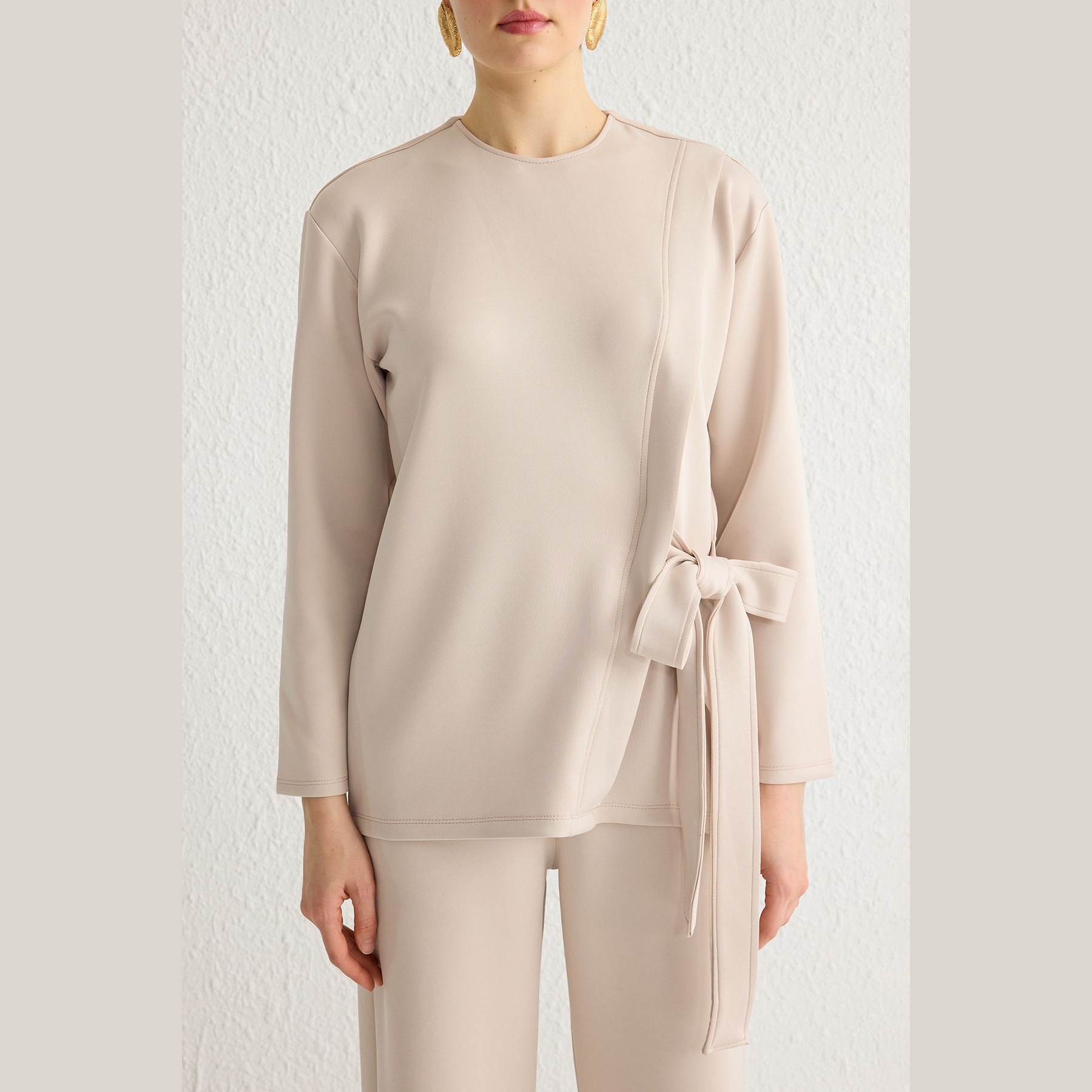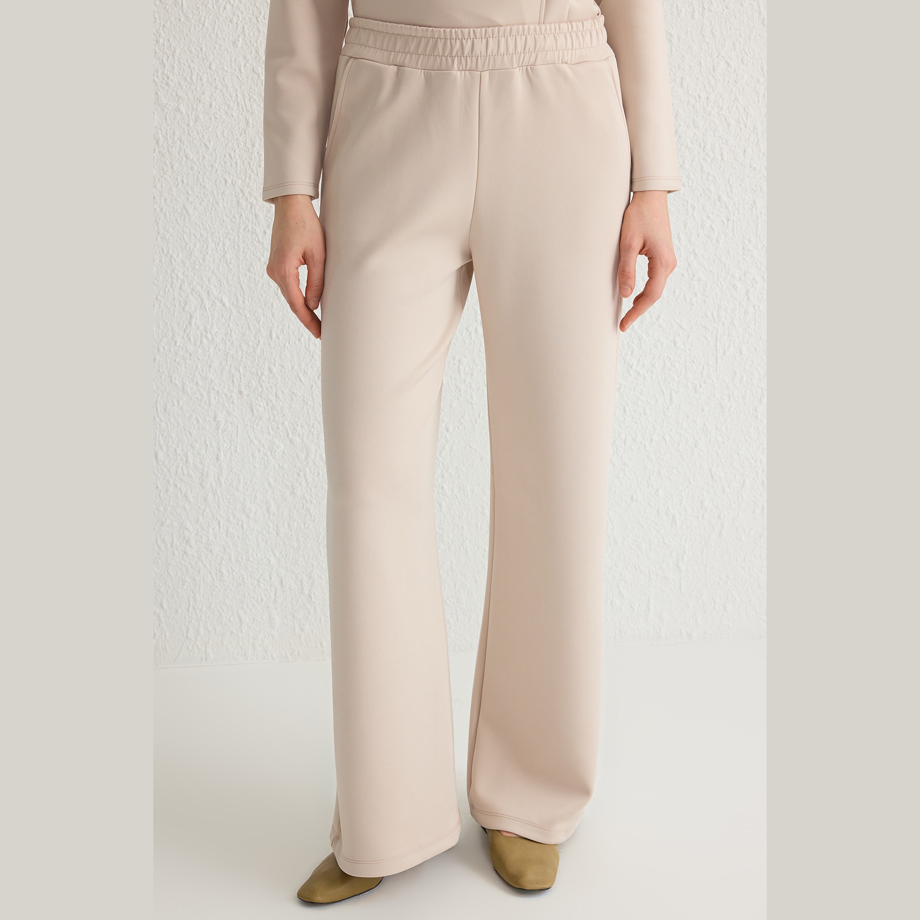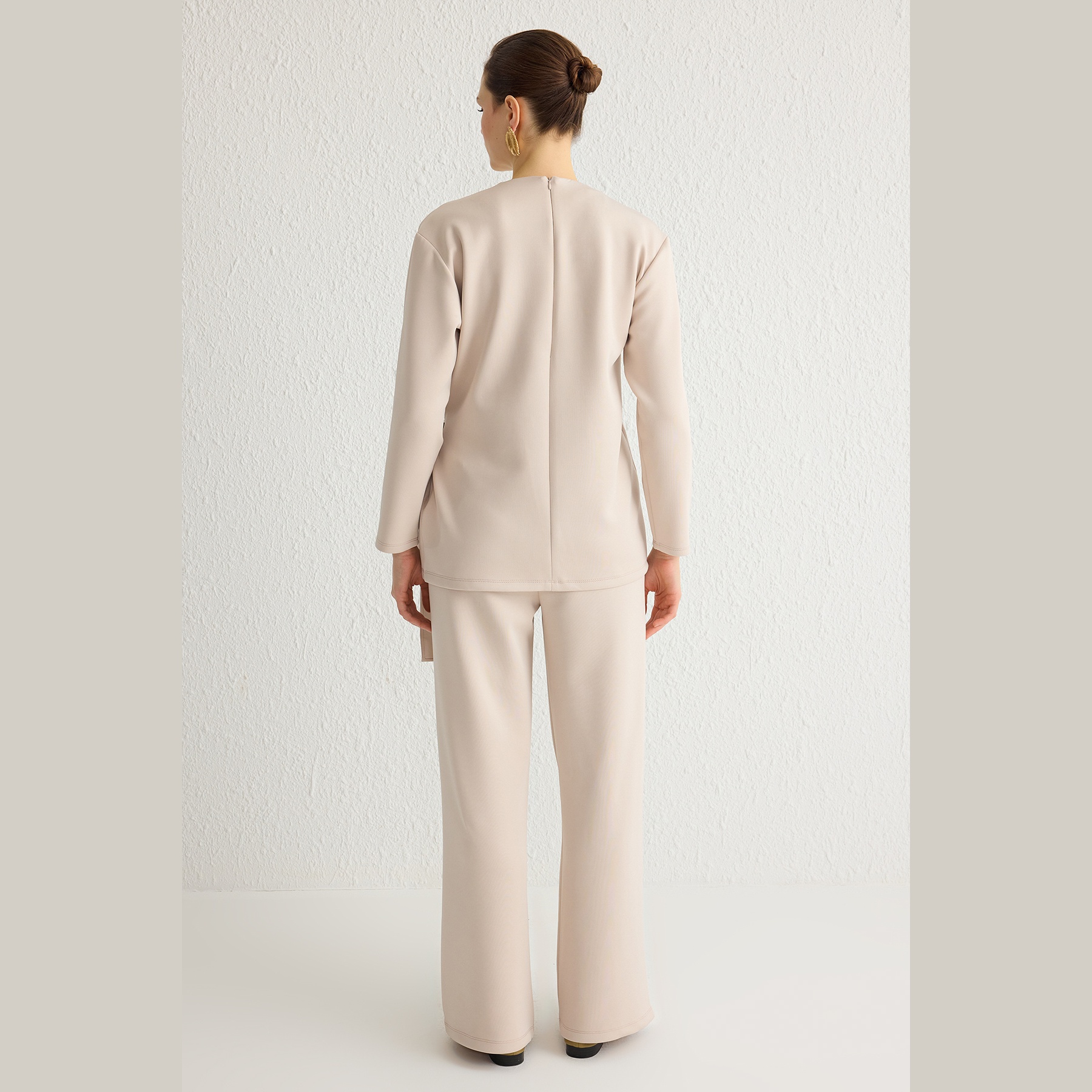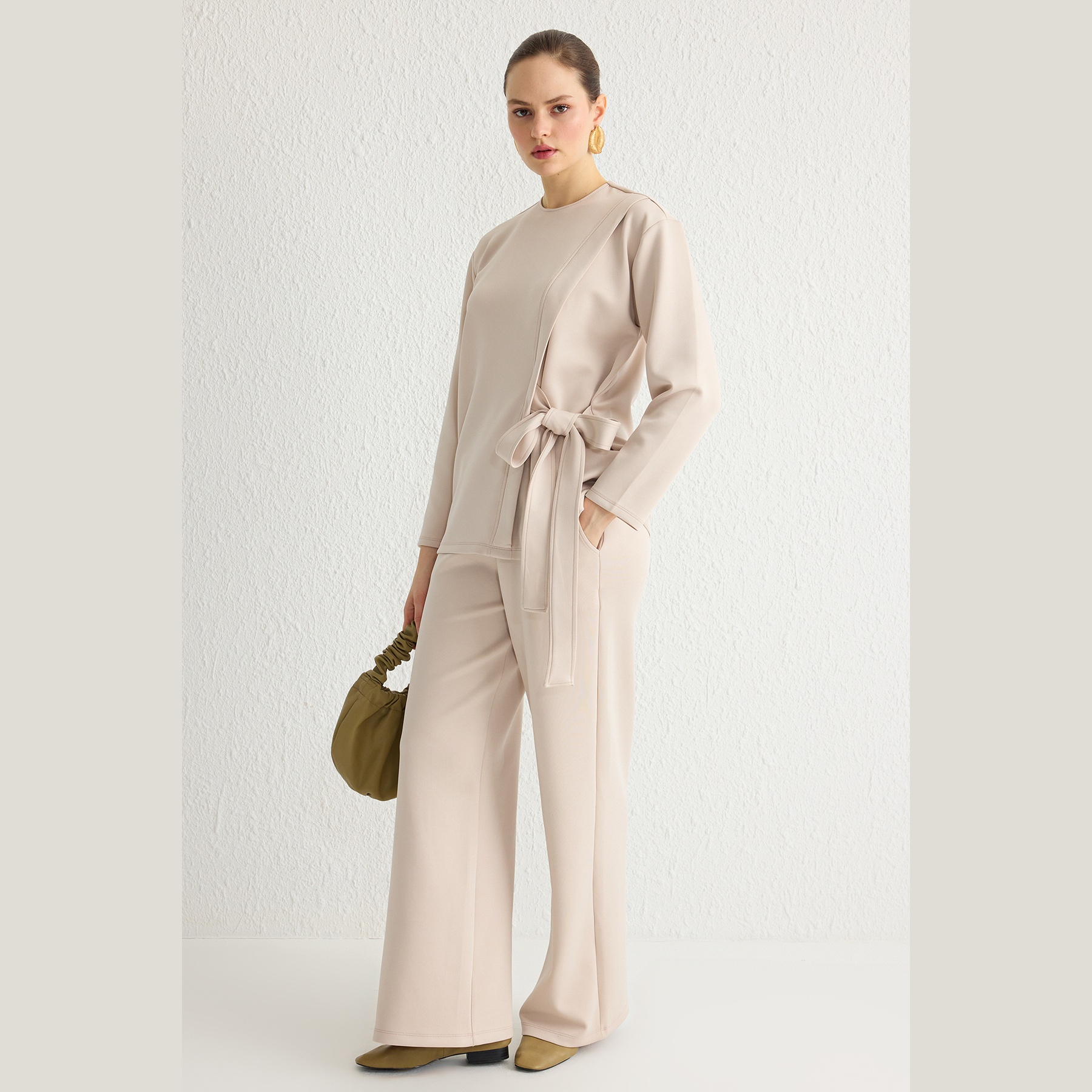 طقم أنيق بلون بيج فاتح موحد من مجموعة Trendyolmilla Modest – لأناقة صيفية مريحة ومحتشمة بلمسة ناعمة وعملية، يتكون من كنزة طويلة بأكمام كاملة وقصة مستقيمة مع بنطال بخصر مرتفع وأرجل مستقيمة، مصنوع من خامة سكوربا (Scuba) مرنة ومريحة بتركيبة %92 بوليستر، %8 قطن، ما يجعله مثاليًا للإطلالات اليومية في المواسم المعتدلة.