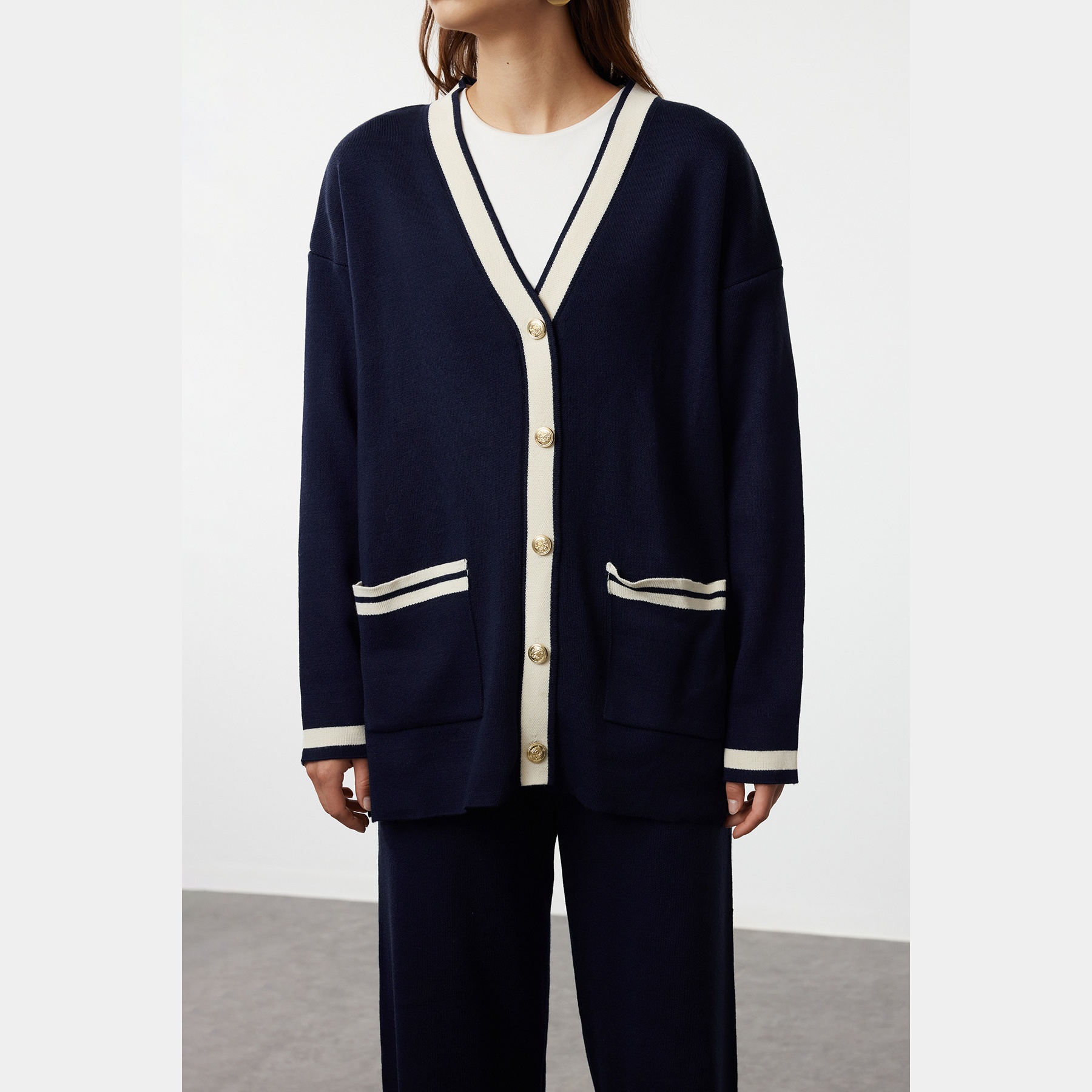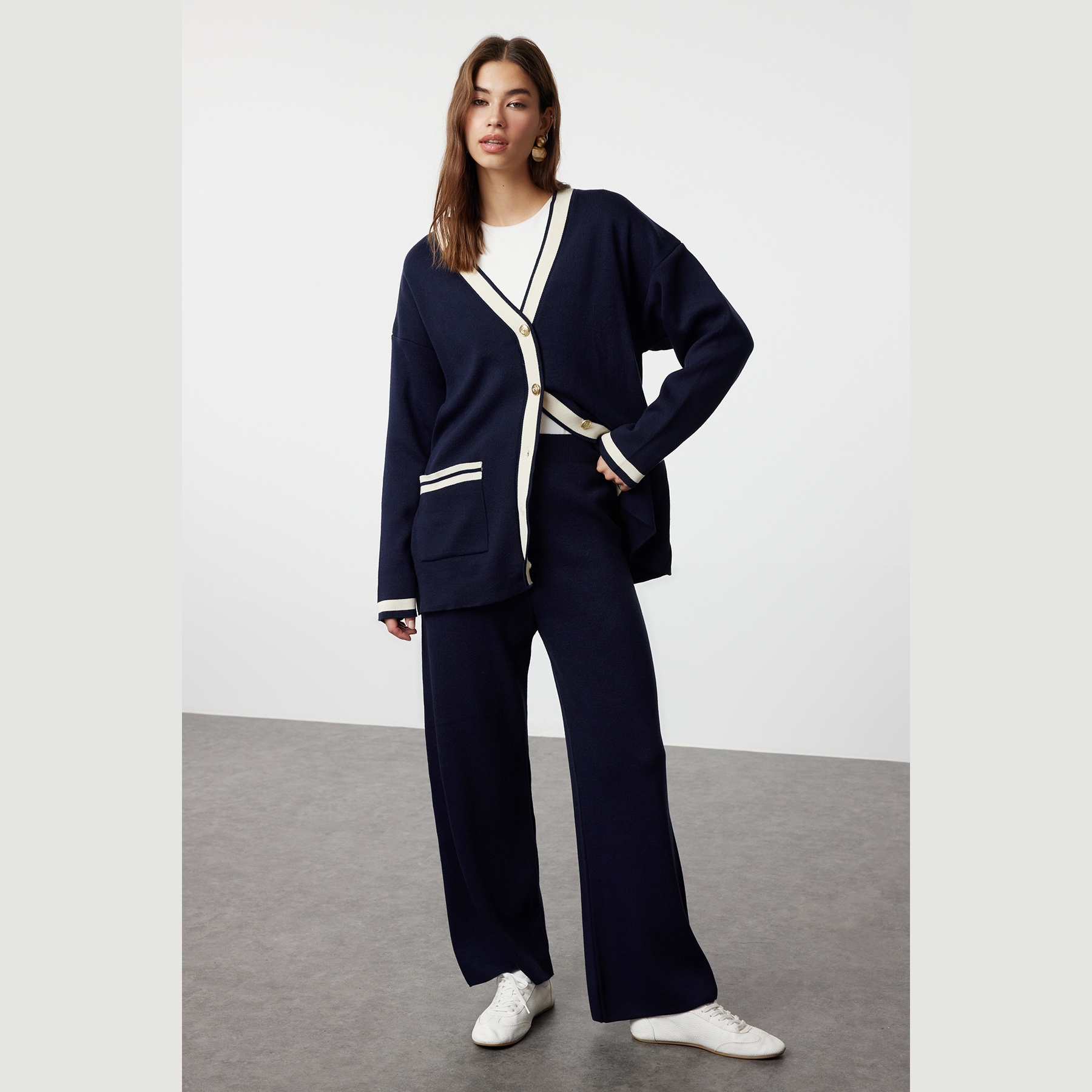 طقم أنيق بلون كحلي مع تفاصيل ألوان متداخلة وأزرار ذهبية من مجموعة Trendyolmilla Modest – لأناقة خريفية مريحة ومحتشمة بلمسة فاخرة، يتكون من كنزة طويلة مزينة بأزرار ذهبية وجيوب أمامية مع بنطال واسع بخصر مرتفع، مصنوع من خامة تريكو مزدوجة الطبقة بتركيبة 100% أكريليك، ما يجعله مثاليًا للأجواء المعتدلة والإطلالات اليومية المحتشمة.