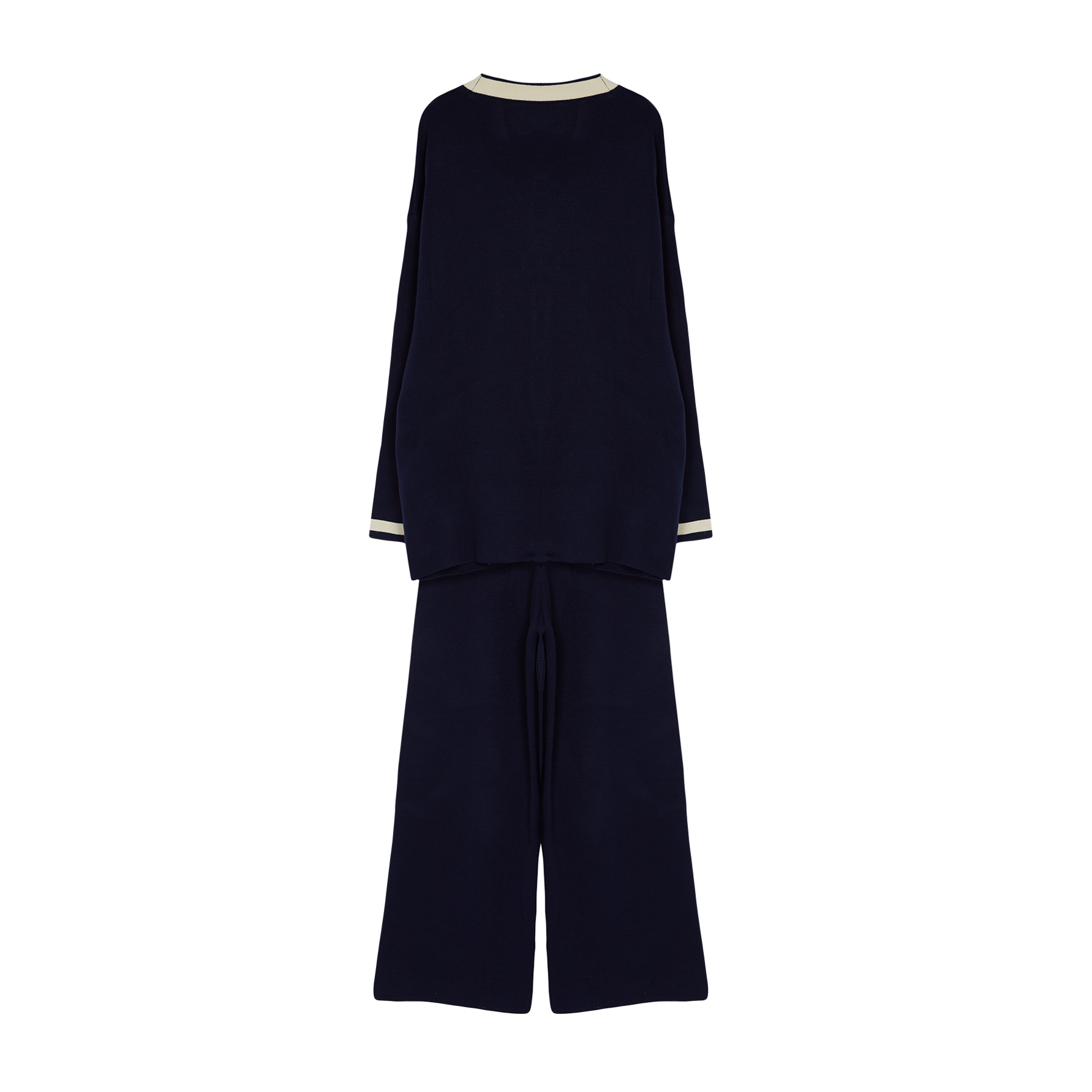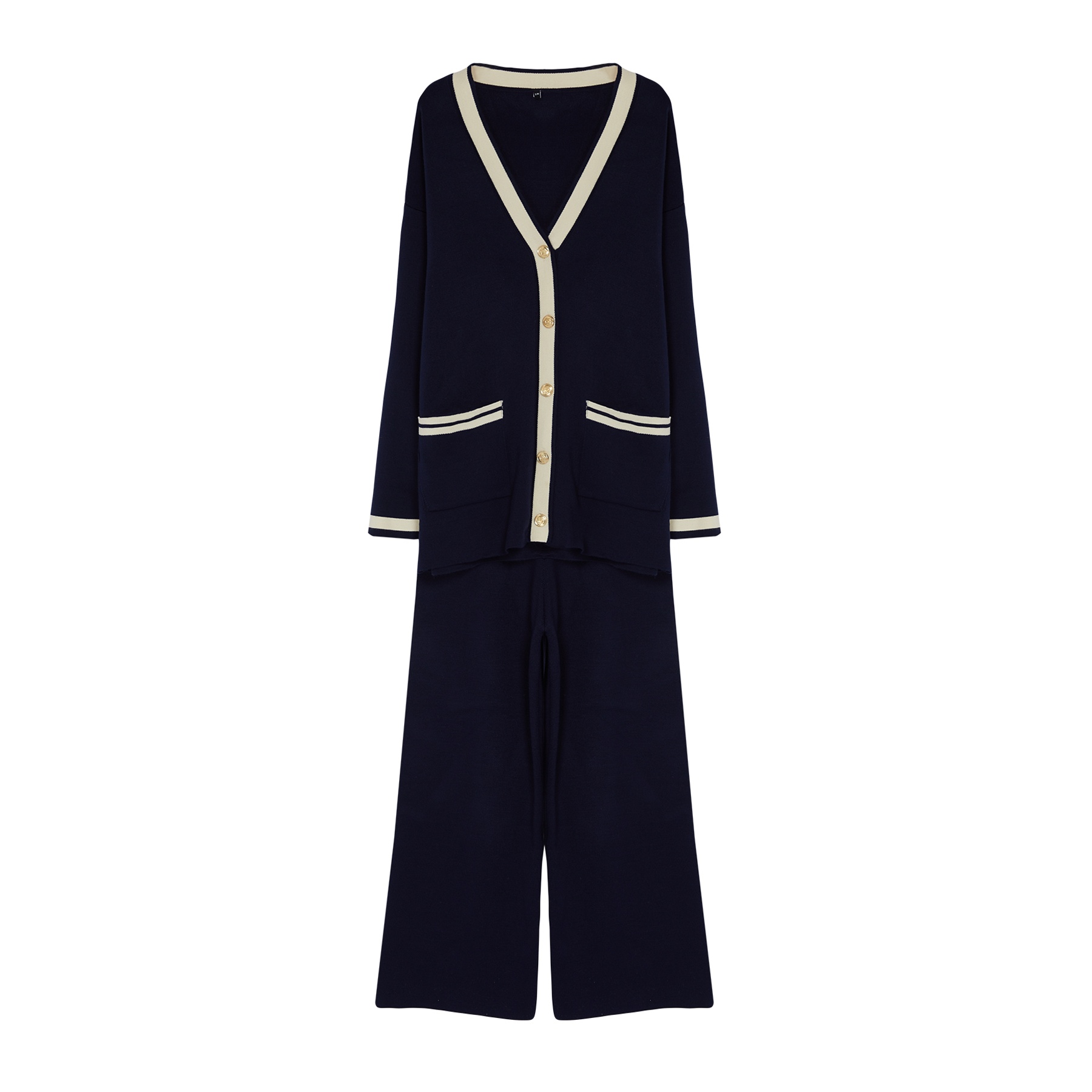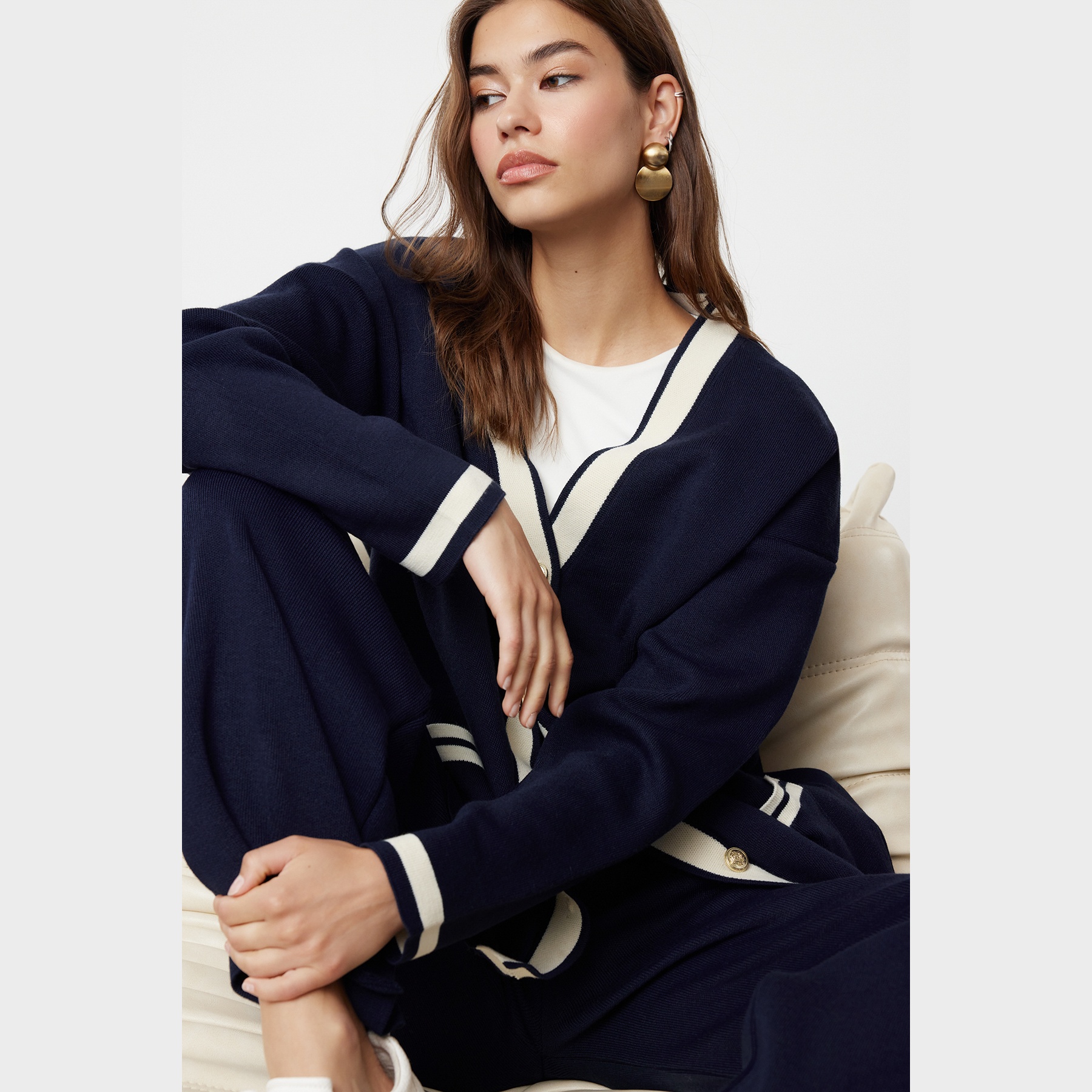 طقم نسائي مكون من كنزة وبنطال – كحلي بتفاصيل ألوان متداخلة وأزرار ذهبية (قماش تريكو، تصميم محتشم)