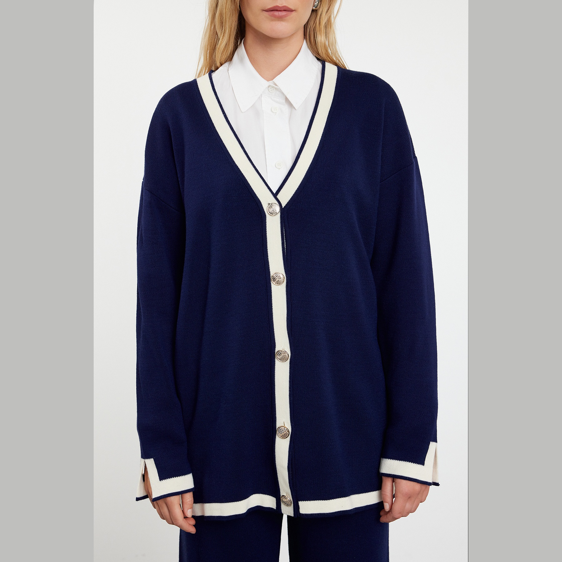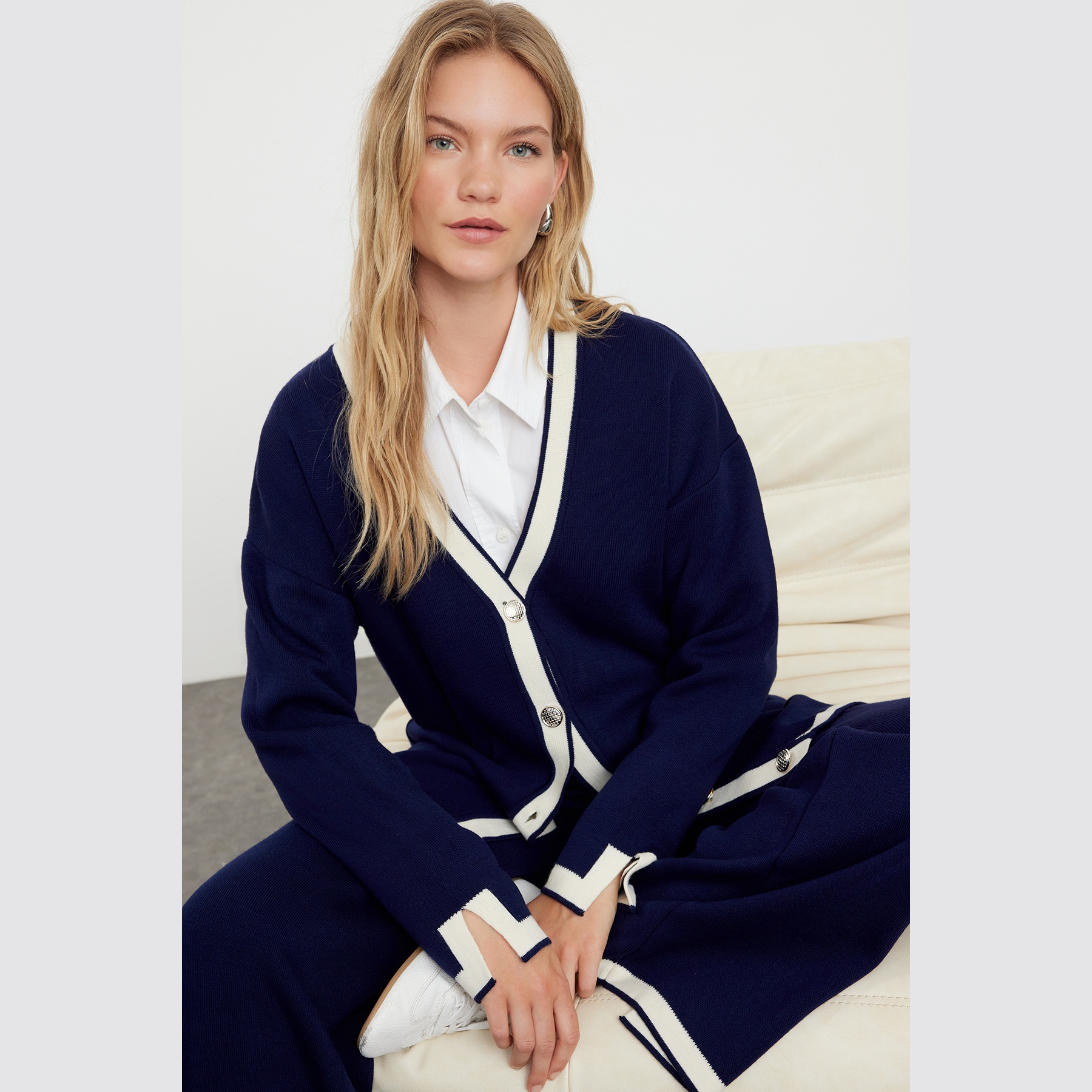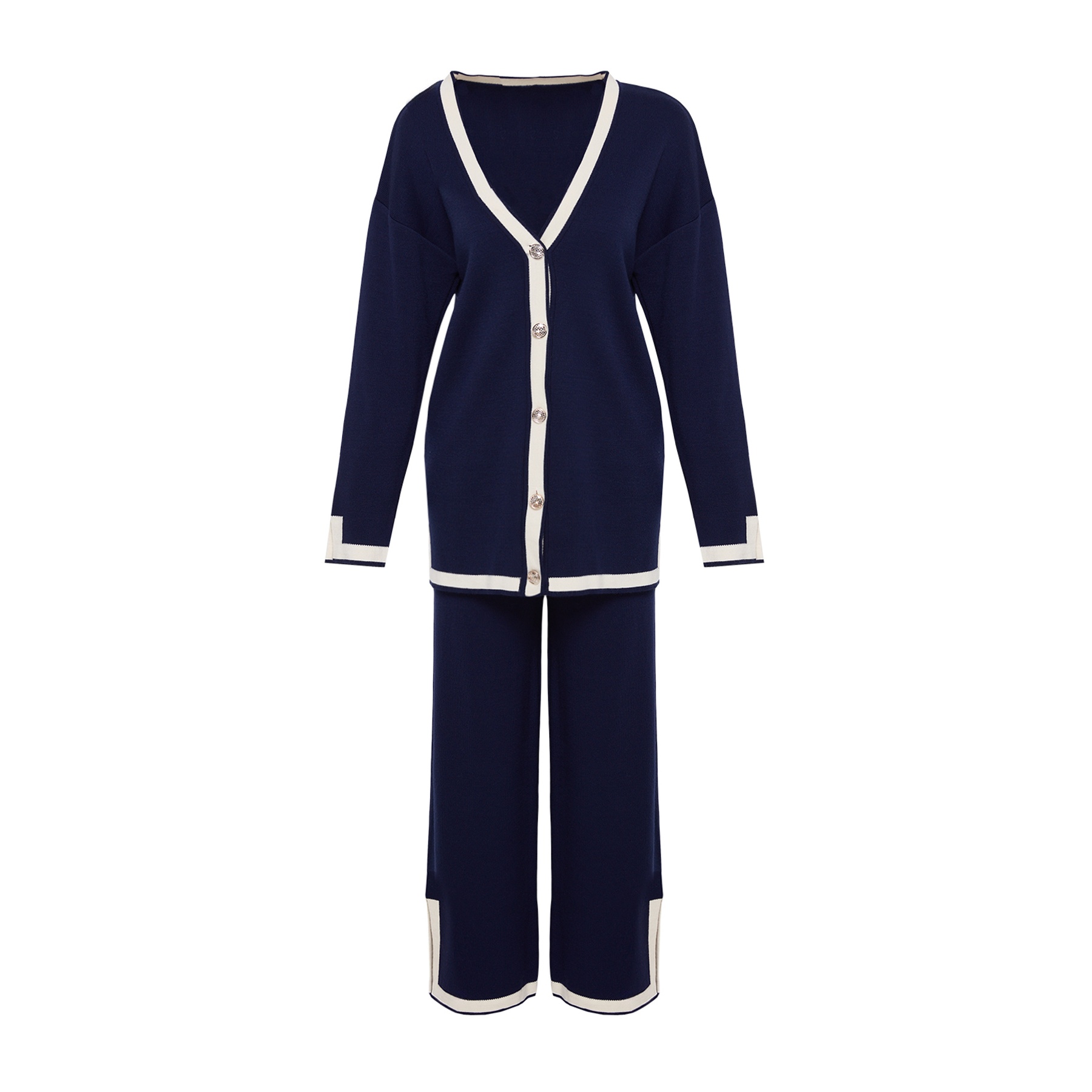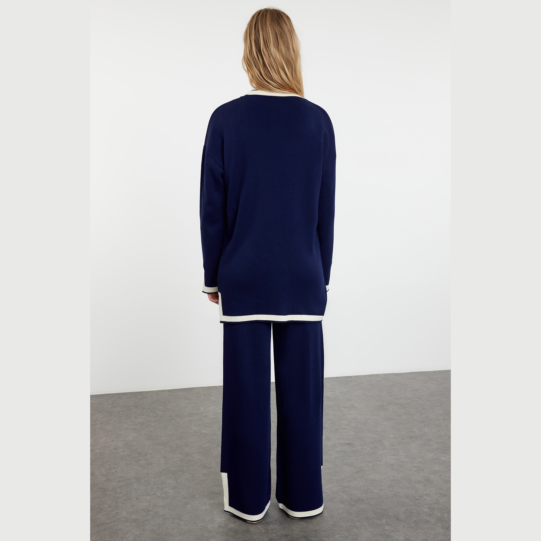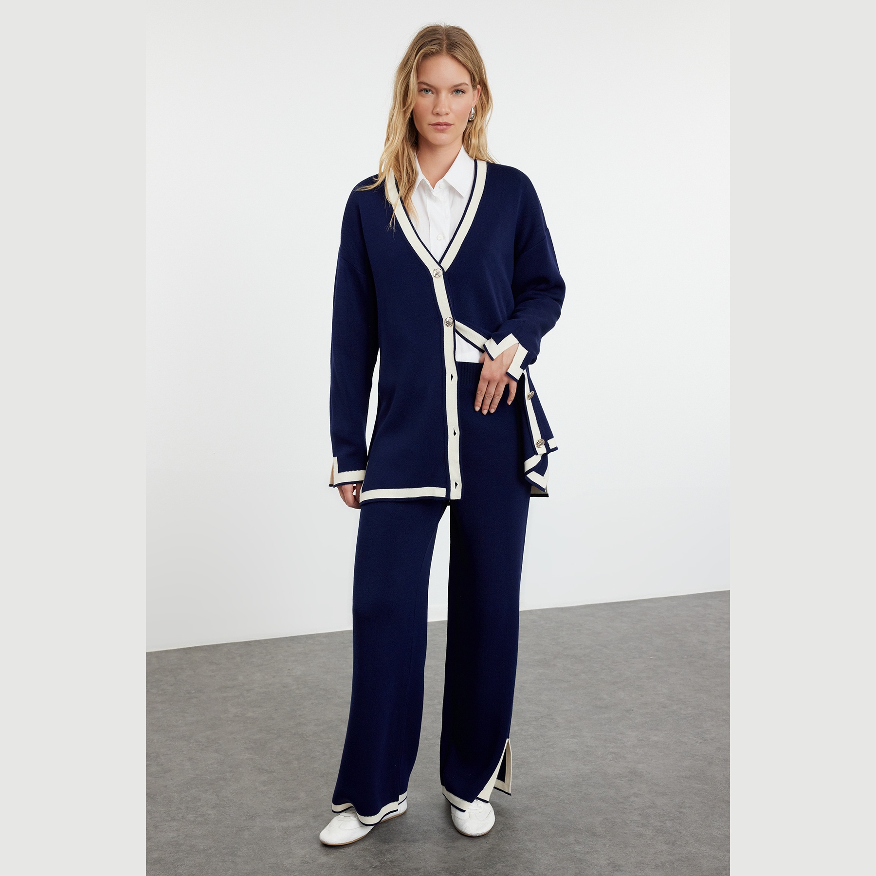 طقم أنيق بلون كحلي مع تفاصيل ألوان متداخلة من مجموعة Trendyolmilla Modest – لأناقة شتوية مريحة ومحتشمة بلمسة عصرية، يتكون من كنزة طويلة بأزرار أمامية وياقة V مع بنطال واسع بخصر مرتفع، مصنوع من خامة تريكو مزدوجة الطبقة بتركيبة 100% أكريليك، ما يجعله مثاليًا للأجواء الباردة والإطلالات اليومية المحتشمة.
