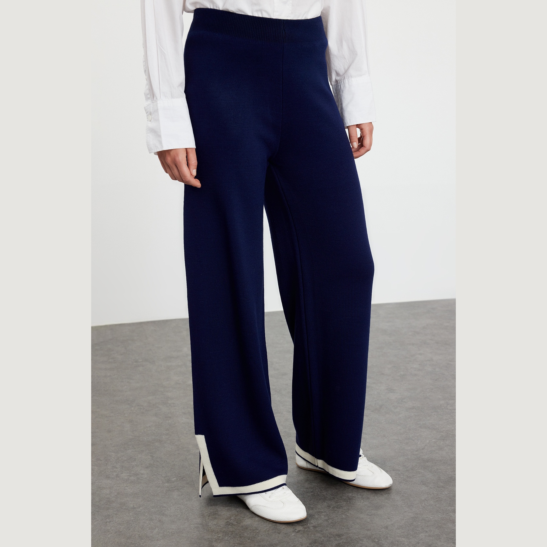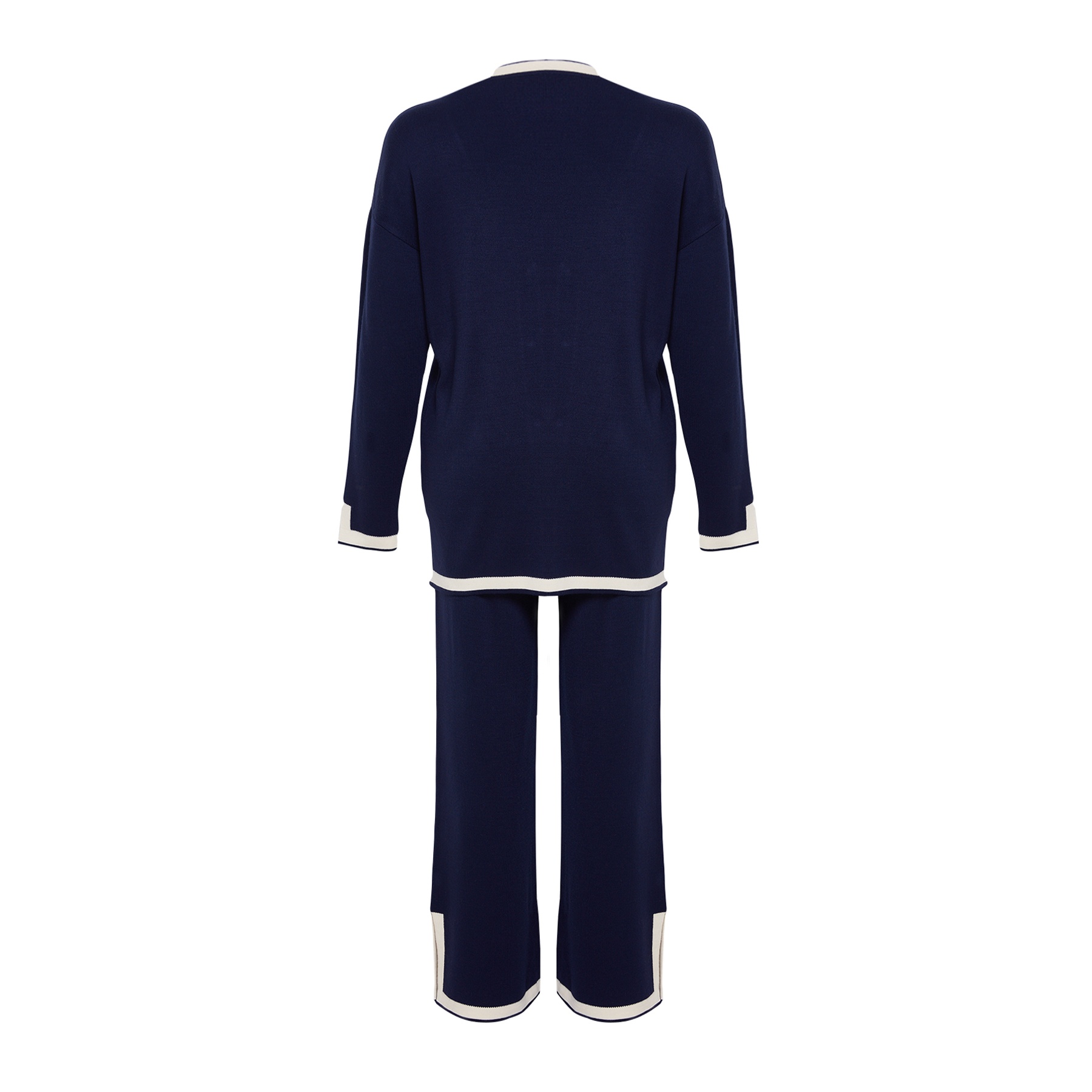 طقم نسائي مكون من كنزة وبنطال – كحلي بتفاصيل ألوان متداخلة (قماش تريكو، تصميم محتشم)