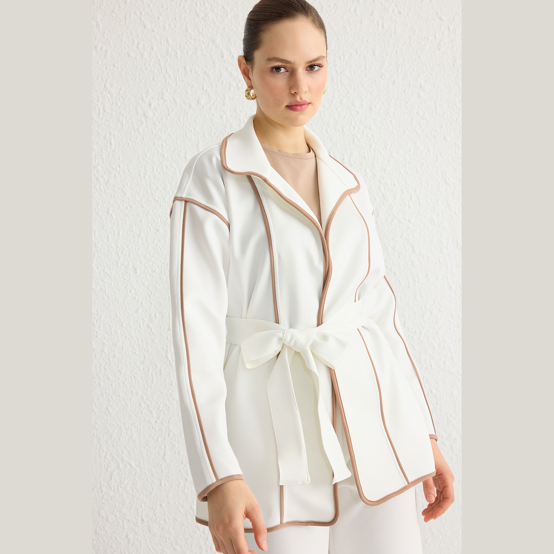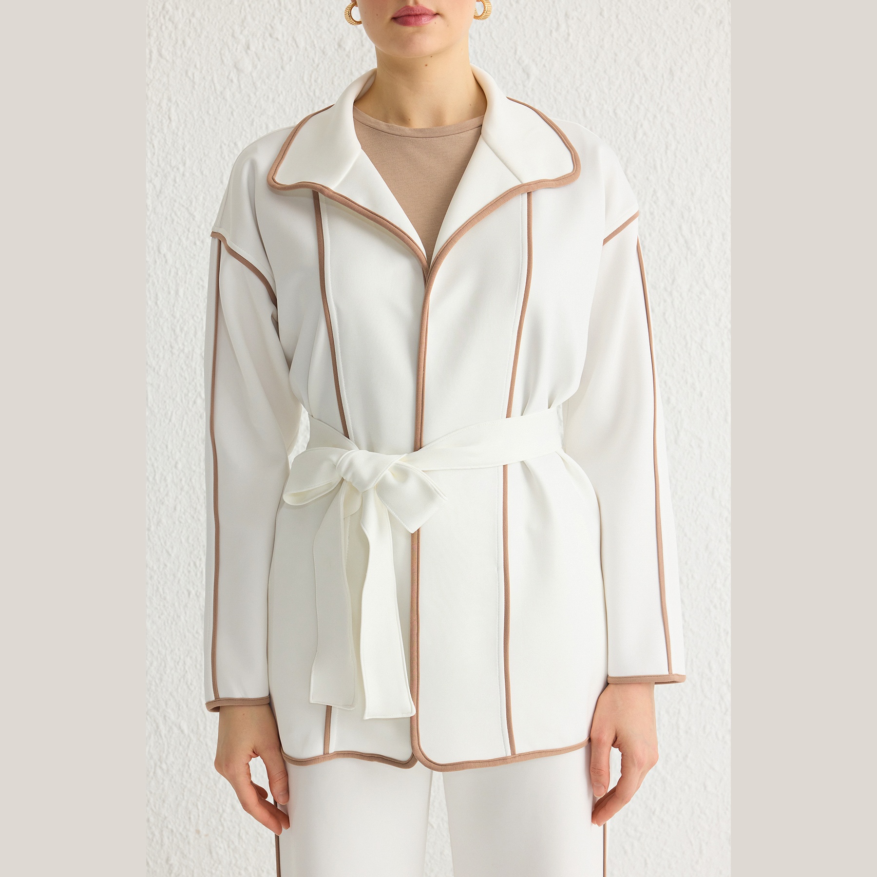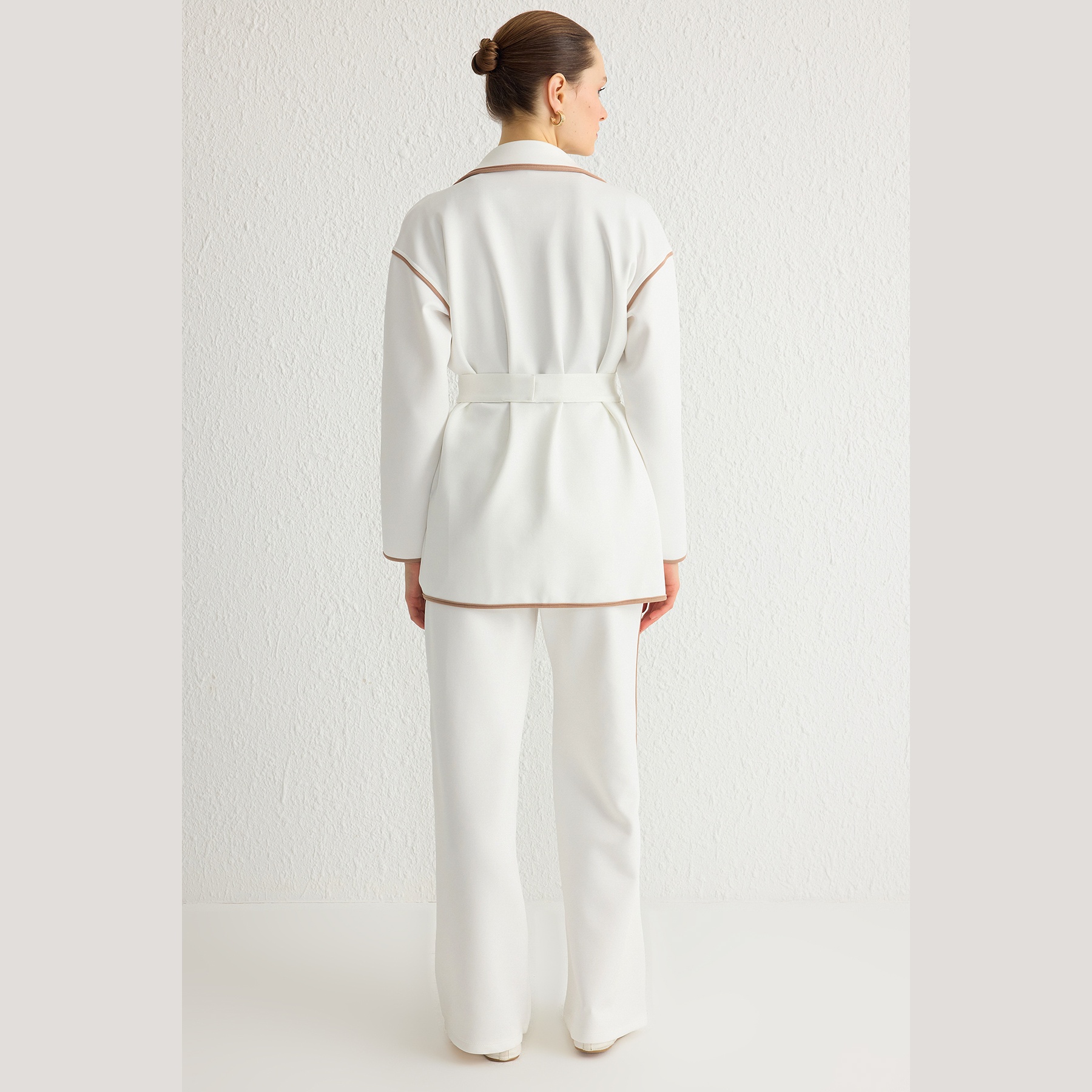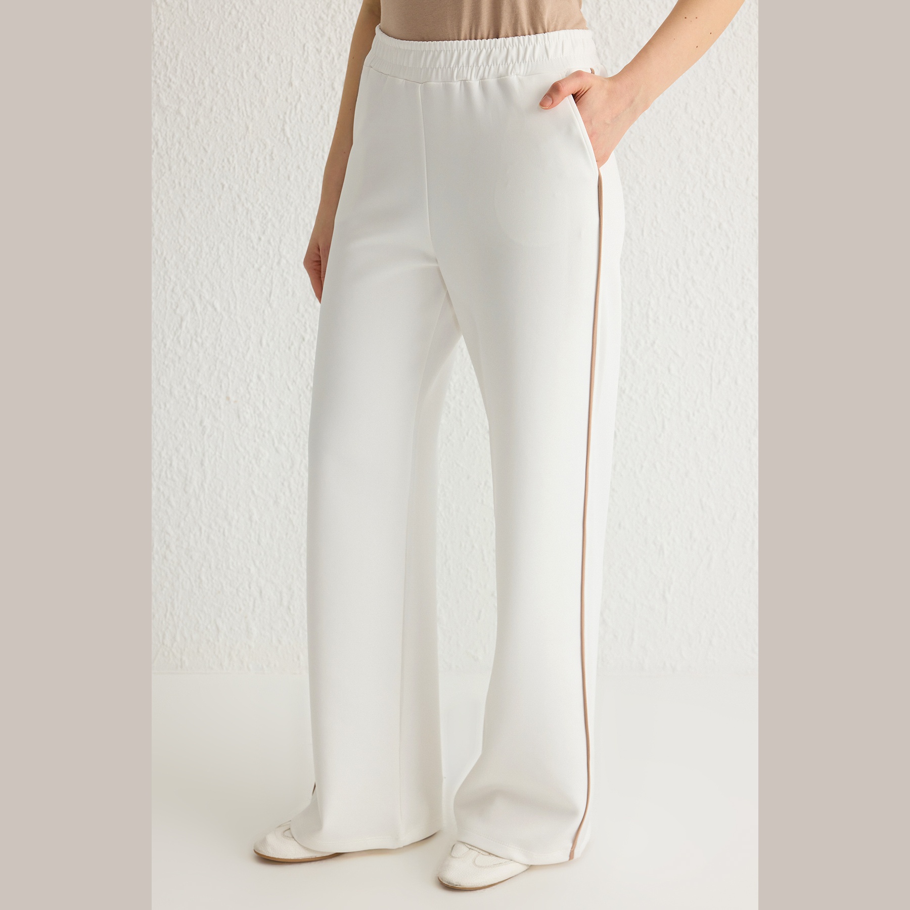 طقم أنيق بلون إكرُو موحد مع خطوط متباينة من مجموعة Trendyolmilla Modest – لأناقة صيفية مريحة ومحتشمة بلمسة رياضية ناعمة، يتكون من كنزة طويلة بأكمام كاملة وقصة مستقيمة مع بنطال بخصر مرتفع وأرجل مستقيمة، مصنوع من خامة سكوربا (Scuba) مرنة ومريحة بتركيبة %92 بوليستر، %8 قطن، ما يجعله مثاليًا للإطلالات اليومية في المواسم المعتدلة.