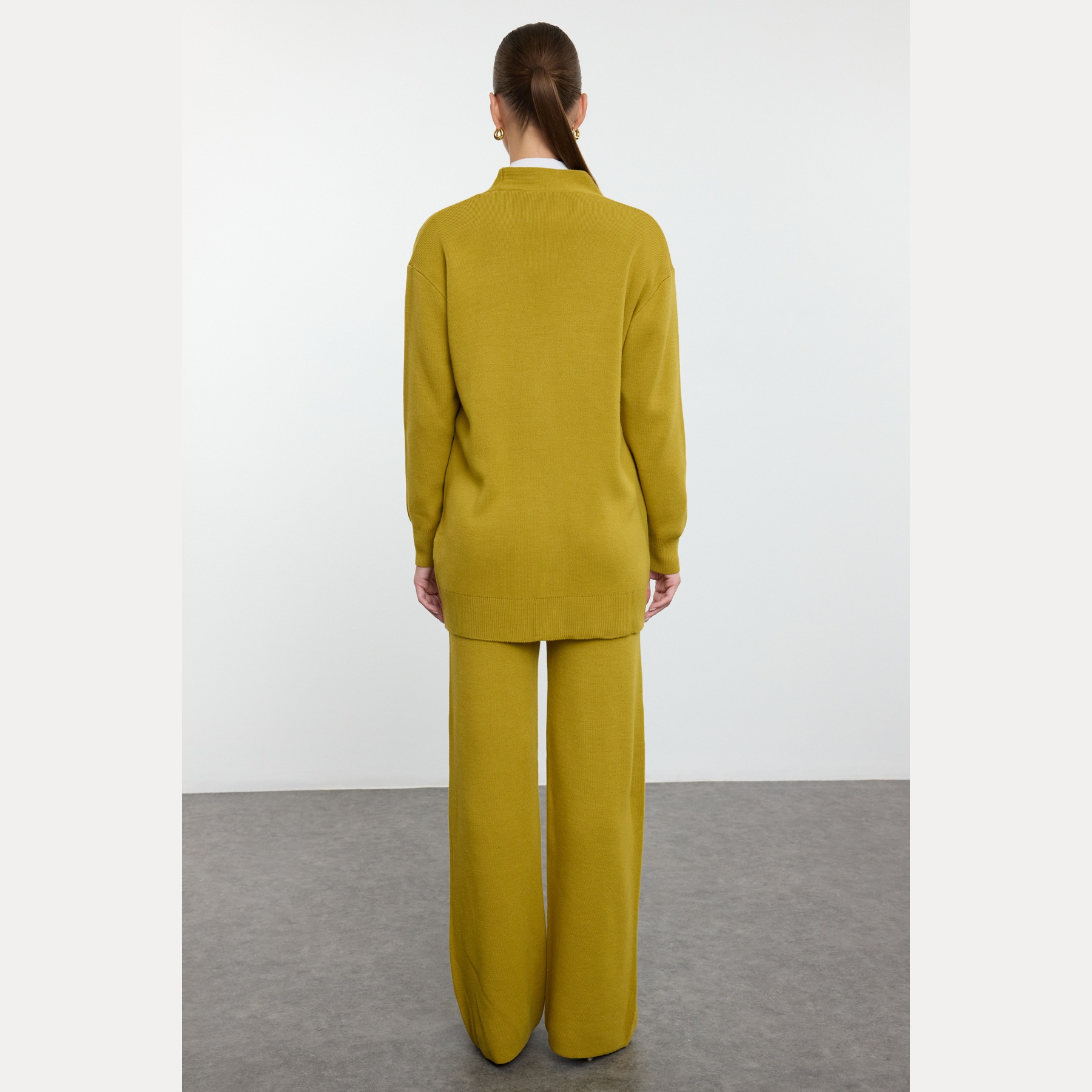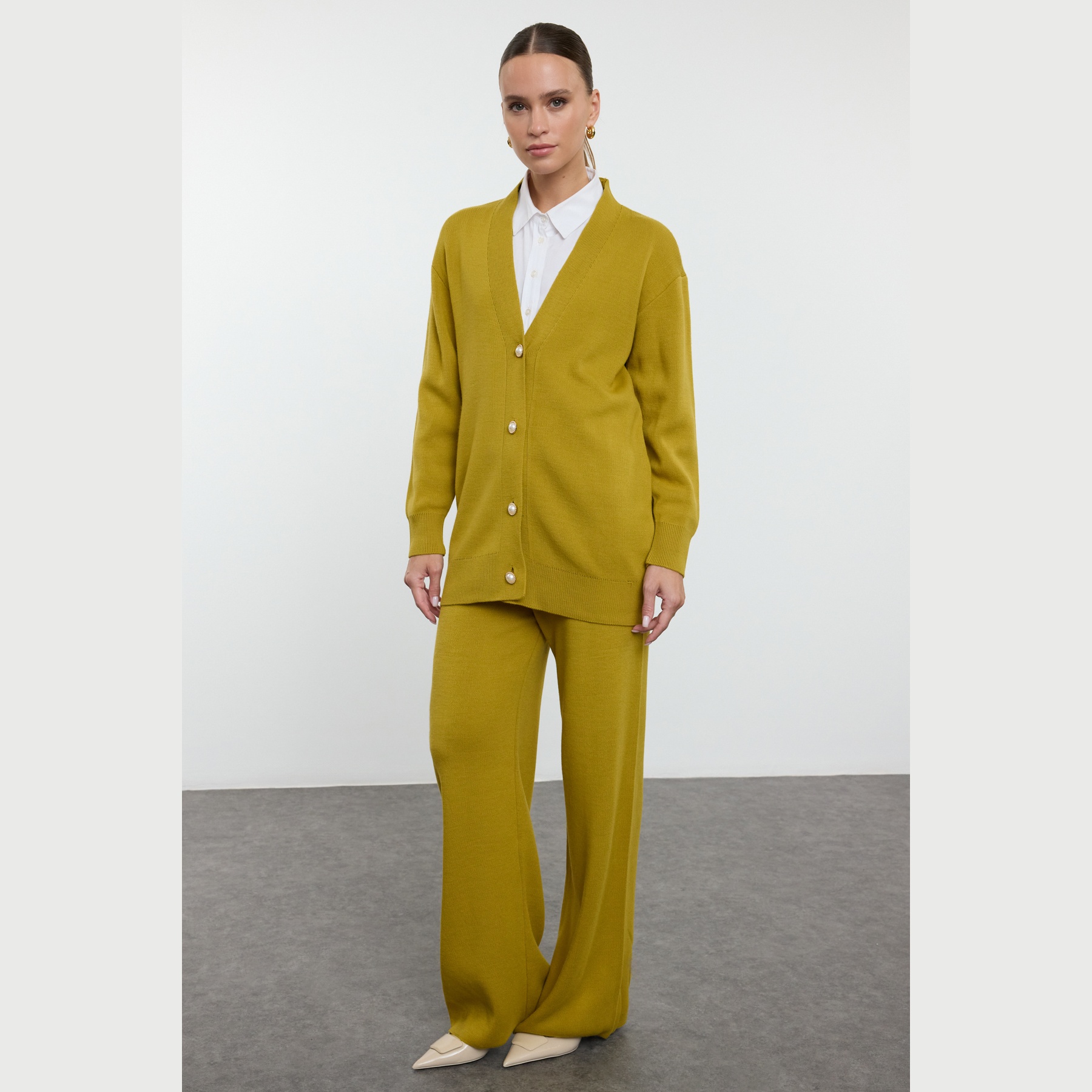 طقم أنيق بلون زيتي (ياقوت الزيتون) من مجموعة Trendyolmilla Modest – لأناقة شتوية دافئة ومحتشمة بلمسة أنثوية راقية، يتكون من كنزة طويلة مزينة بأزرار لؤلؤية وياقة V مع بنطال واسع بخصر مرتفع وقصة مستقيمة، مصنوع من خامة تريكو مزدوجة الطبقة بتركيبة 100% أكريليك، ما يجعله مثاليًا للأجواء الباردة والإطلالات اليومية المحتشمة.