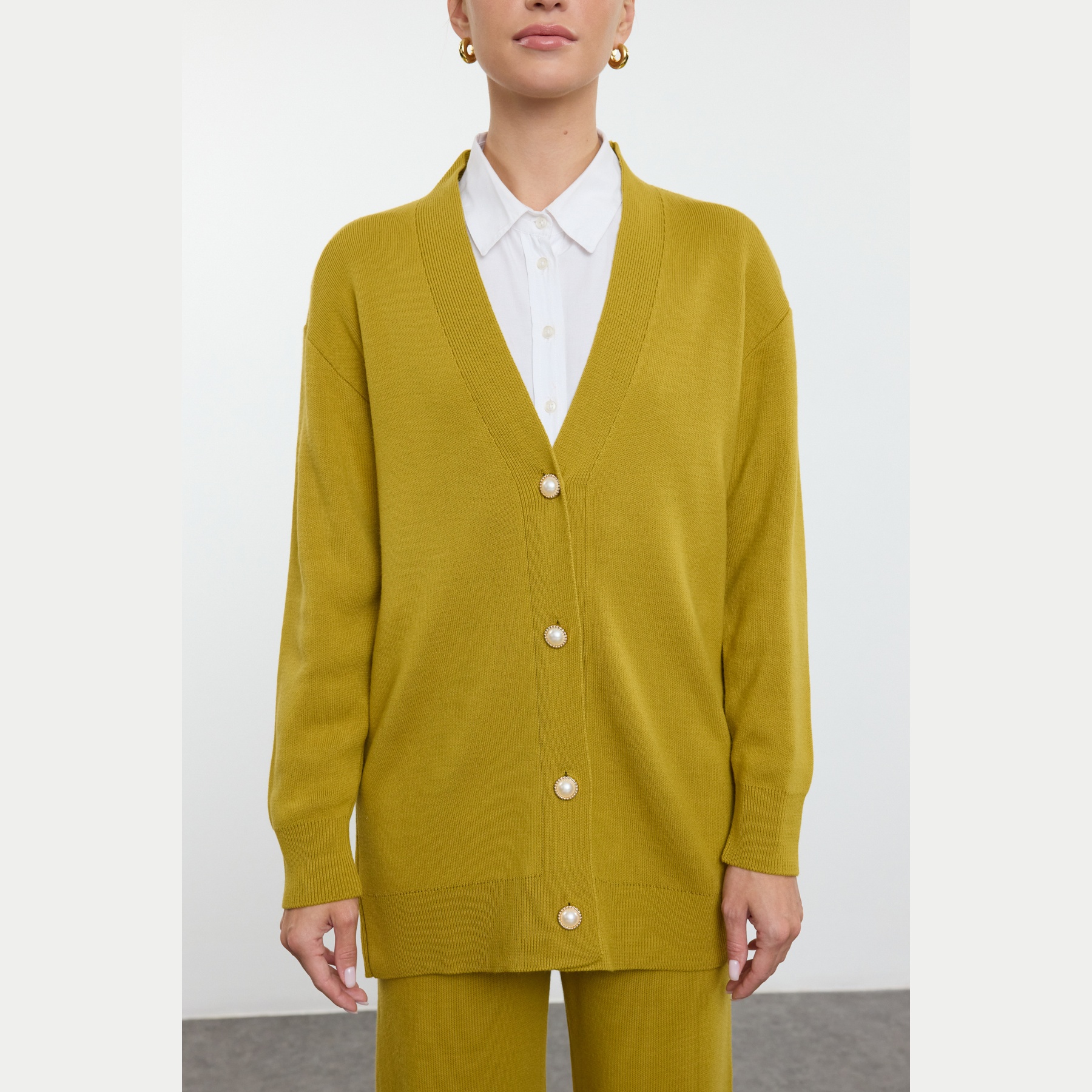 طقم نسائي مكون من كنزة وبنطال – زيتي مزين بأزرار لؤلؤية (قماش تريكو، تصميم محتشم)