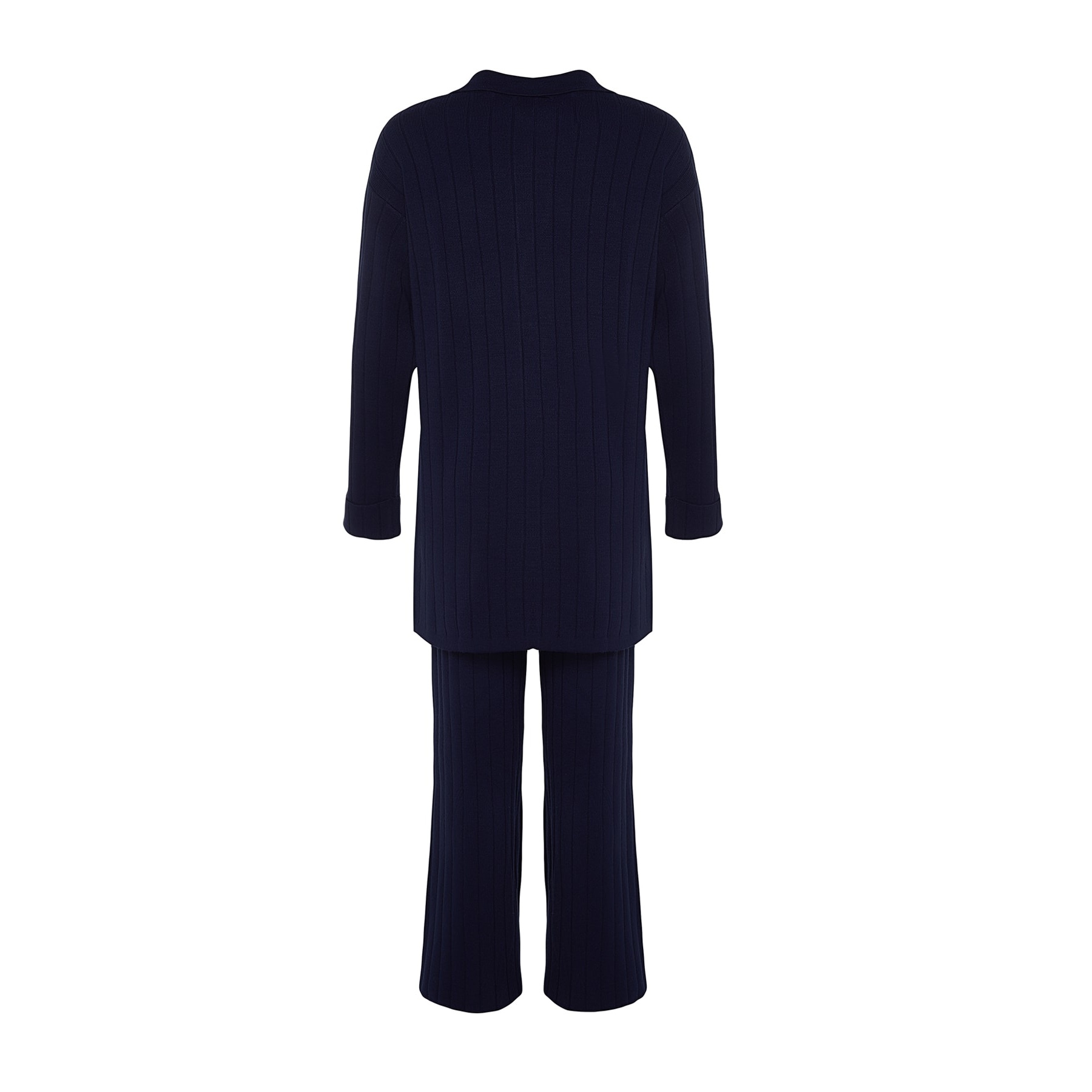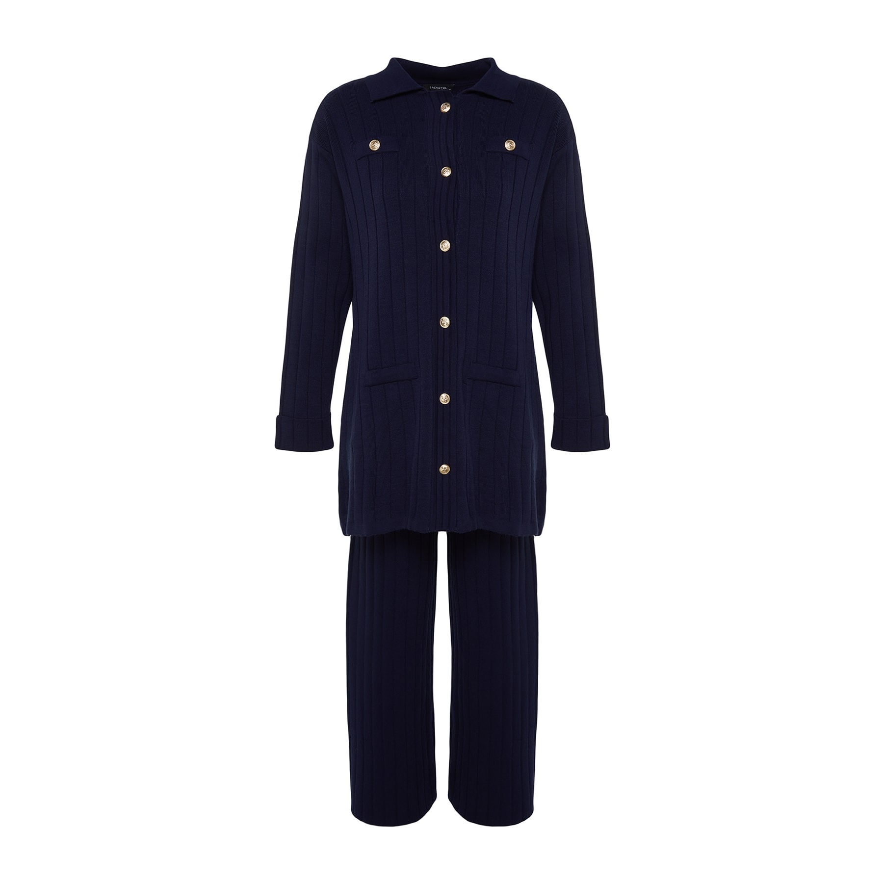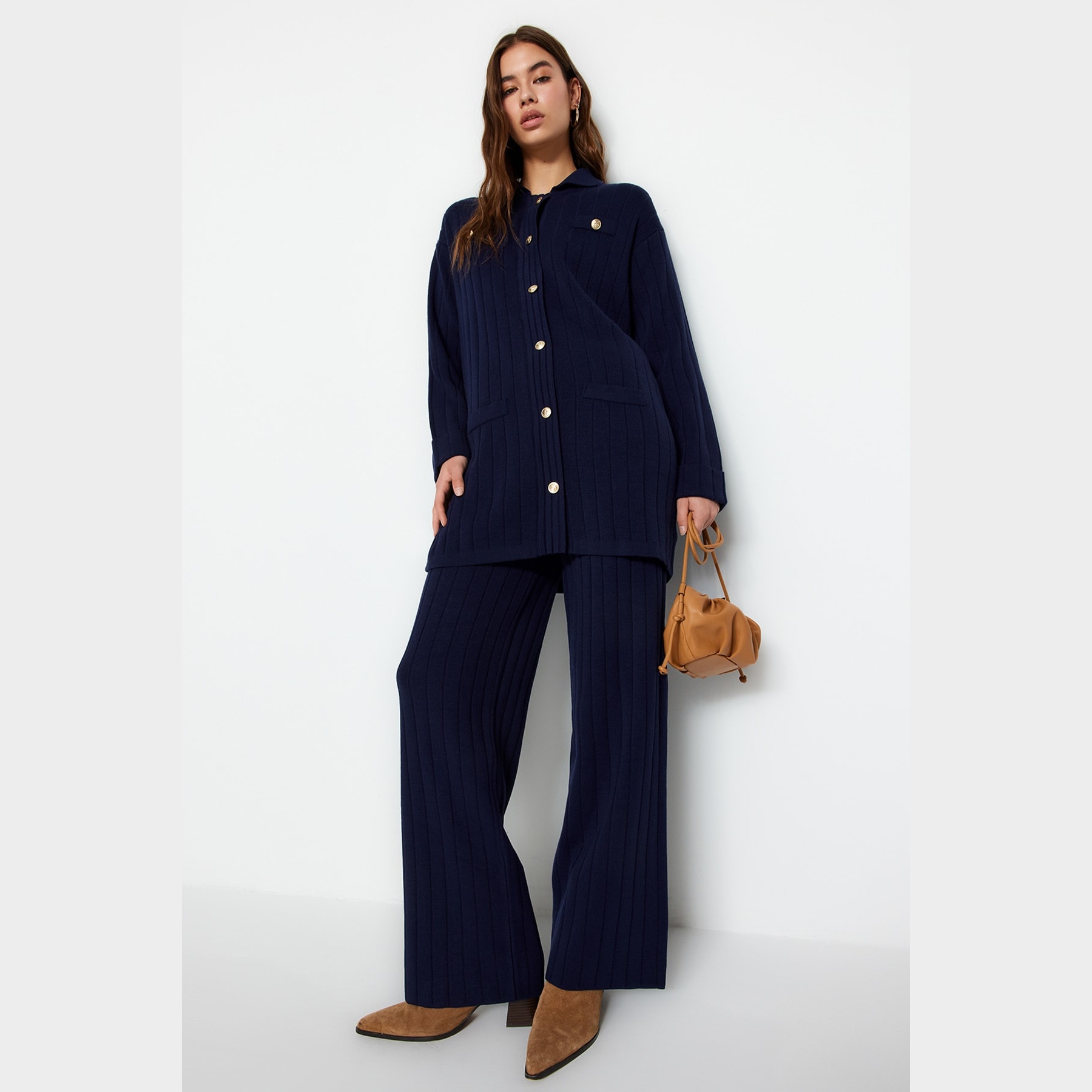 طقم أنيق بلون كحلي موحد بقماش مضلع (ريب) من مجموعة Trendyolmilla Modest – لأناقة خريفية دافئة ومحتشمة بلمسة كلاسيكية، يتكون من كنزة طويلة بياقة بولو وأزرار أمامية مع بنطال واسع بخصر مرتفع، مصنوع من خامة تريكو مضلع (ريبانا/كاشكورس) بتركيبة 100% أكريليك، ما يجعله مثاليًا للأجواء المعتدلة والإطلالات اليومية المحتشمة.