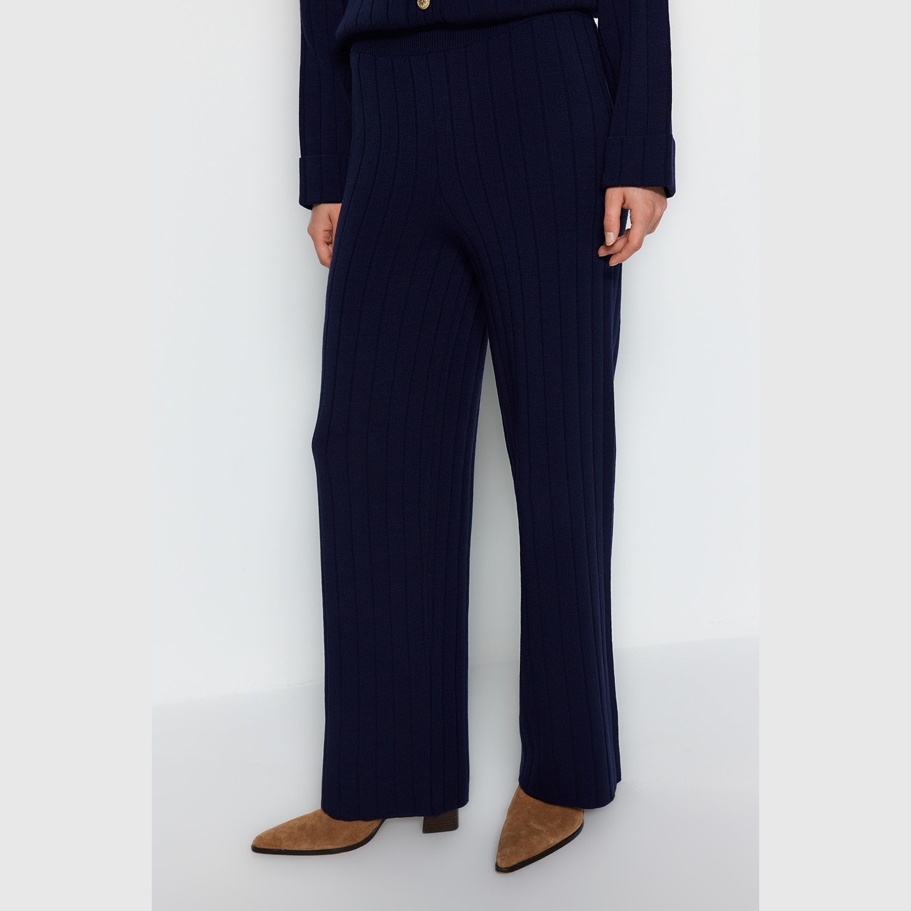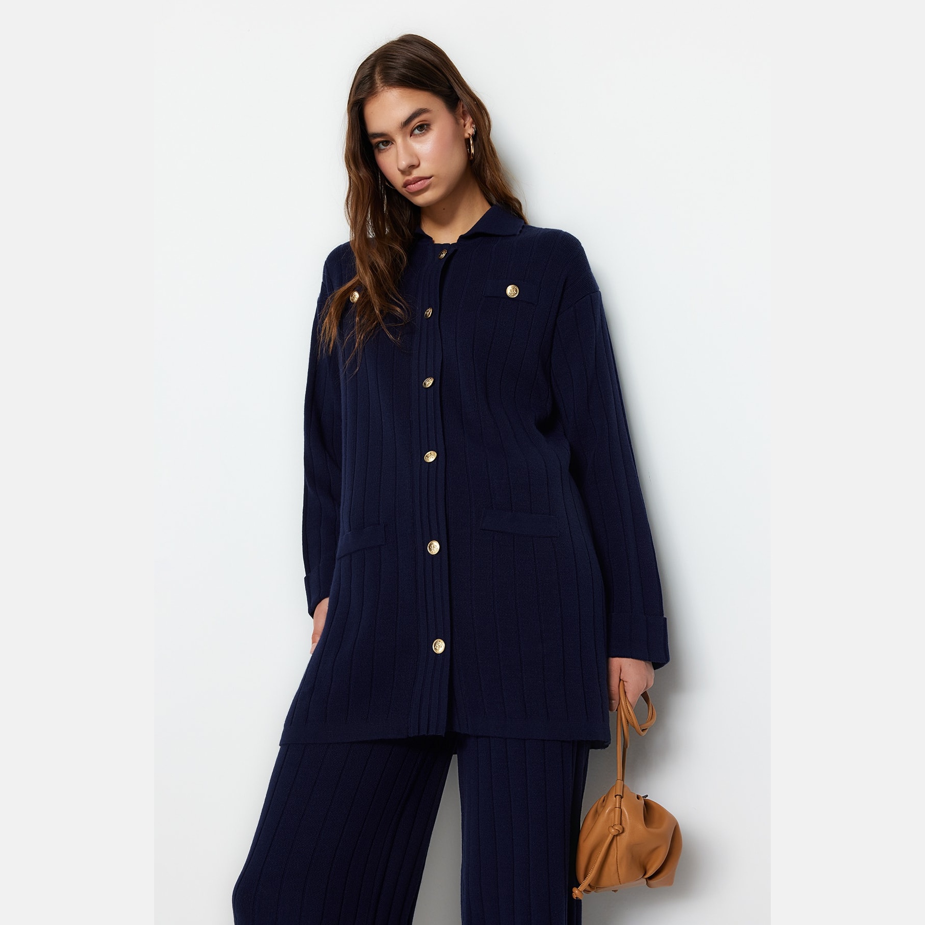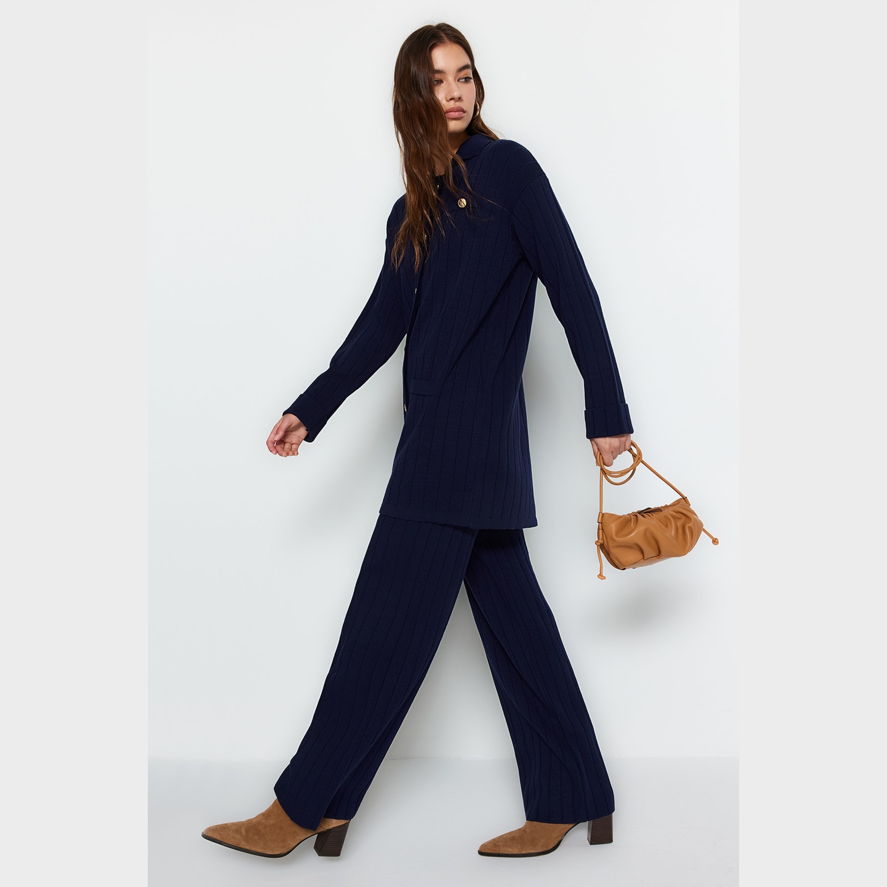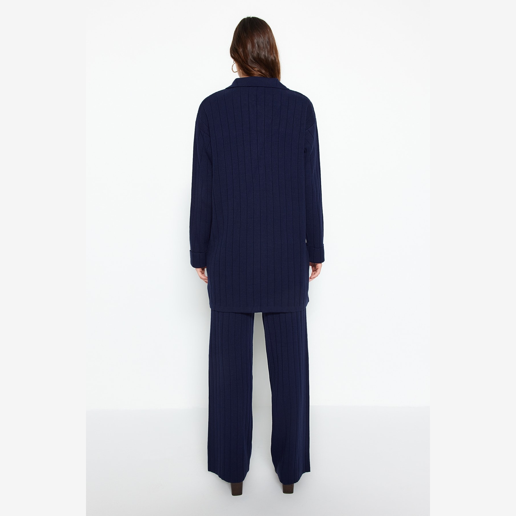 طقم أنيق بلون كحلي موحد بقماش مضلع (ريب) من مجموعة Trendyolmilla Modest – لأناقة خريفية دافئة ومحتشمة بلمسة كلاسيكية، يتكون من كنزة طويلة بياقة بولو وأزرار أمامية مع بنطال واسع بخصر مرتفع، مصنوع من خامة تريكو مضلع (ريبانا/كاشكورس) بتركيبة 100% أكريليك، ما يجعله مثاليًا للأجواء المعتدلة والإطلالات اليومية المحتشمة.
