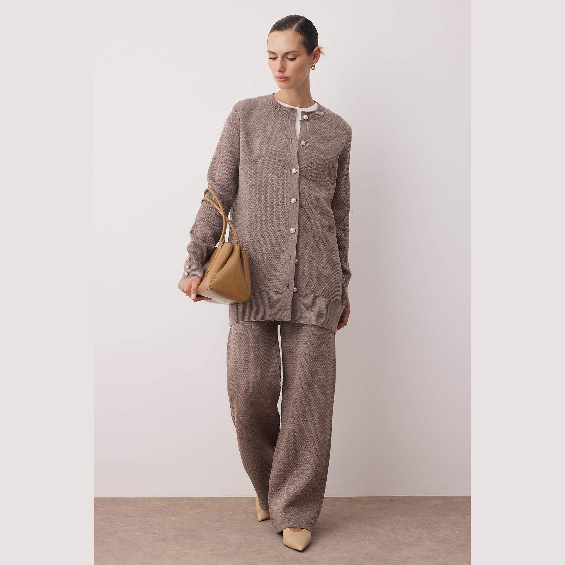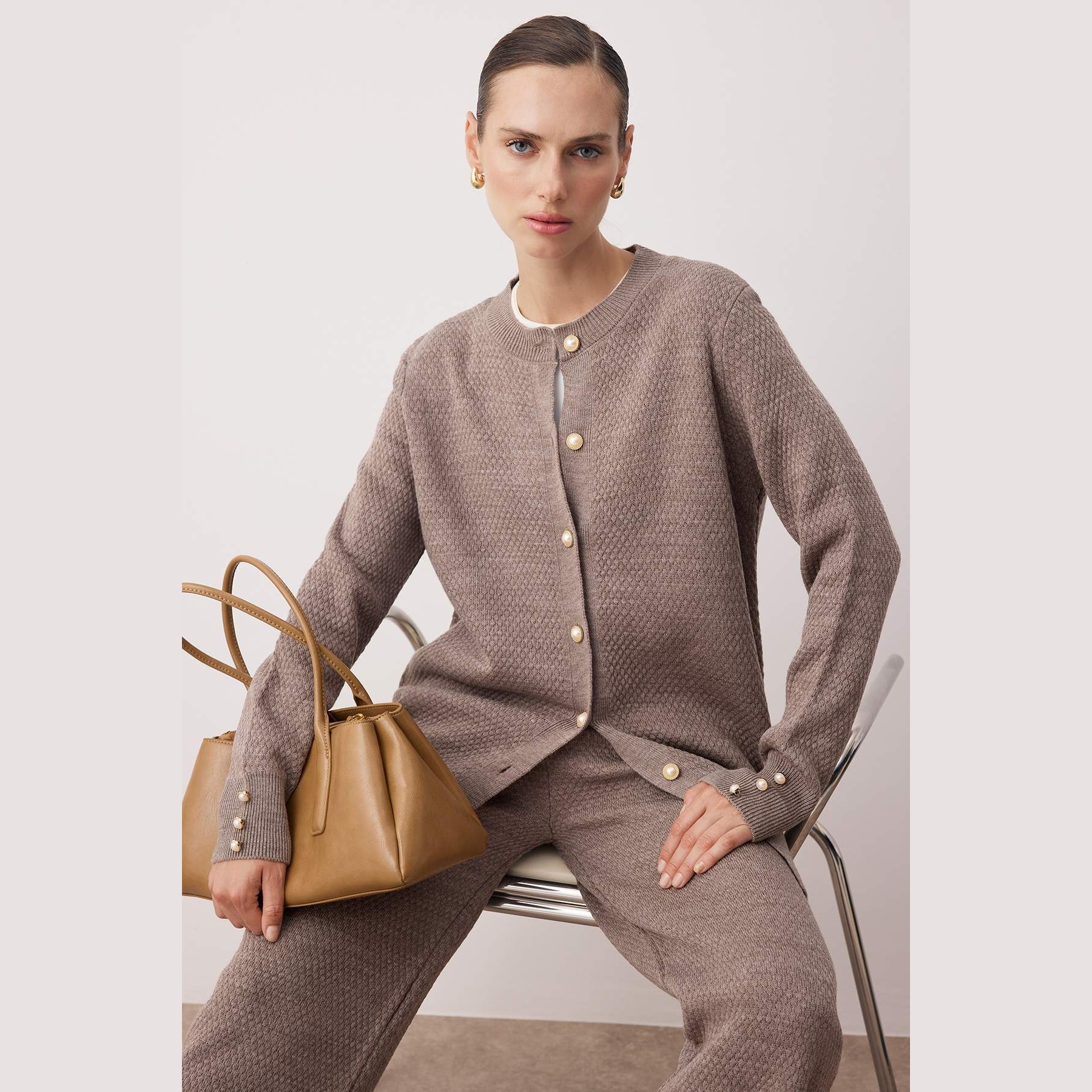 طقم نسائي مكون من كنزة وبنطال – بيج مزين بأزرار لؤلؤية (قماش تريكو، تصميم محتشم)