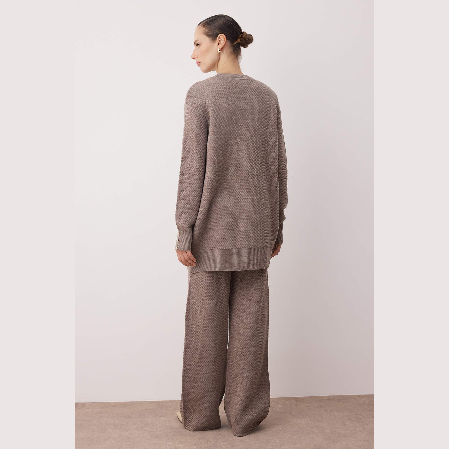 طقم أنيق بلون بيج فاتح (فيزون) من مجموعة Trendyolmilla Modest – لأناقة شتوية ناعمة ومحتشمة بلمسة أنثوية راقية، يتكون من كنزة طويلة مزينة بأزرار لؤلؤية وياقة دائرية مع بنطال واسع بخصر مرتفع وقصة مستقيمة، مصنوع من خامة تريكو مزدوجة الطبقة بتركيبة 100% أكريليك، ما يجعله مثاليًا للأجواء الباردة والإطلالات اليومية المحتشمة.