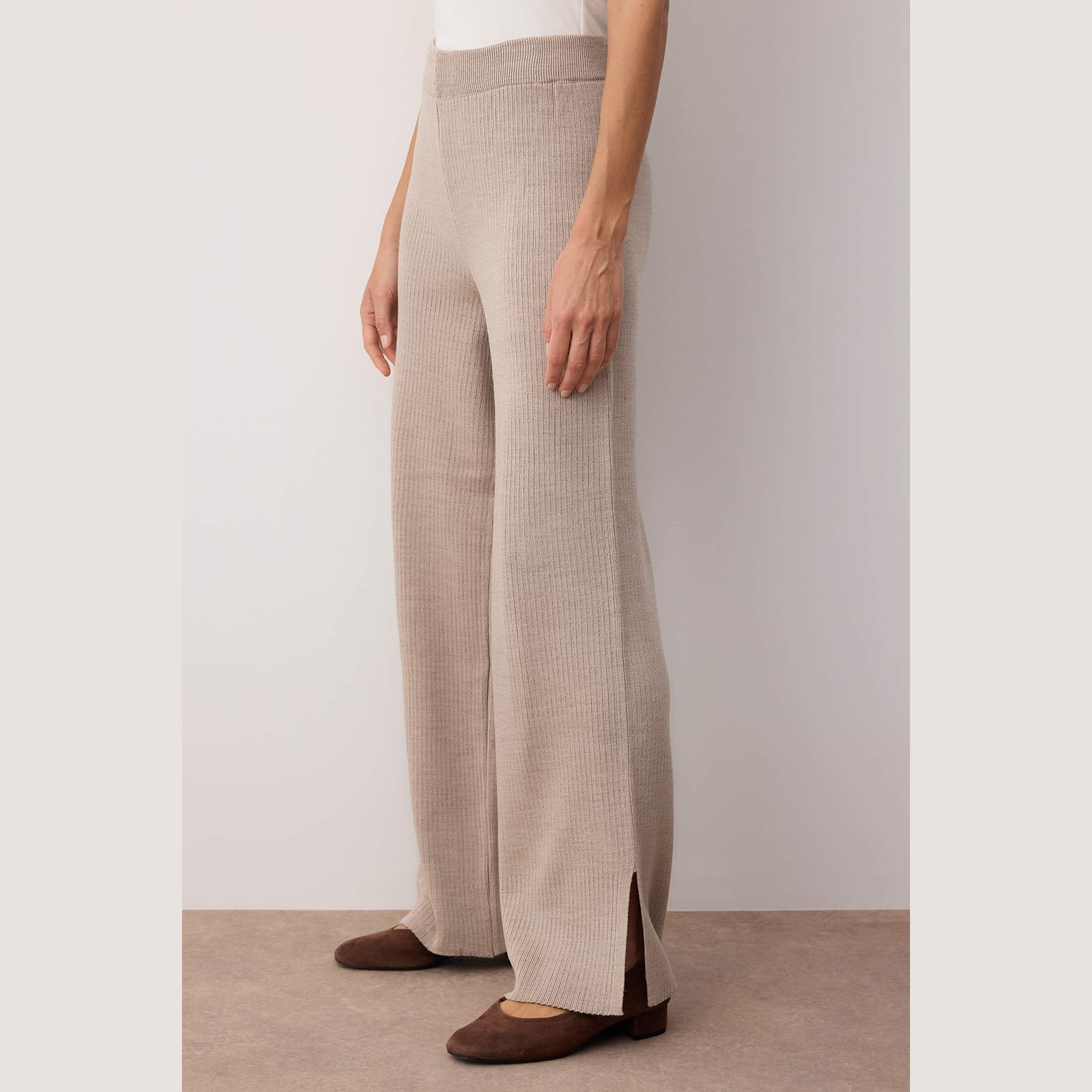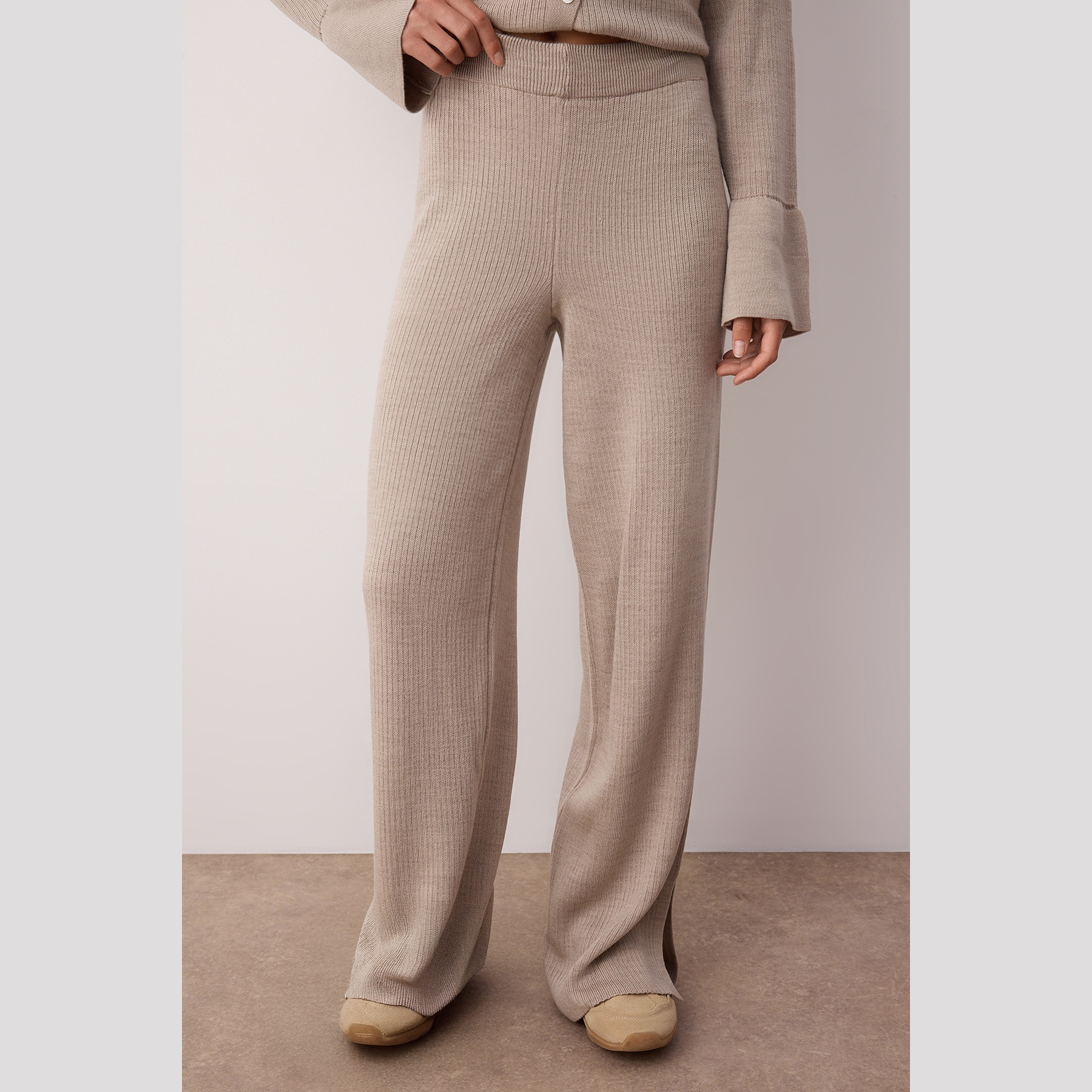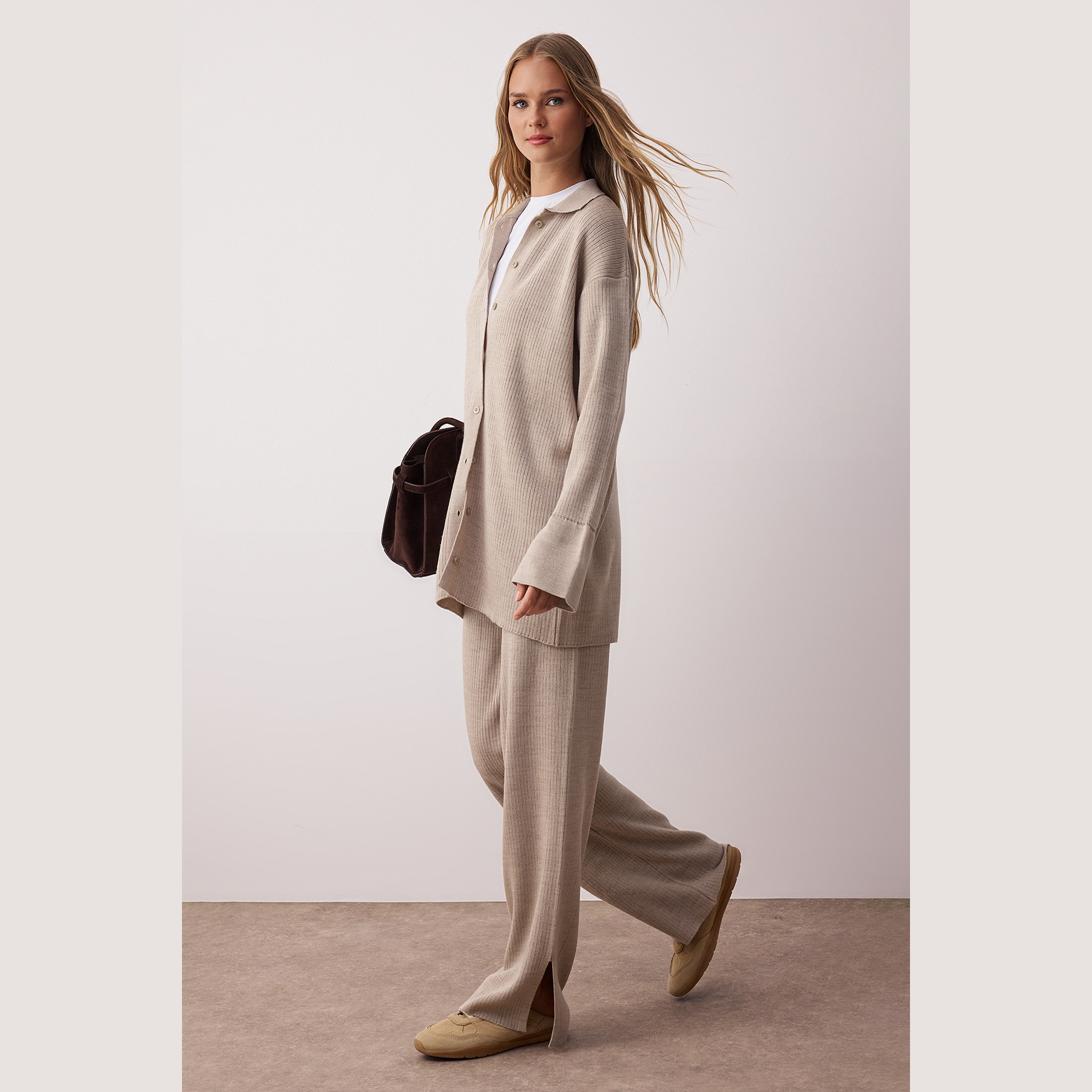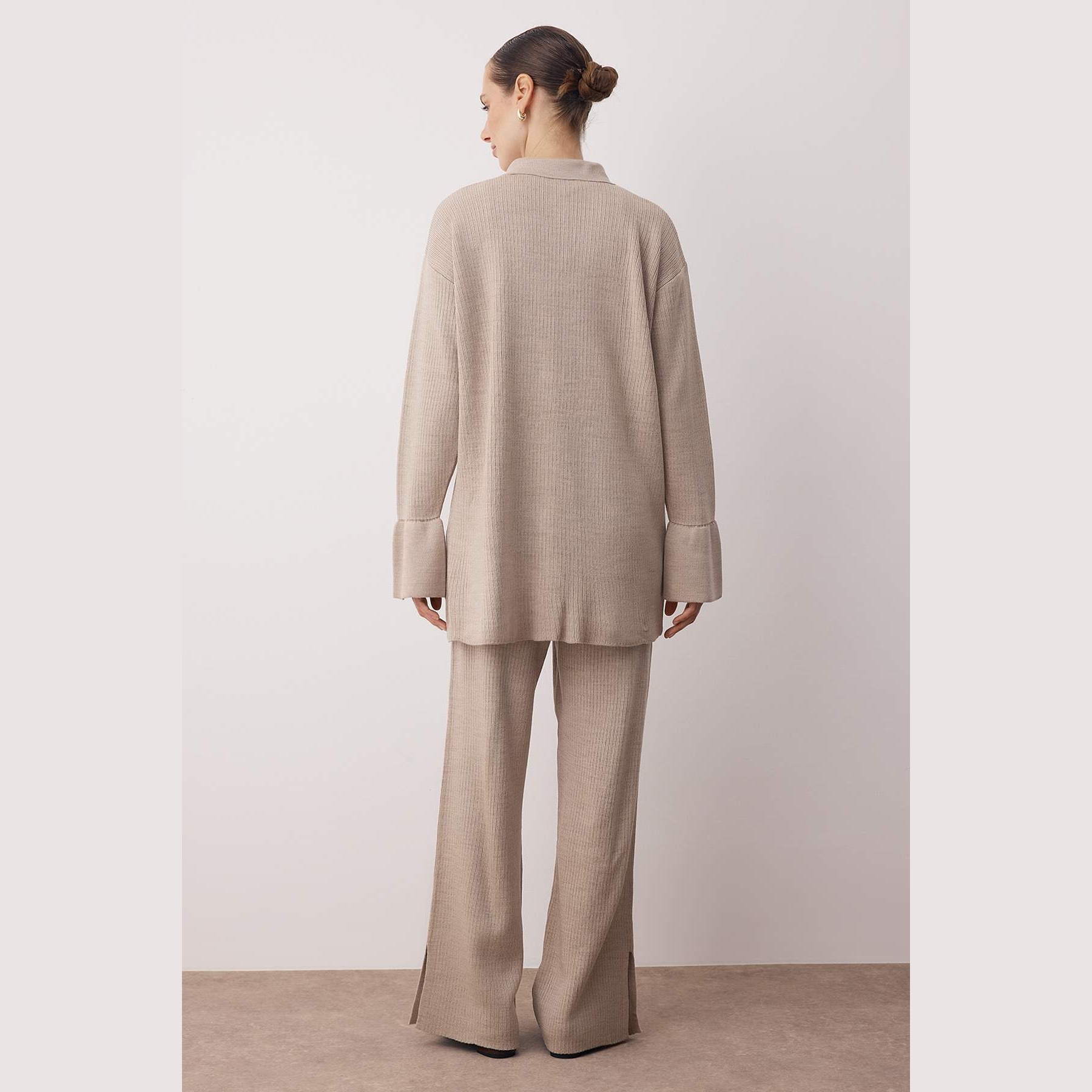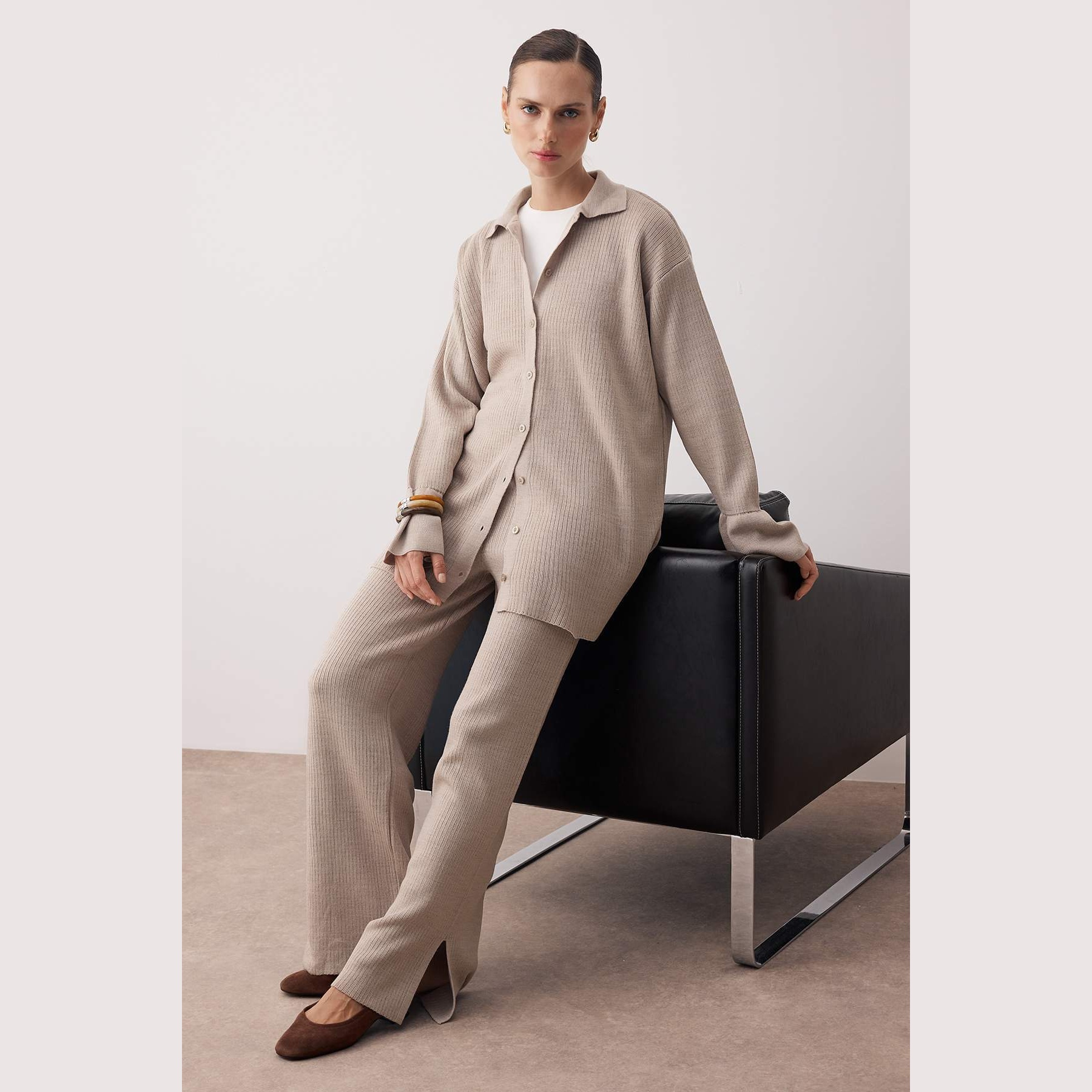 طقم نسائي مكون من كنزة وبنطال – بيج مع شق جانبي (قماش تريكو، تصميم محتشم)
