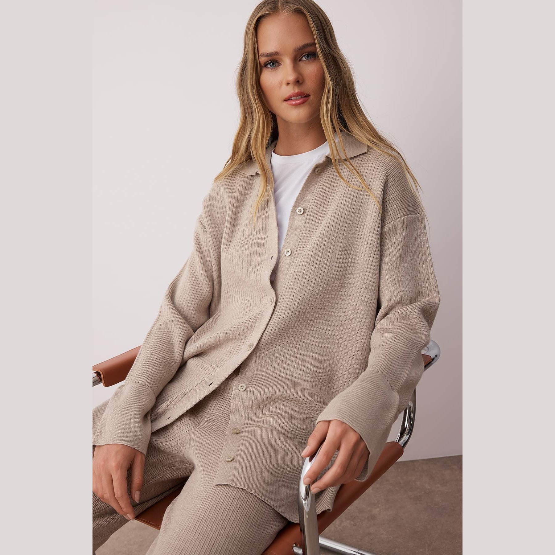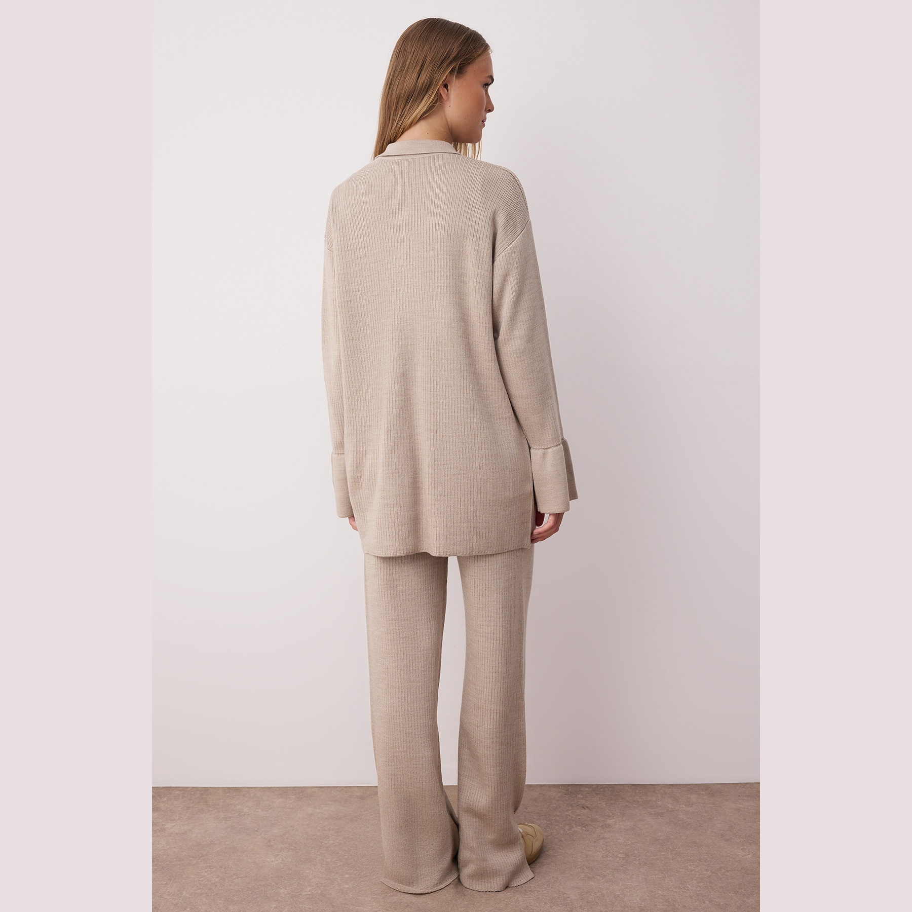 طقم أنيق بلون بيج (طاش) من مجموعة Trendyolmilla Modest – لأناقة شتوية ناعمة ومحتشمة بلمسة عصرية، يتكون من كنزة طويلة بشق جانبي وأزرار أمامية وياقة بولو مع بنطال واسع بخصر مرتفع وقصة مستقيمة، مصنوع بالكامل من خامة تريكو ناعمة بتركيبة 100% أكريليك، ما يجعله مثاليًا للأجواء الباردة والإطلالات اليومية المحتشمة.