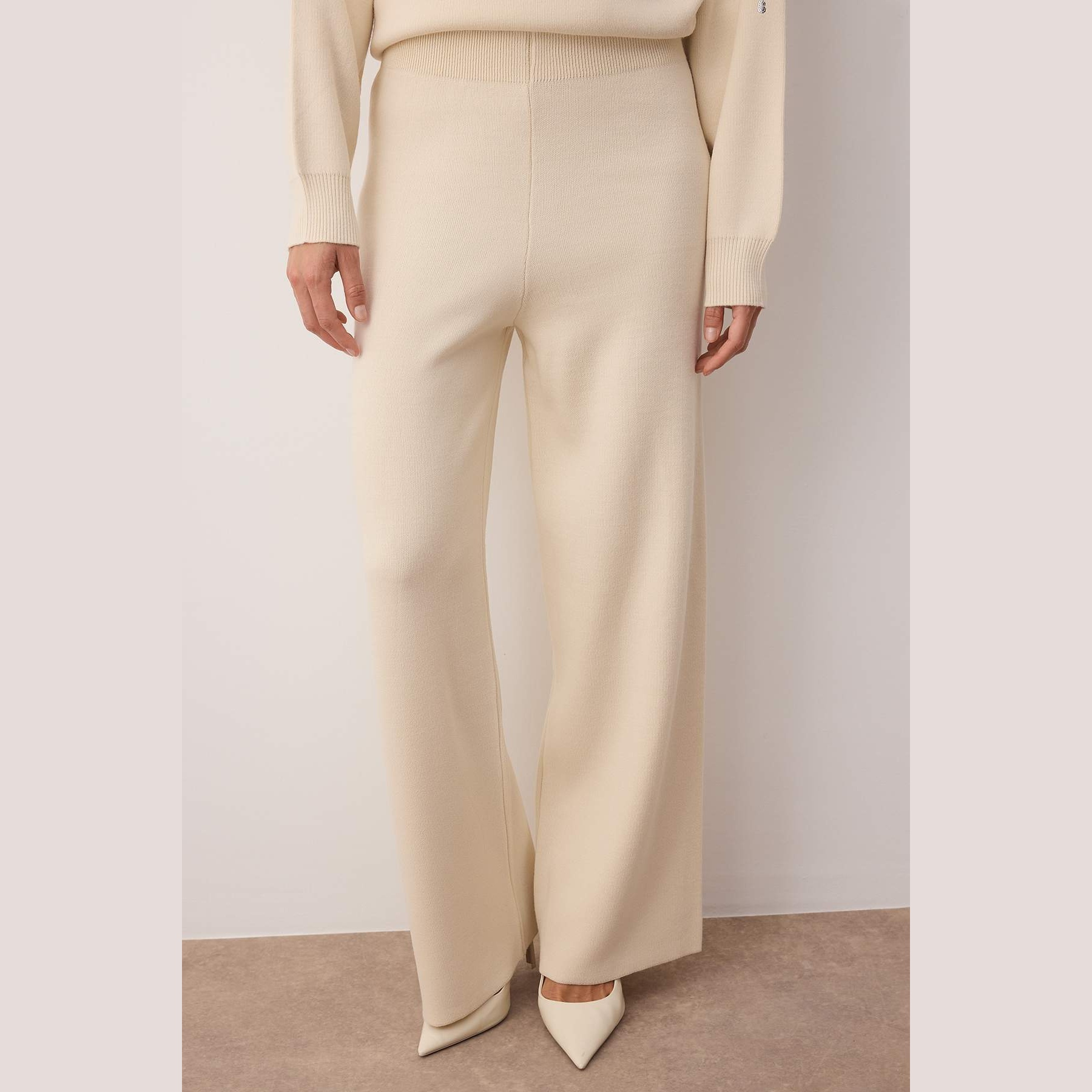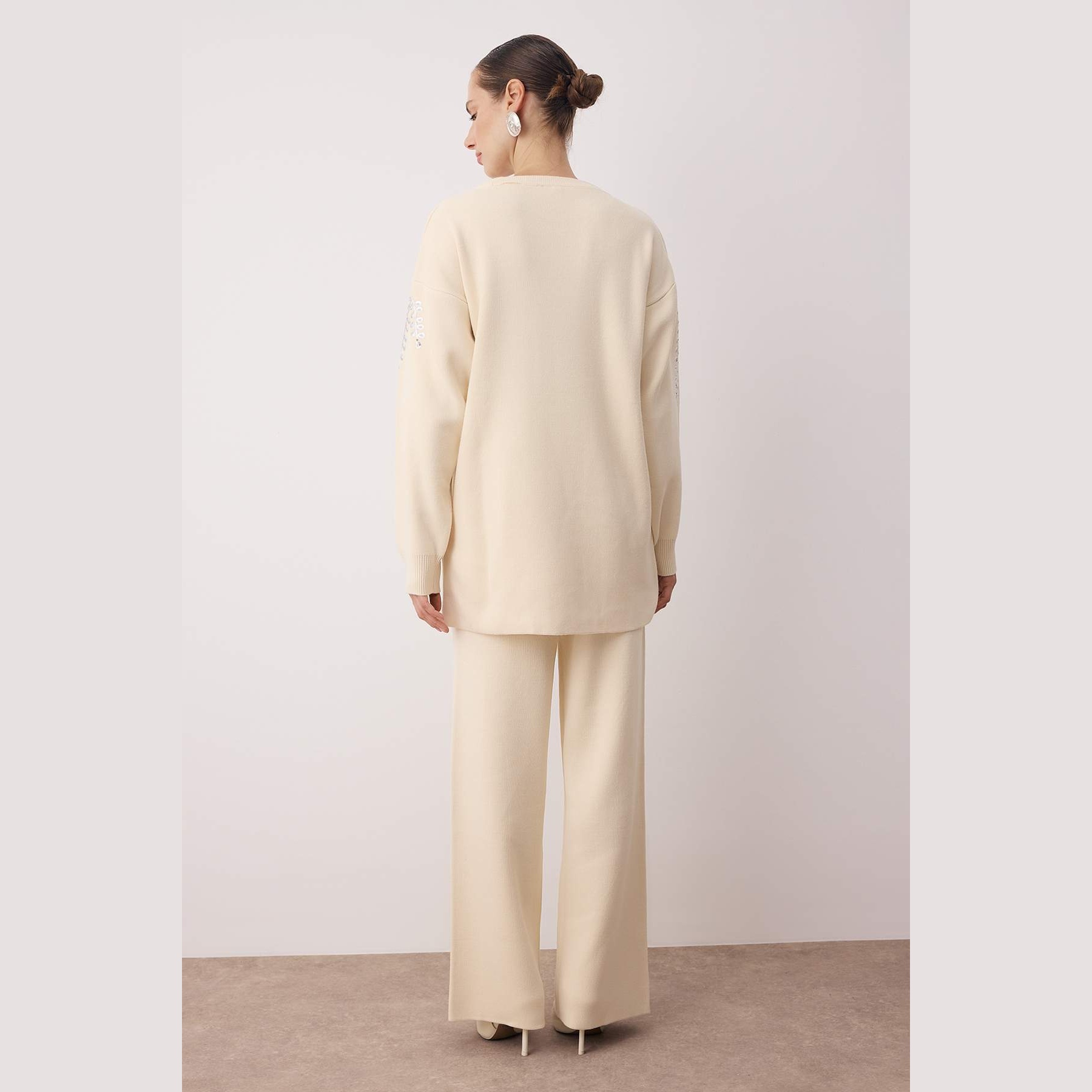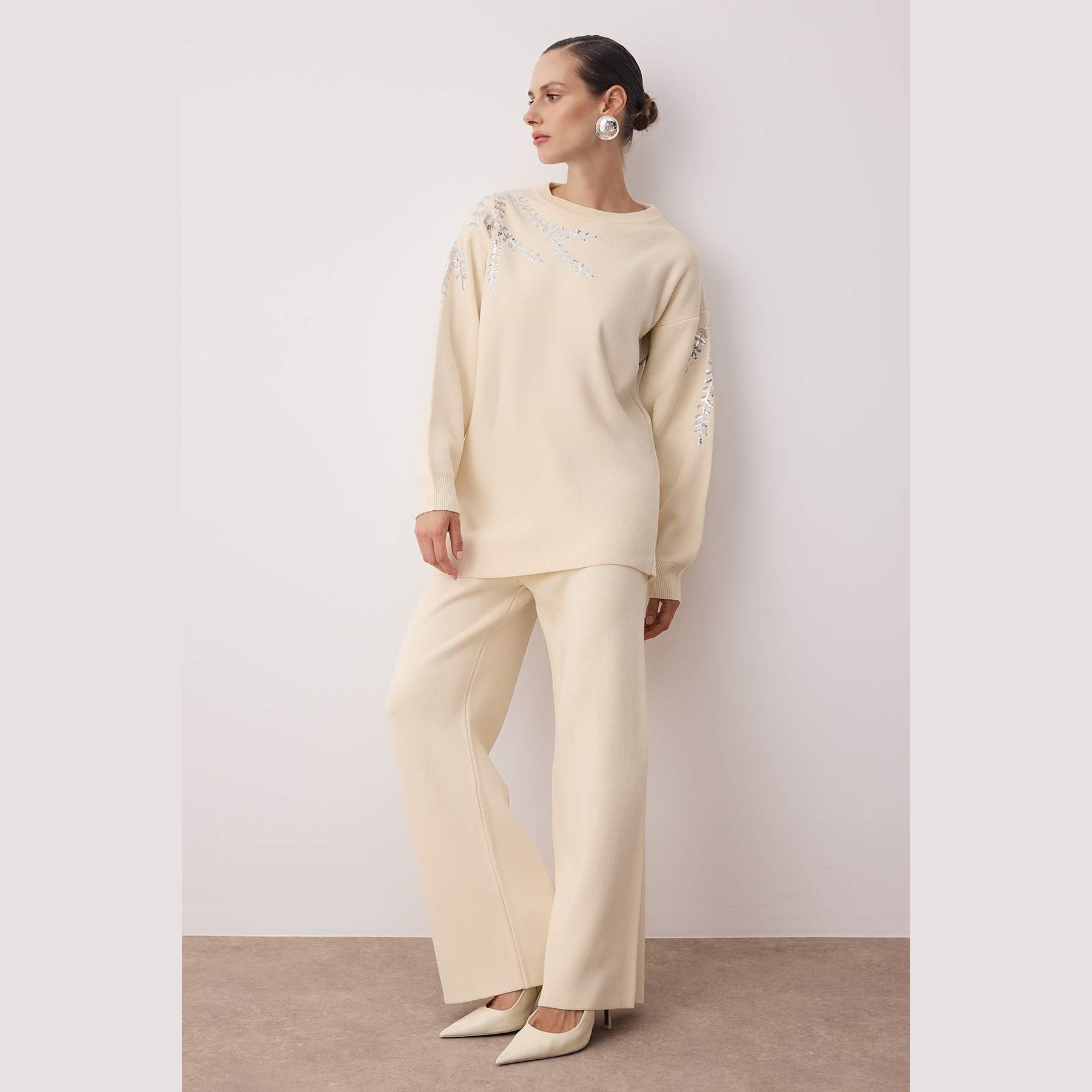 طقم نسائي مكون من كنزة وبنطال – بيج مزين بتطريز باييت لامع (قماش تريكو، تصميم محتشم)