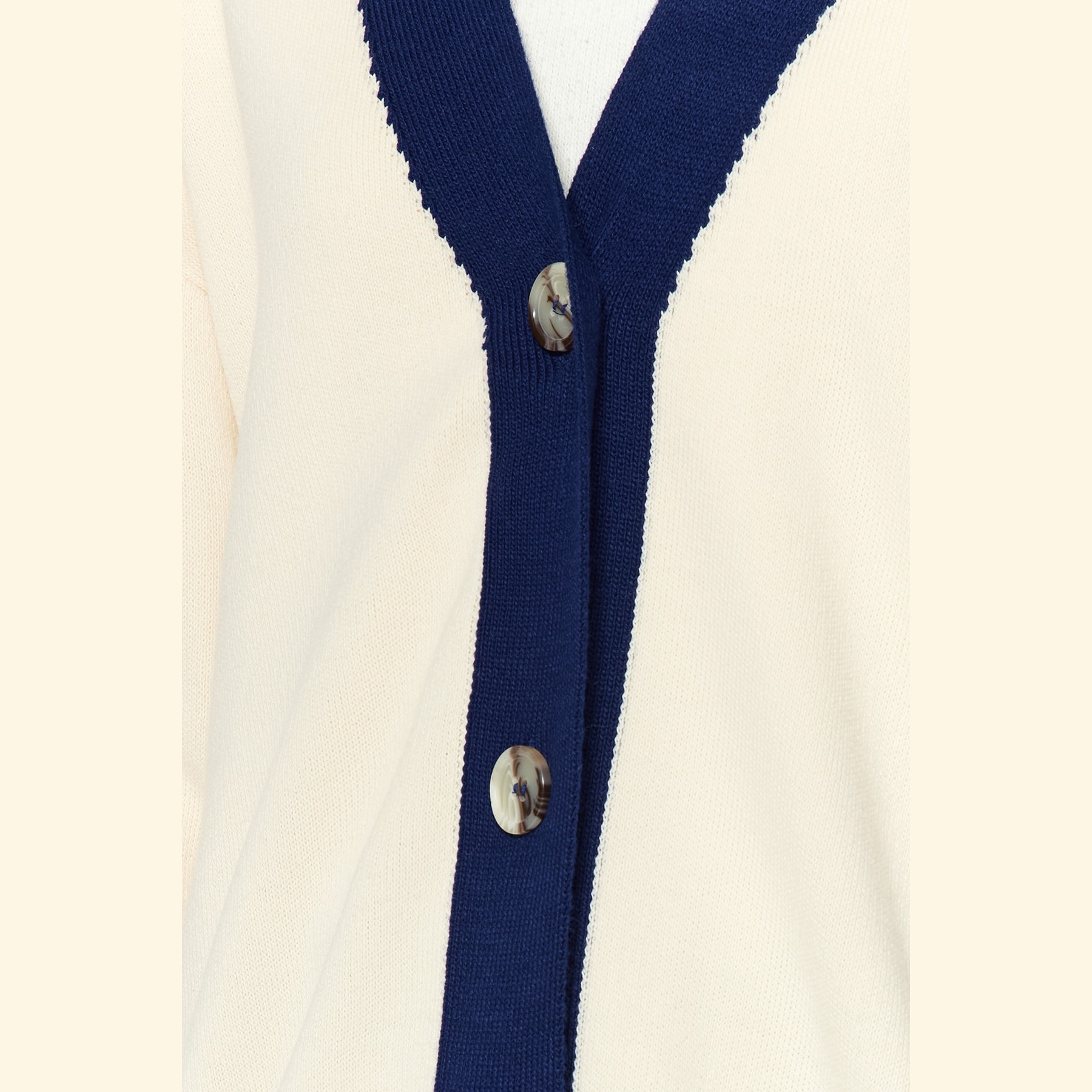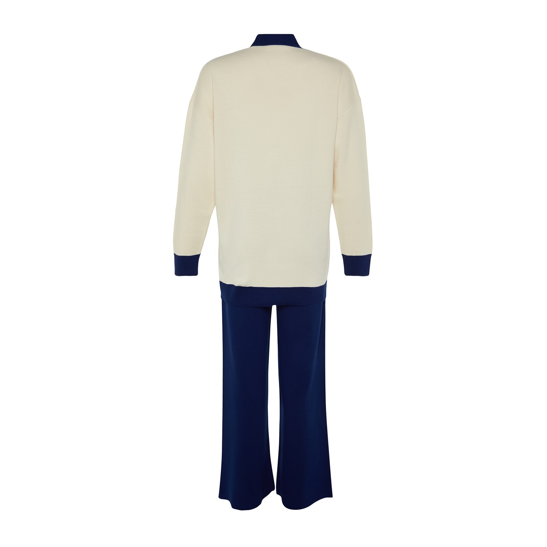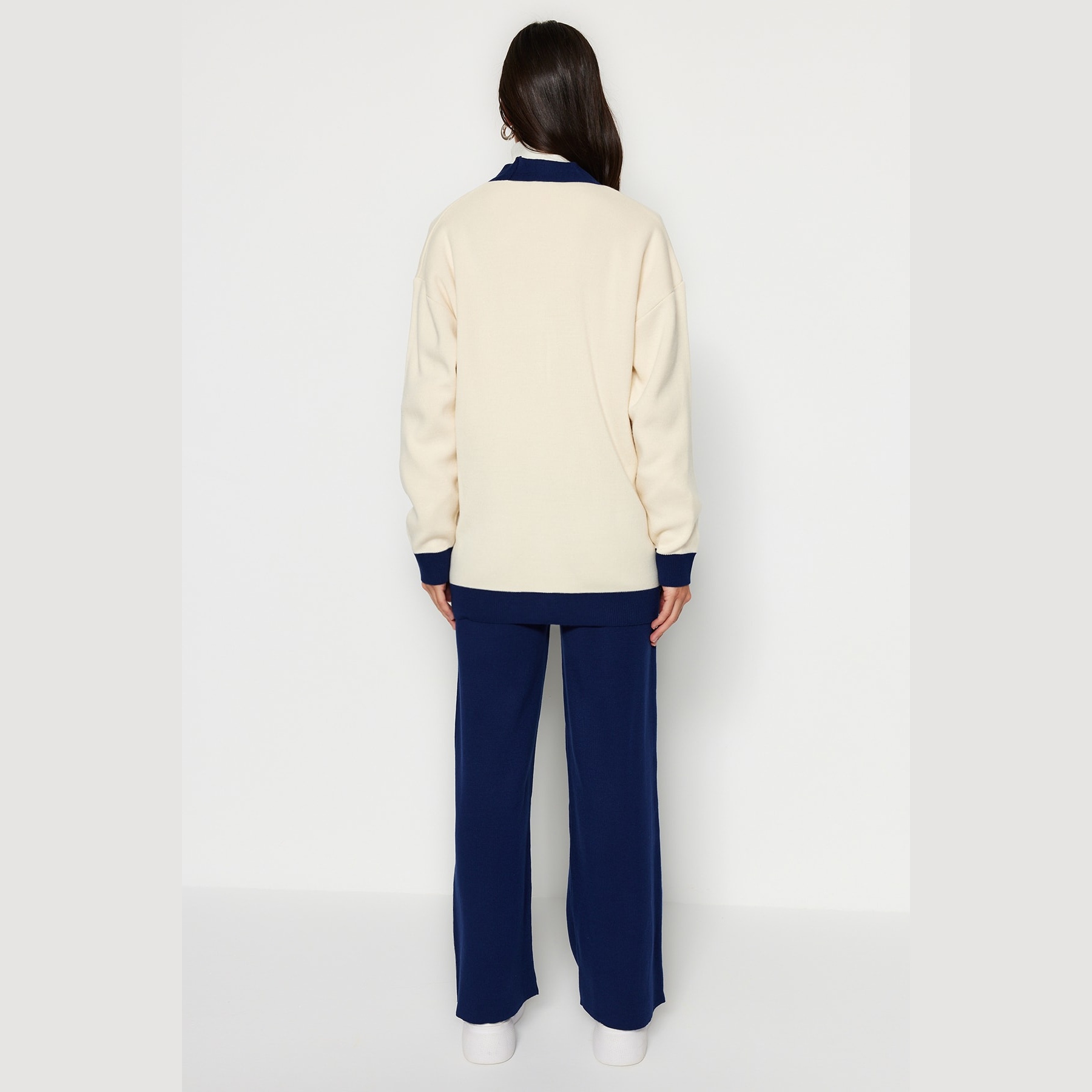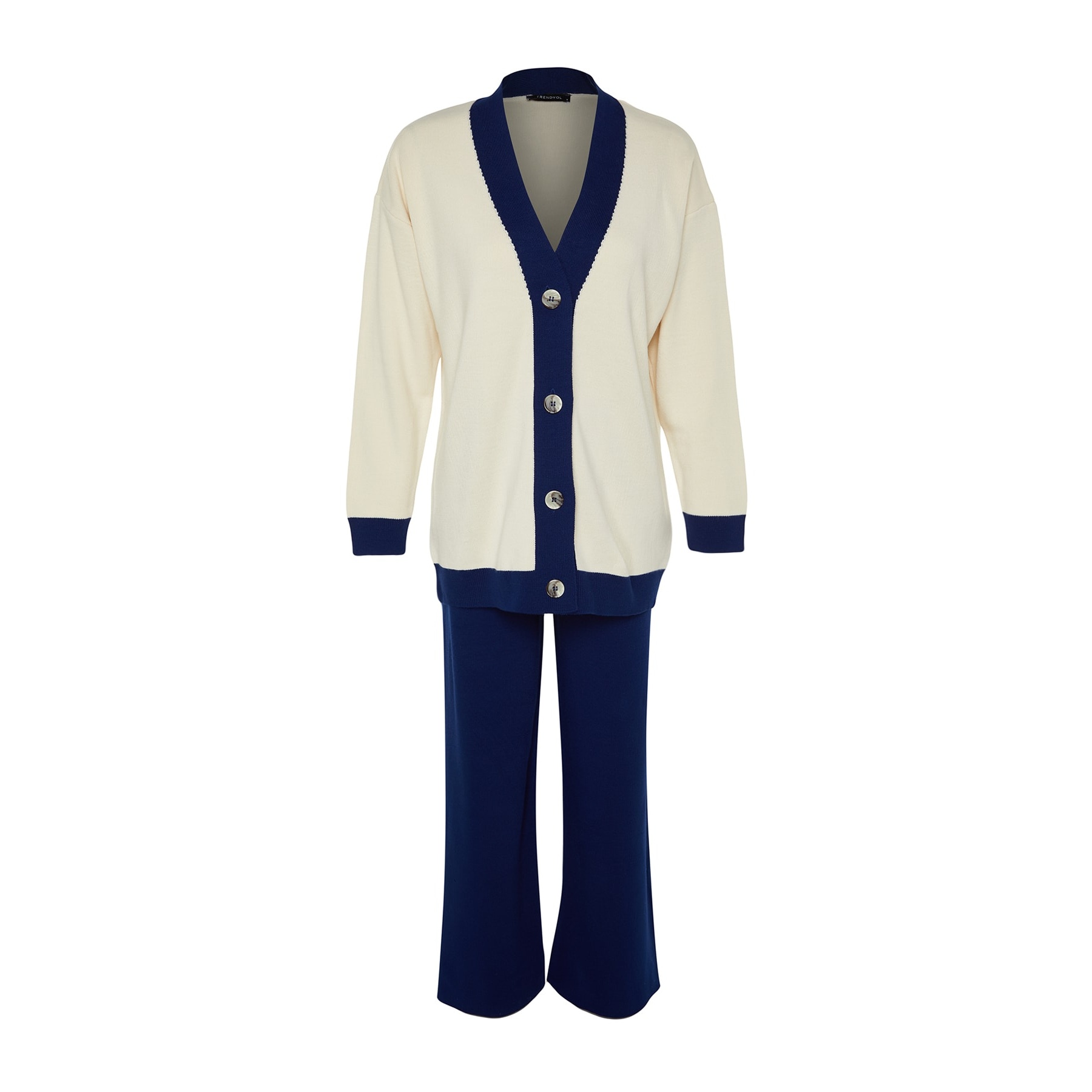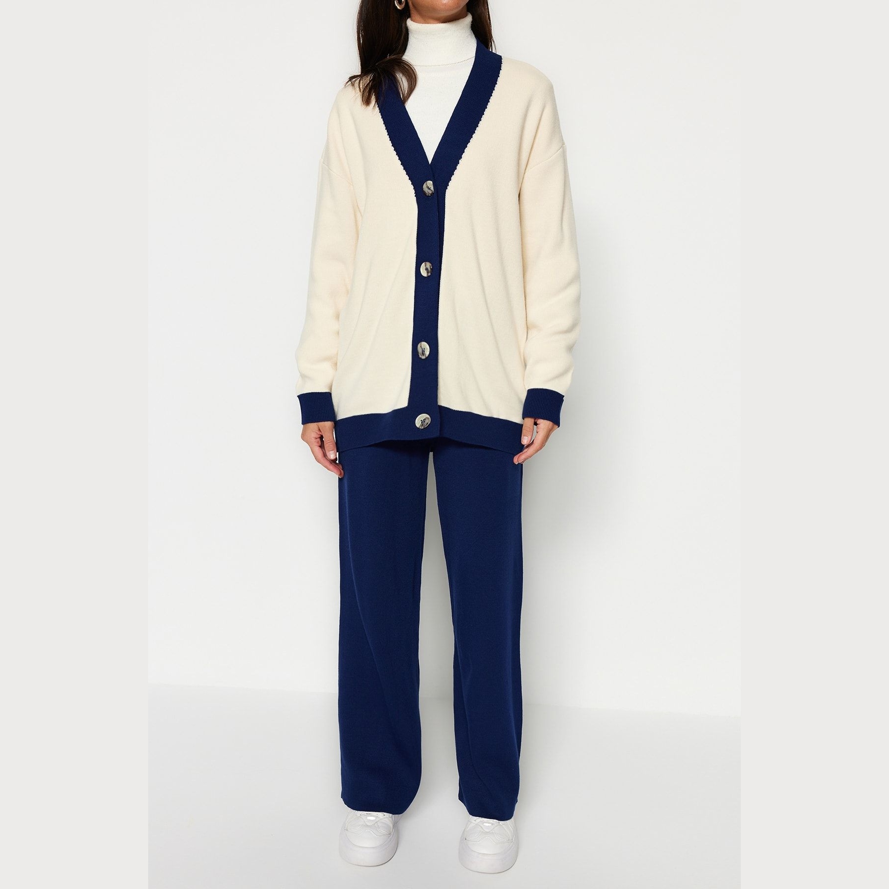 طقم أنيق بلون كحلي داكن مزين بشرائط بلون متباين من مجموعة Trendyolmilla Modest – لأناقة شتوية مريحة ومحتشمة بلمسة تصميمية عصرية، يتكون من كنزة طويلة بأزرار أمامية وياقة V مع بنطال واسع بخصر مرتفع وقصة مستقيمة، مصنوع من خامة تريكو ناعمة مزدوجة الطبقة بتركيبة 100% أكريليك، ما يجعله مثاليًا للأجواء الباردة والإطلالات اليومية المحتشمة.