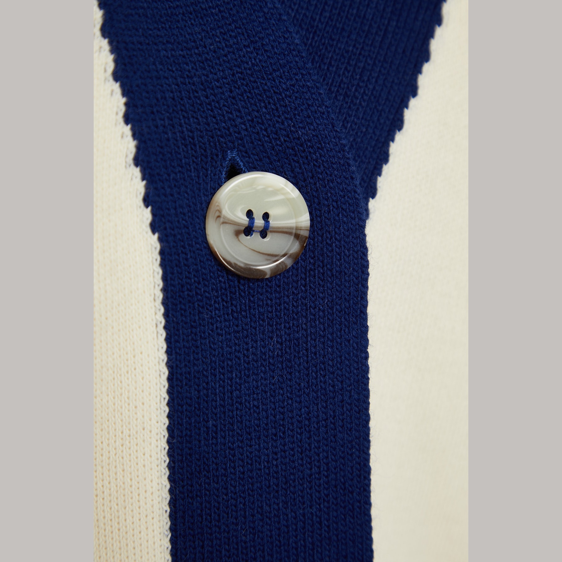 طقم نسائي مكون من كنزة وبنطال – كحلي مزين بشرائط متباينة (قماش تريكو، تصميم محتشم)